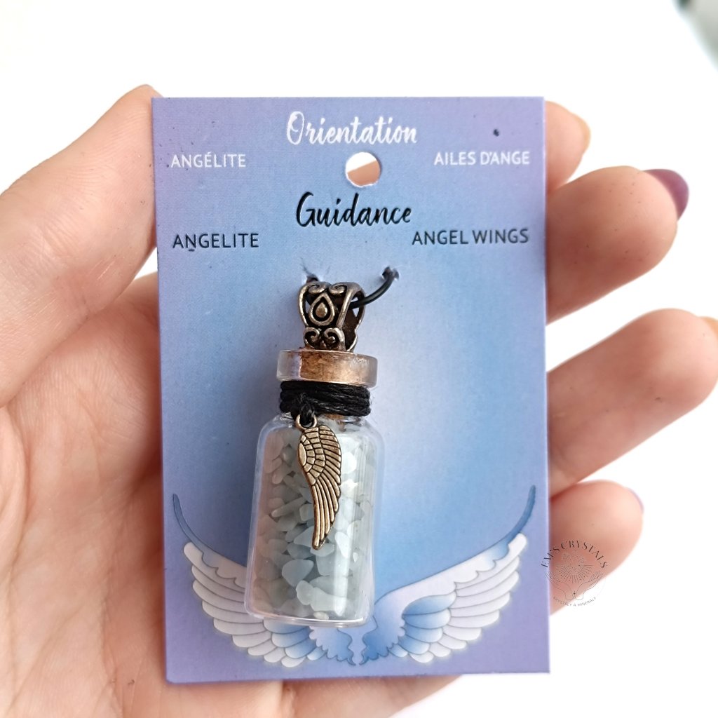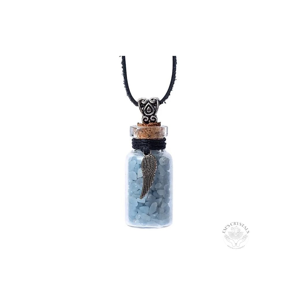 Přívěsek lahvička s minerály - angelit, na kožené šňůrce.