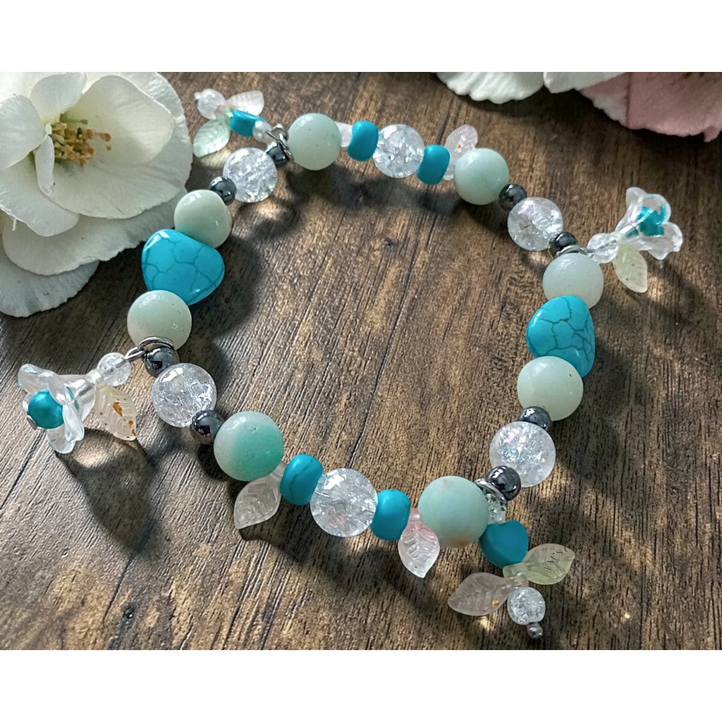 Dominantním prvkem jsou dvě tyrkenitová srdíčka, která náramku dodávají něžný a romantický charakter. Visící kvítky s jemnými světlými lístečky připomínají drobné květy v pohádkové zahradě pod modrou oblohou. Náramek působí lehce, hravě a kouzelně – jako malý kousek vílího světa.