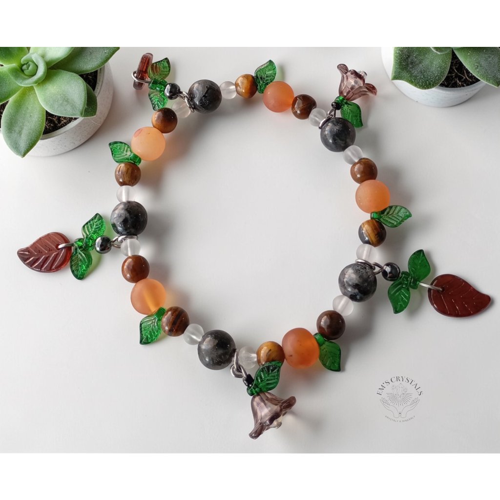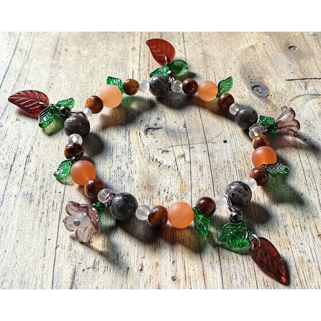 Náramek inspirovaný barvami lesa a teplem země. Kombinuje přírodní kameny karneol, tygří oko, larvikit a křišťál, které spolu vytvářejí harmonickou rovnováhu energie. Karneol symbolizuje životní sílu a kreativitu, tygří oko podporuje odvahu a stabilitu, larvikit je kamenem ochrany a uzemnění a křišťál přináší čistotu a zesílení energie ostatních kamenů. Jemné zelené lístky a hnědé kvítky dodávají náramku přírodní, lehce mystický vzhled připomínající lesní zahradu.