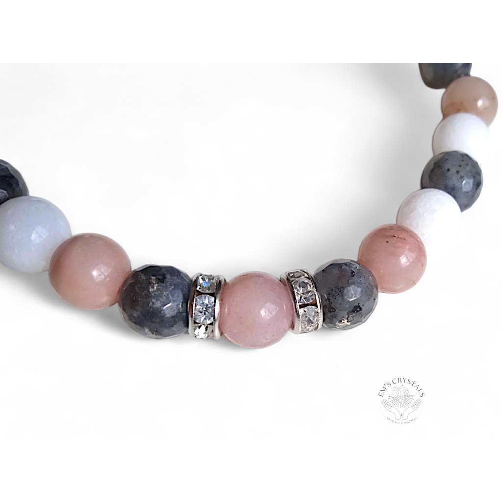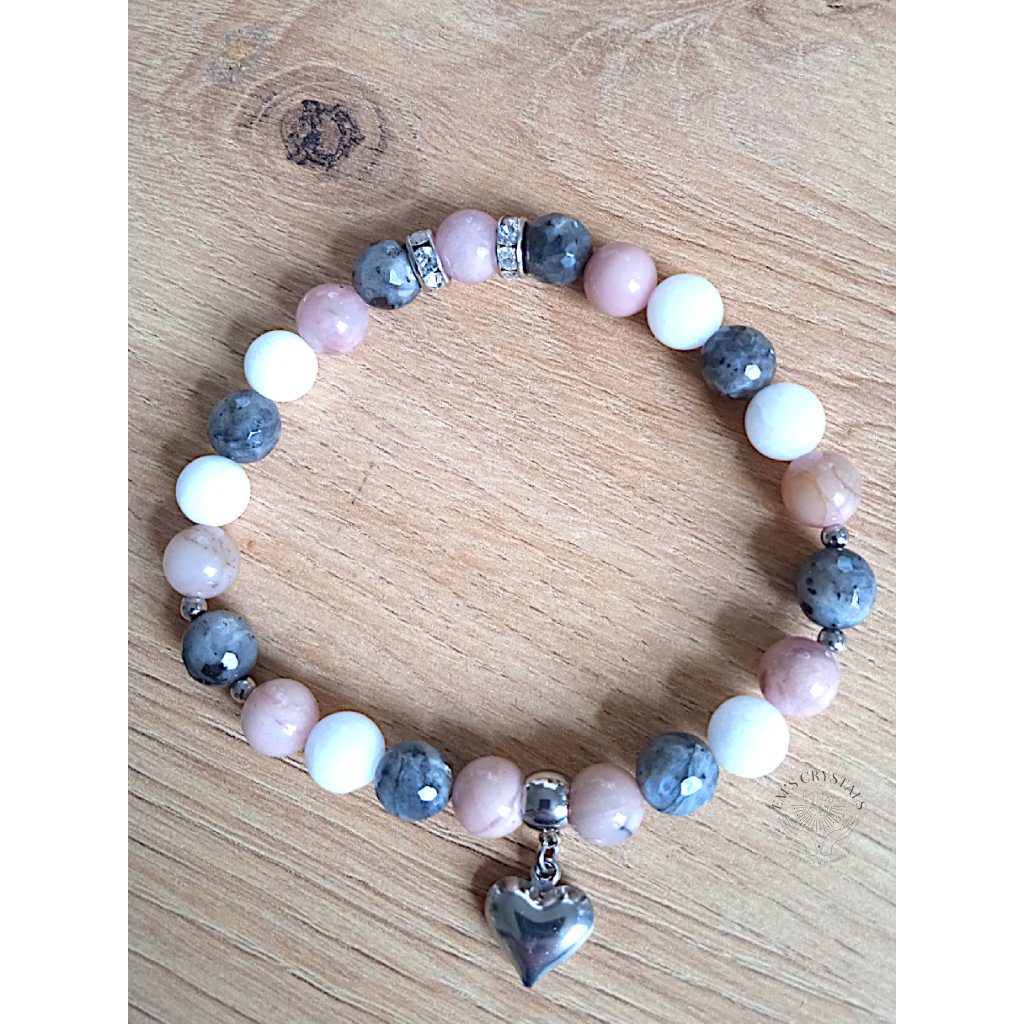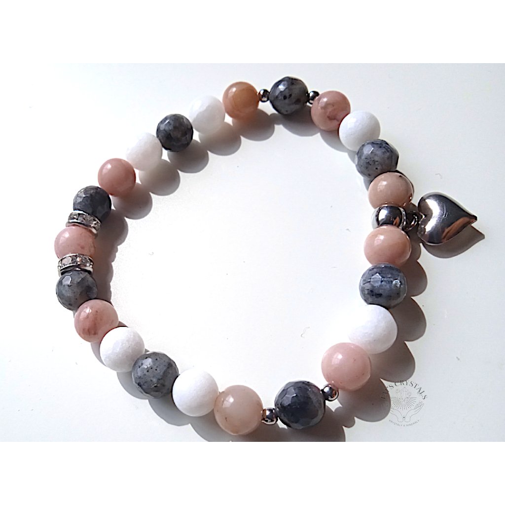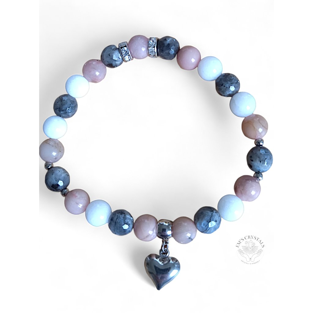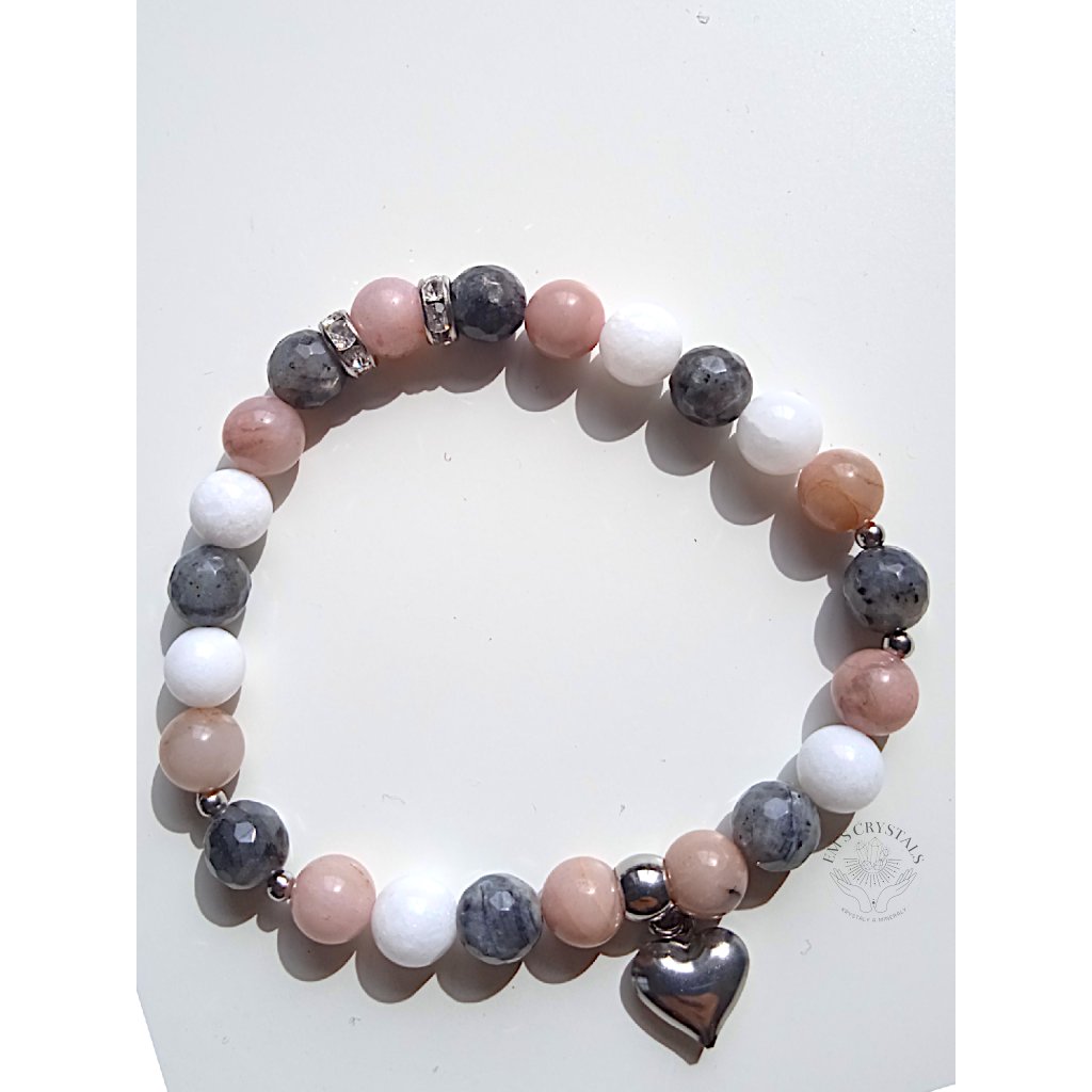 Náramek "Harmonie Srdce" spojuje sílu larvikitu, rodonitu a křišťálu s komponenty z chirurgické oceli. Larvikit přináší ochranu a podporuje duchovní vhled, rodonit podporuje lásku a emocionální uzdravení, zatímco křišťál dodává jasnost a energii. Tento náramek je dokonalým spojením přírodní krásy a emocionální rovnováhy.