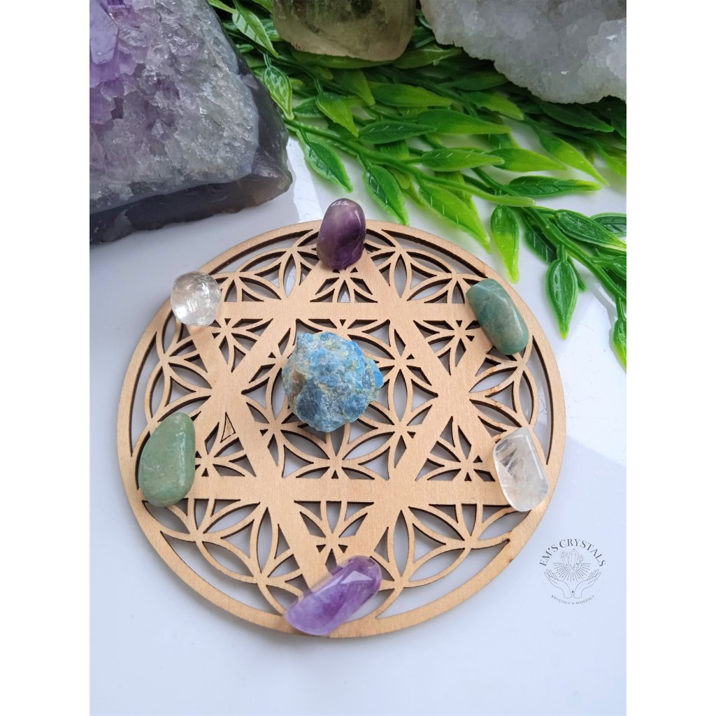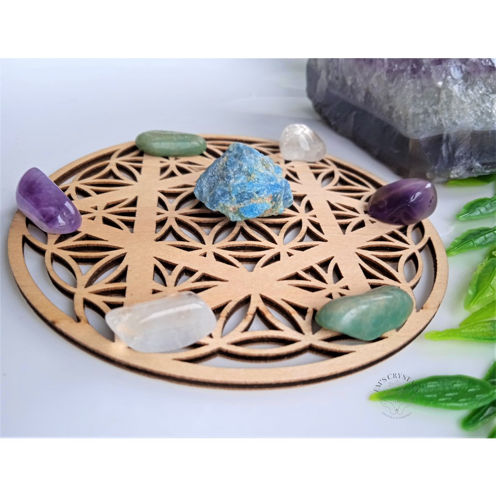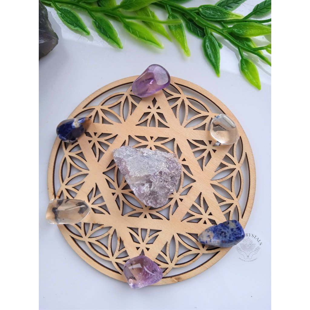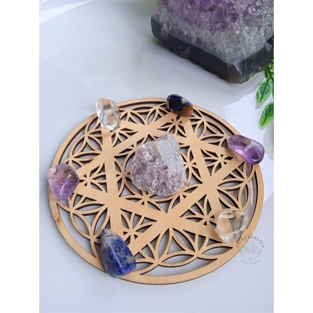 Sada obsahuje dřevěnou mřížku a 7 minerálních kamenů - surový Lepidolit nebo Apatit velikost M, a kameny velikosti S - 2x Ametyst, 2x Amazonit (nebo Sodalit), 2x Křišťál