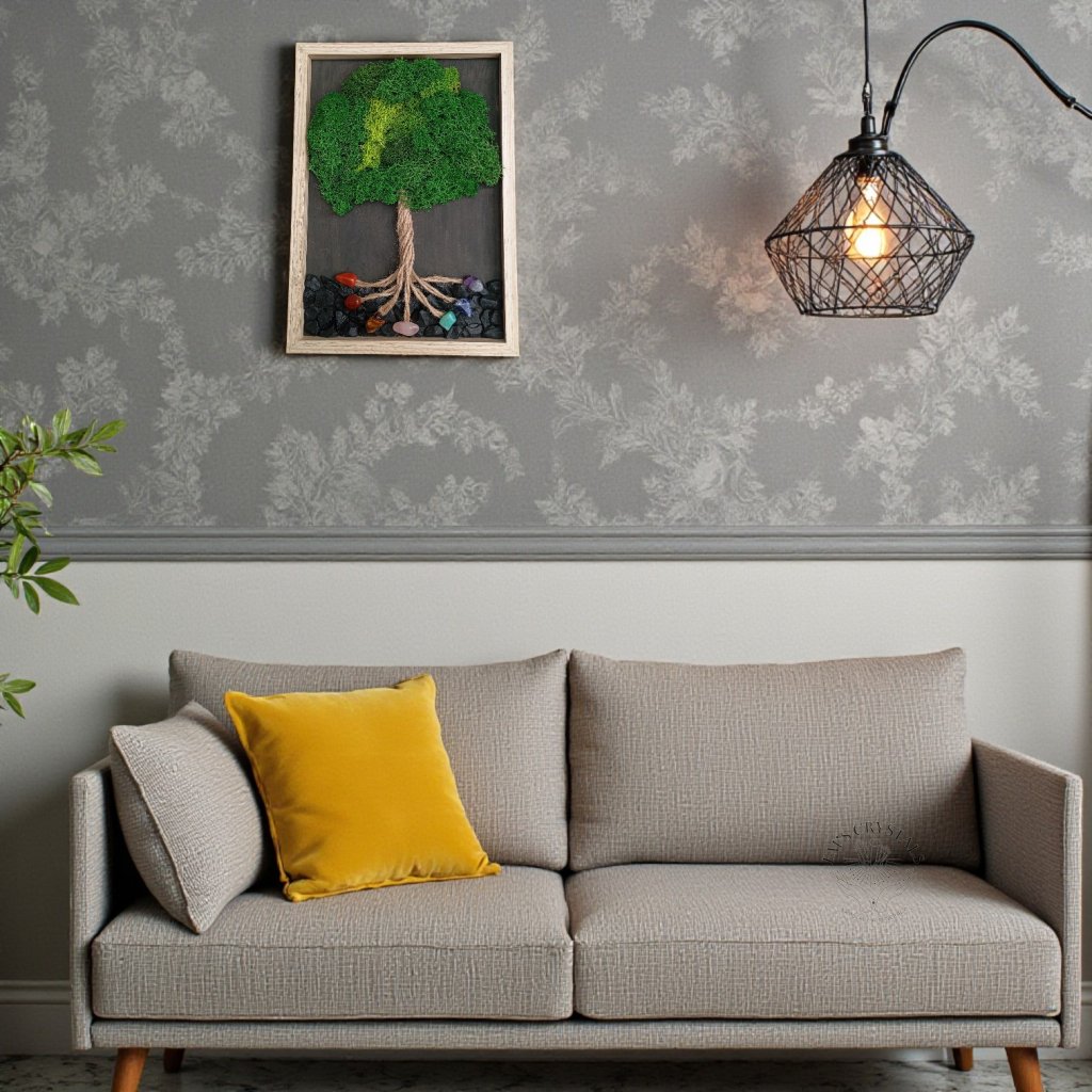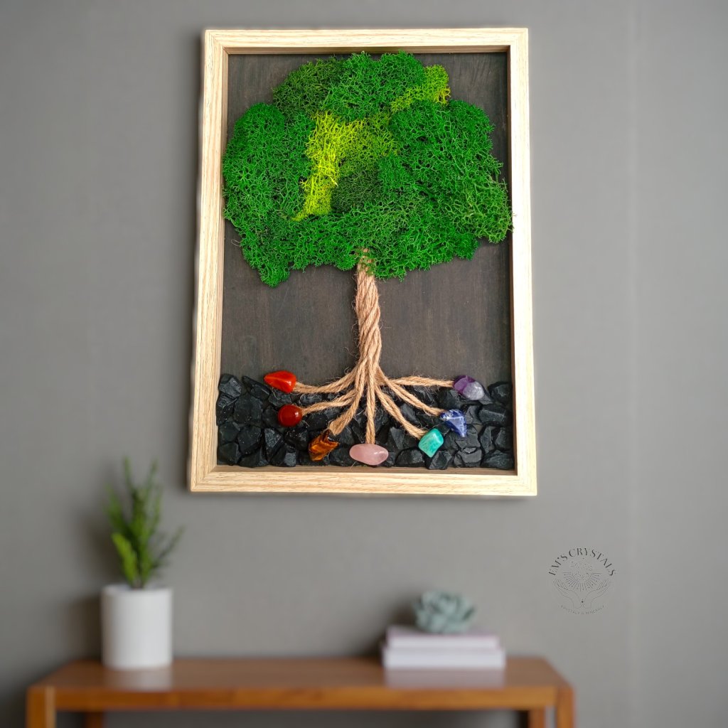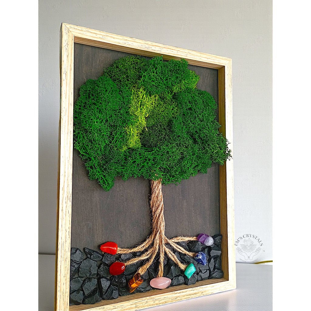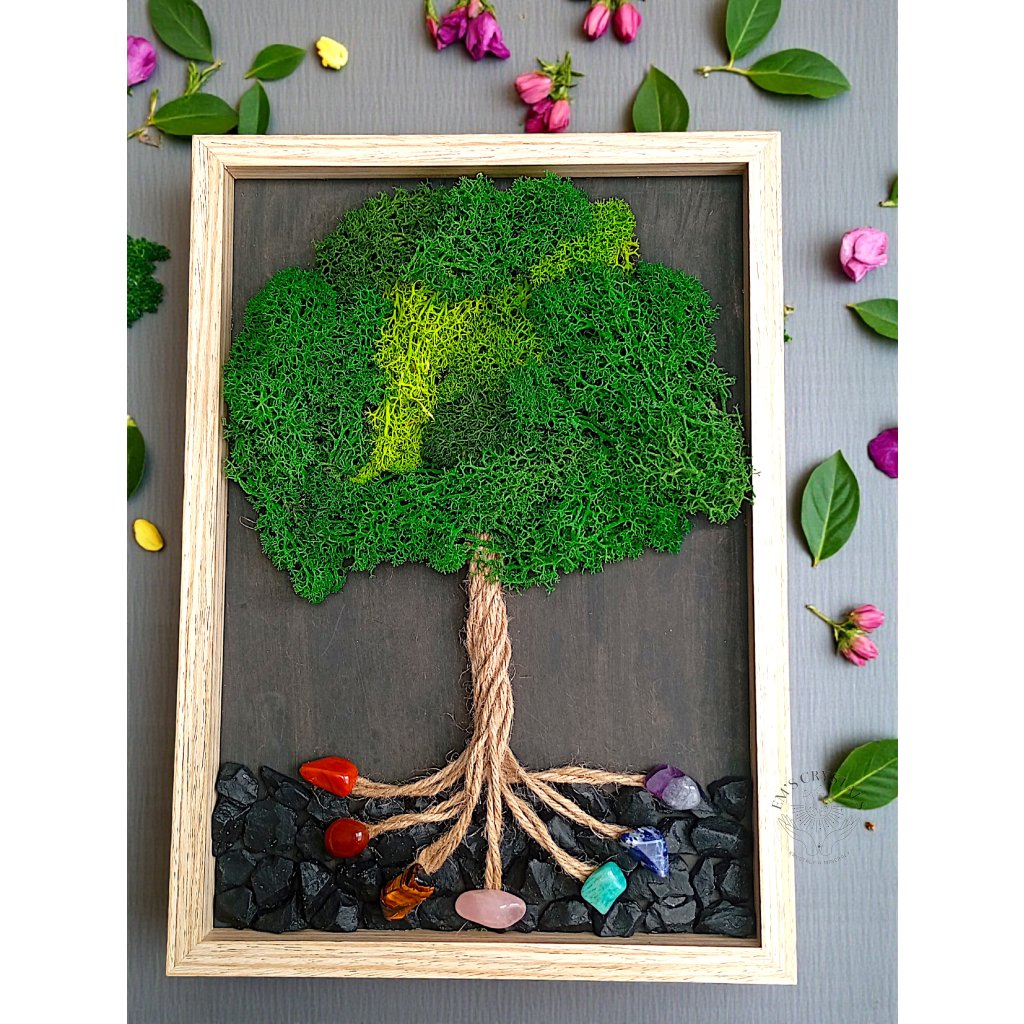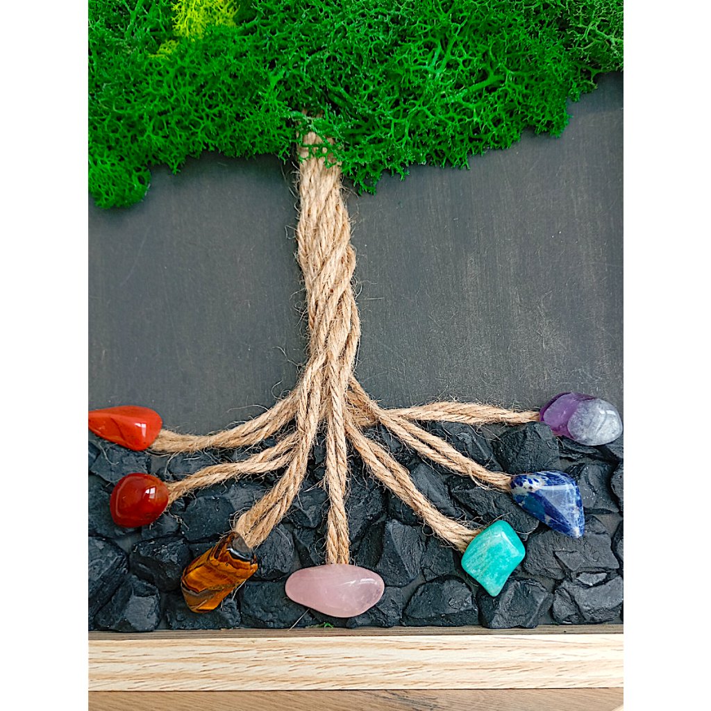 Obraz z pravého mechu a přírodních minerálů v sobě nese klid lesa i sílu země. Propletené kořeny z přírodního provazu symbolizují naši cestu, stabilitu a spojení s tím, co nás přesahuje. Koruna stromu z hebkého mechu představuje růst, obnovu a tiché spočinutí v rovnováze.