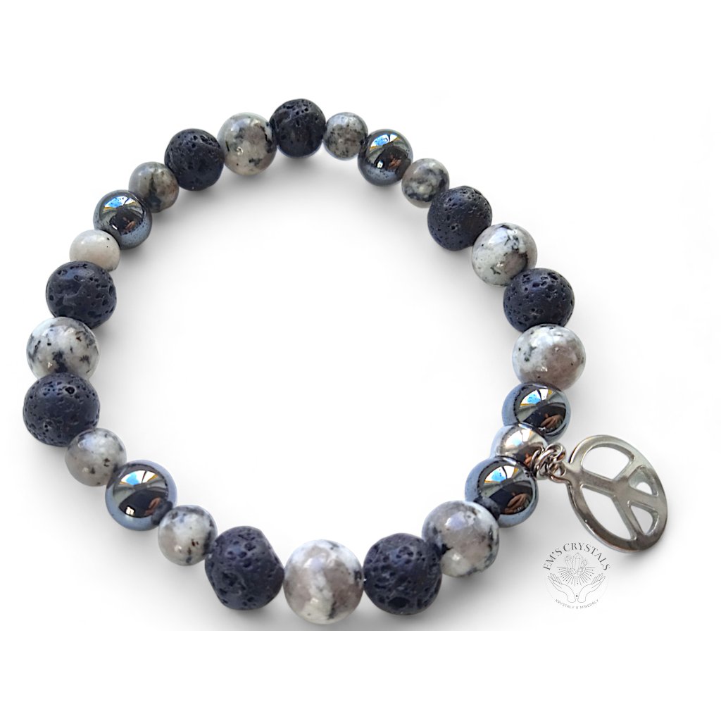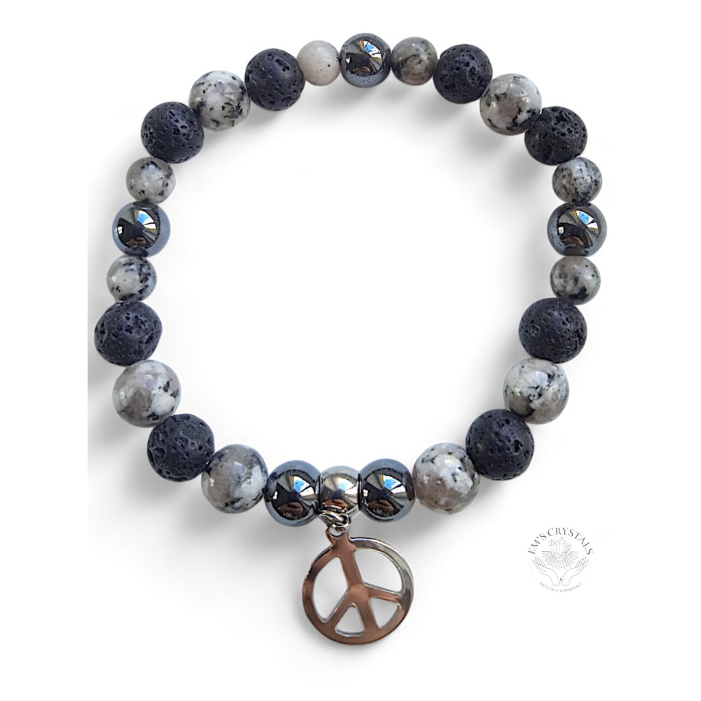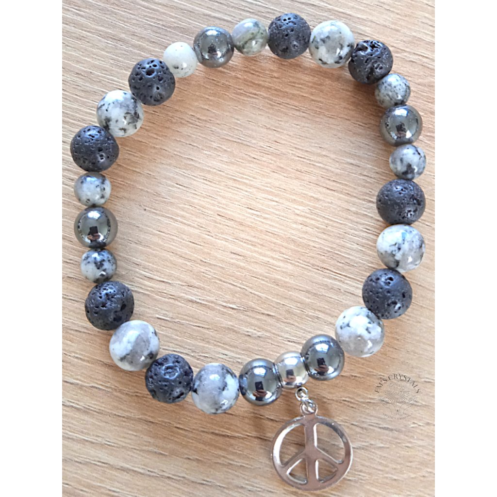 Náramek "Rovnováha" je navržen tak, aby vám přinášel klid a vyrovnanost ve všech oblastech vašeho života. Kombinace sezamového jaspisu, lávového kamene a hematitu, doplněná chirurgickou ocelí a přívěskem ve tvaru symbolu míru, poskytuje harmonii a vnitřní sílu.