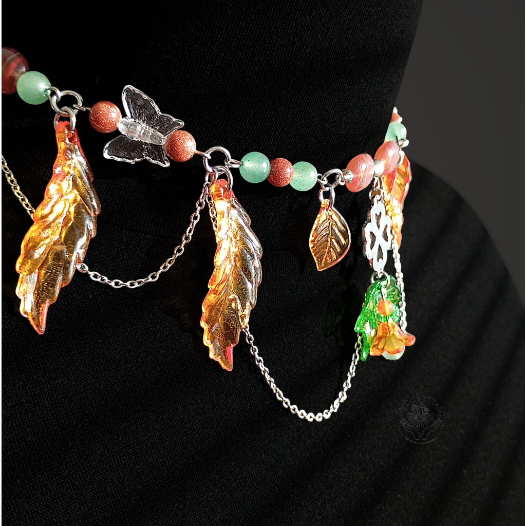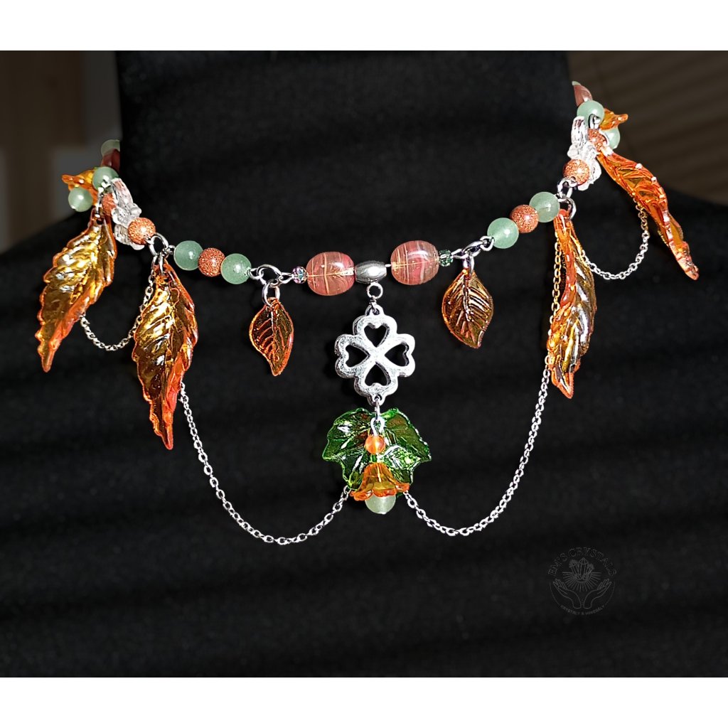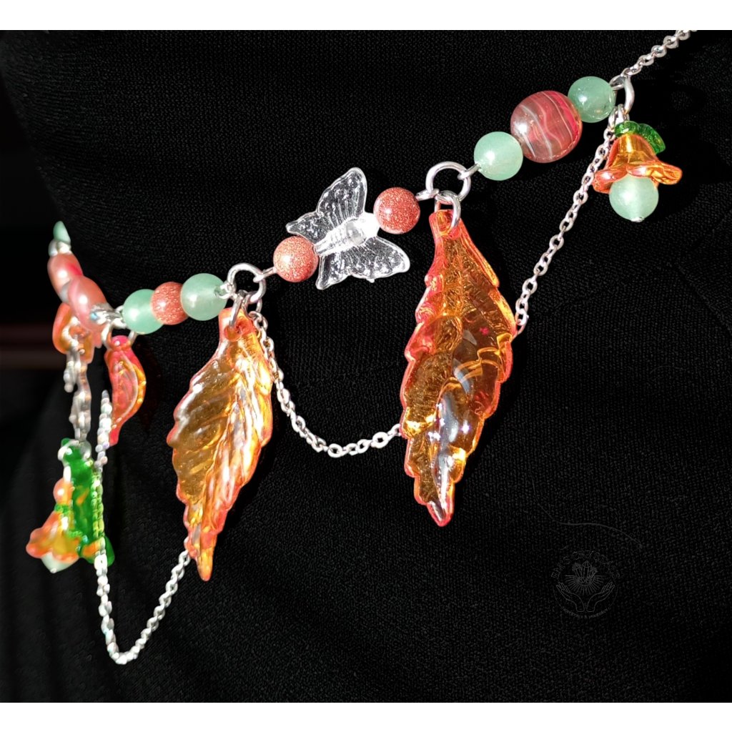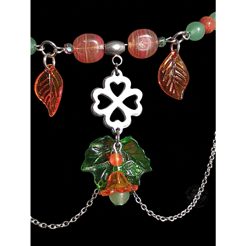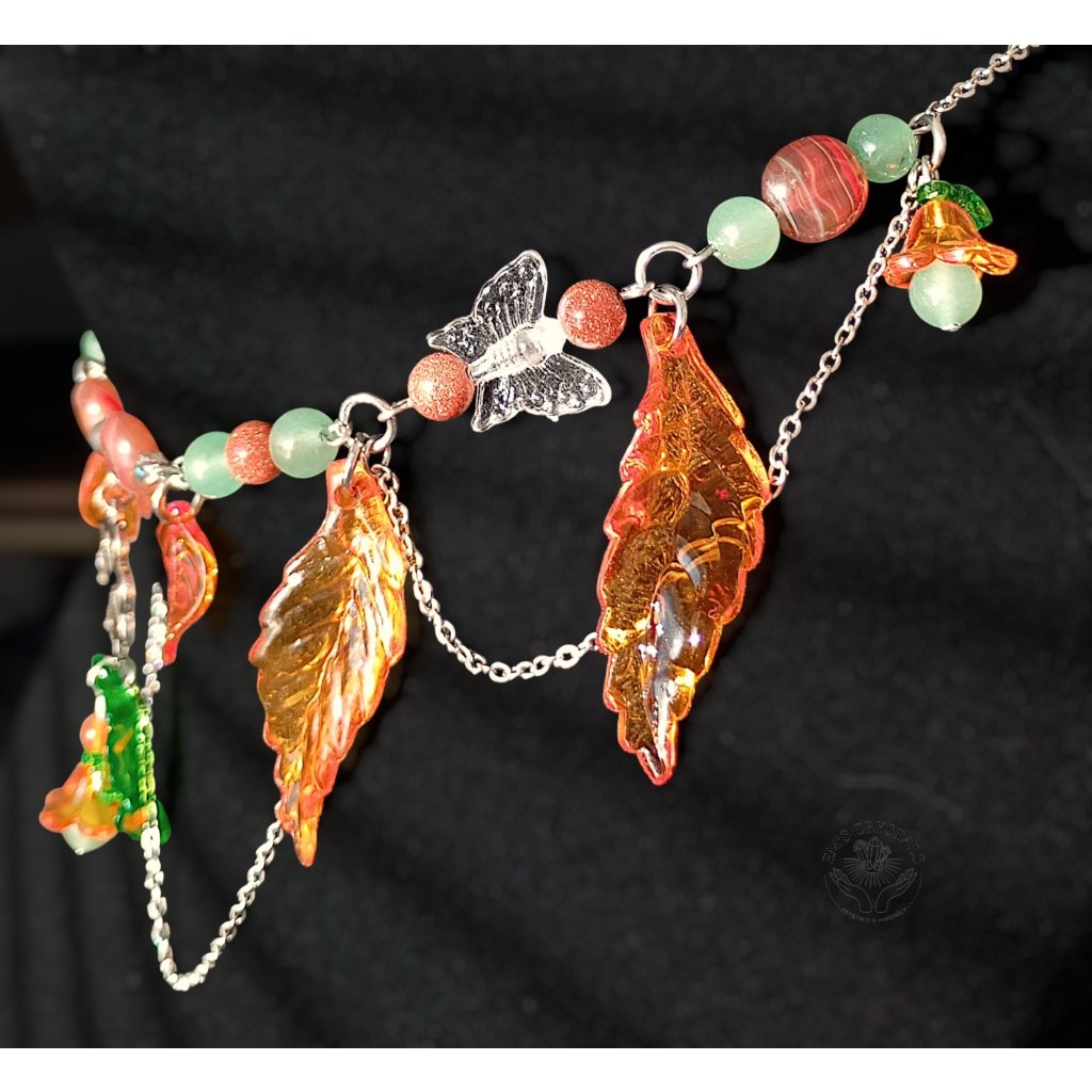 Tento náhrdelník v teplých tónech podzimu nese kouzlo zlatého světla a jemného vánku mezi spadanými listy. Motýlci jako poslové proměny tančí kolem čtyřlístku, který ukrývá špetku štěstí. Kombinace karneolu, zeleného a zlatého avanturínu přináší radost, vitalitu a vnitřní rovnováhu – je to amulet harmonie, který připomíná, že i konec léta může kvést barvami. Autumn’s Grace v sobě spojuje zemitou sílu přírody a jemnost zázraků, které přináší každý nový den.