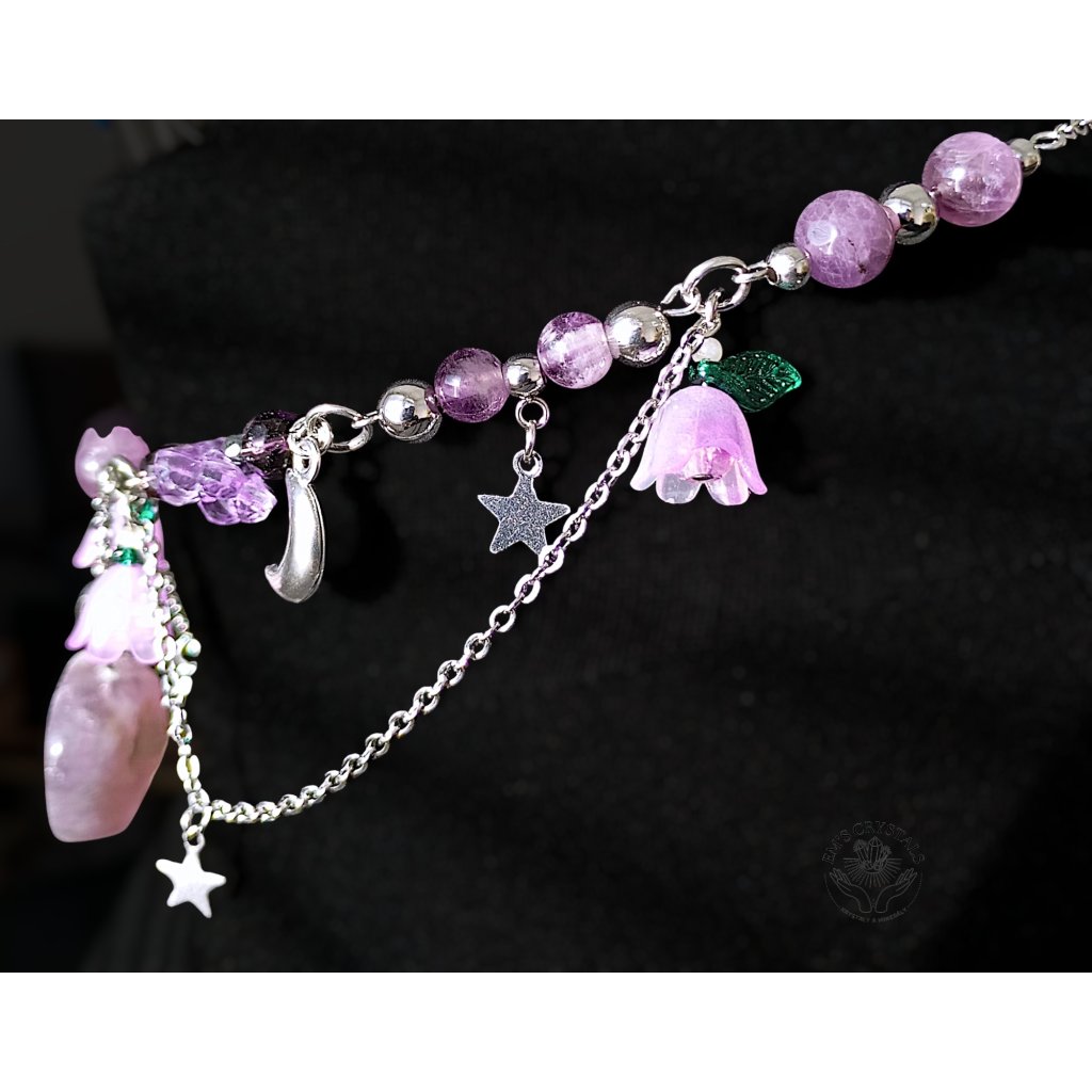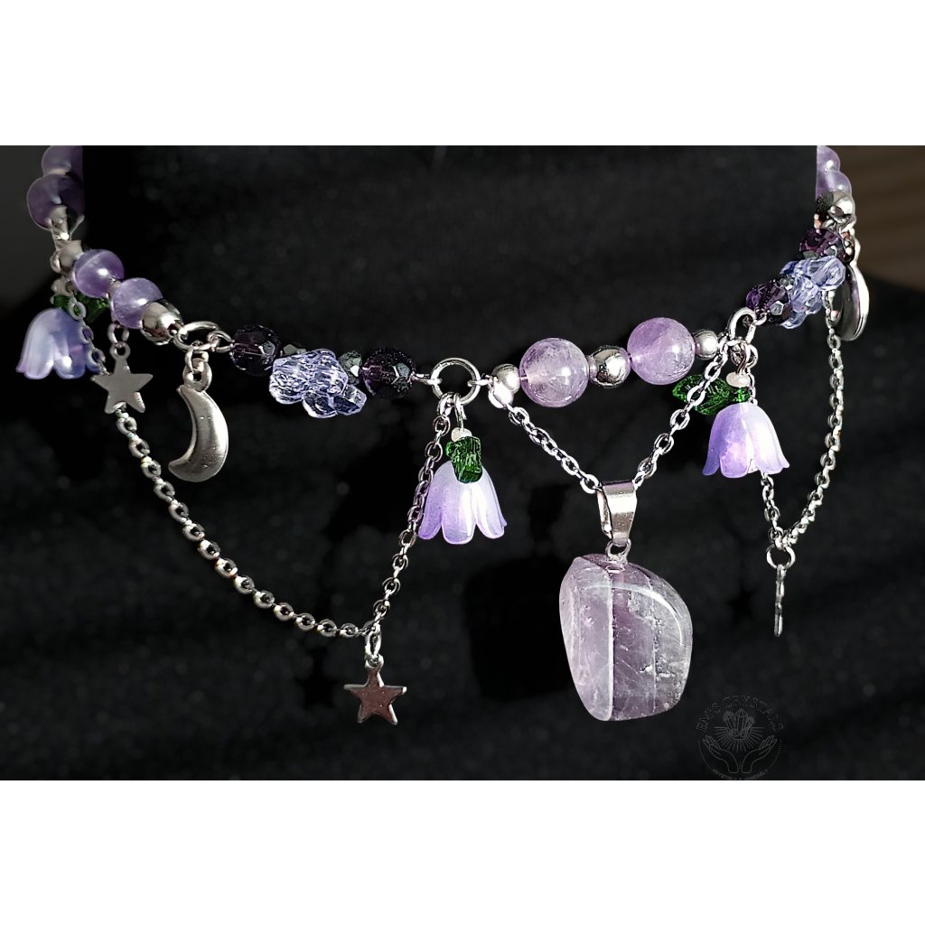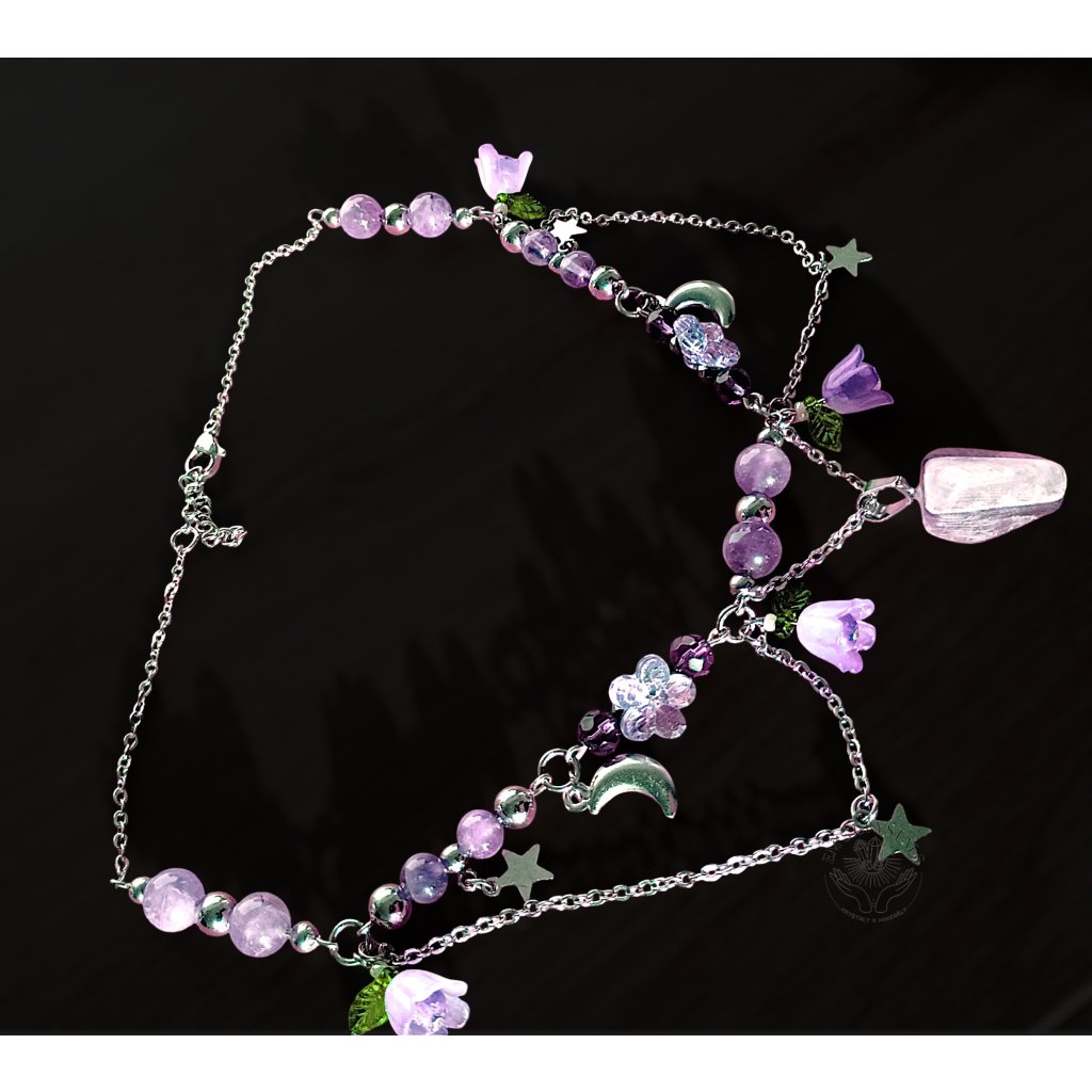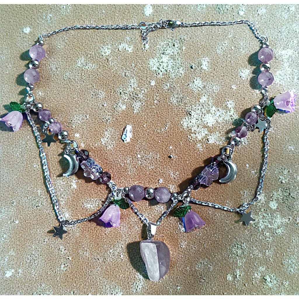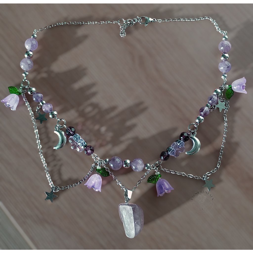 V tomto náhrdelníku se setkává kouzlo hvězdné oblohy s něžností rozkvetlé noci. Fialové zvonky symbolizují tichý zpěv přírody, zatímco měsíček a hvězdy z chirurgické oceli září jako strážci snů. Ametyst přináší klid, moudrost a duchovní sílu, zatímco hematit uzemňuje a chrání – společně vytvářejí rovnováhu mezi snem a skutečností. Celestial Bloom je talismanem harmonie, který nese dotek vesmíru i kouzlo lesního ticha.