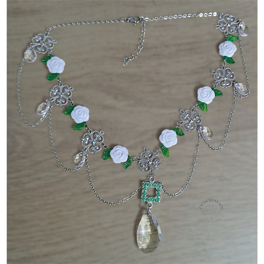 V tichém šepotu jarního rána se rodí Emerald Grace — náhrdelník, v němž se snoubí křehkost květů a síla země. Bílé růžičky symbolizují čistotu a nové začátky, zatímco jejich zelené lístky přinášejí dotek životní energie a růstu. Lesk skleněných kapek připomíná kapky rosy třpytící se na listech, a centrální zelený přívěsek září jako srdce přírody samotné. Tento šperk je ódou klidu, rovnováhy a elegance — jemné kouzlo ukryté v každém pohybu světla.