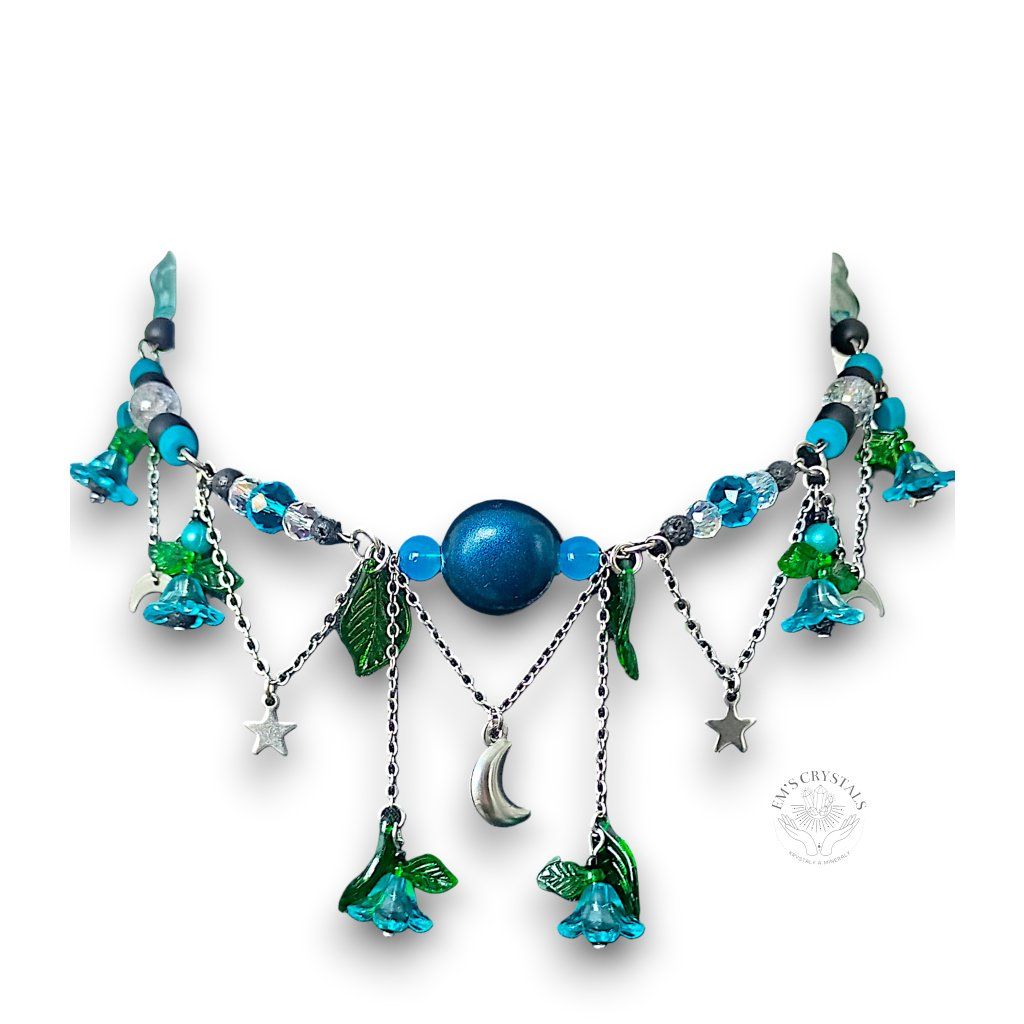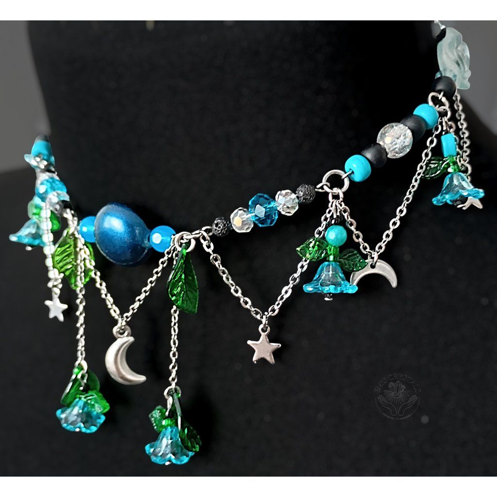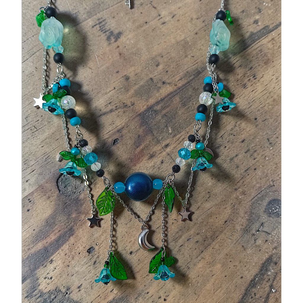 Náhrdelník v hlubokých odstínech tyrkysové a modré evokuje klidnou noční hladinu, nad kterou tiše září hvězdy a stříbrný měsíc. Jemné řetízky, drobné lístky a zvonkové květy se pohupují při každém kroku jako skrytý život noční zahrady.