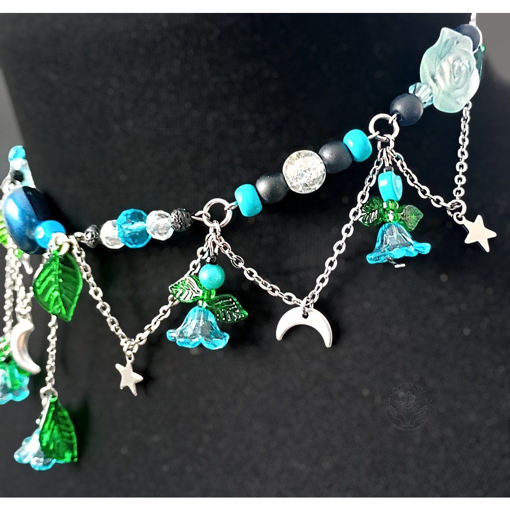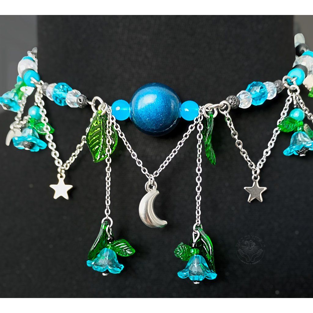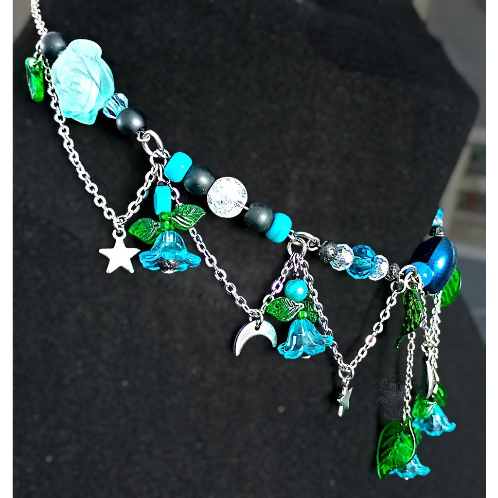 Náhrdelník v hlubokých odstínech tyrkysové a modré evokuje klidnou noční hladinu, nad kterou tiše září hvězdy a stříbrný měsíc. Jemné řetízky, drobné lístky a zvonkové květy se pohupují při každém kroku jako skrytý život noční zahrady.