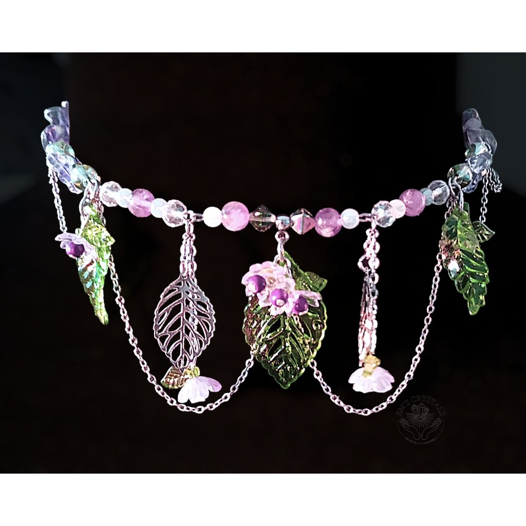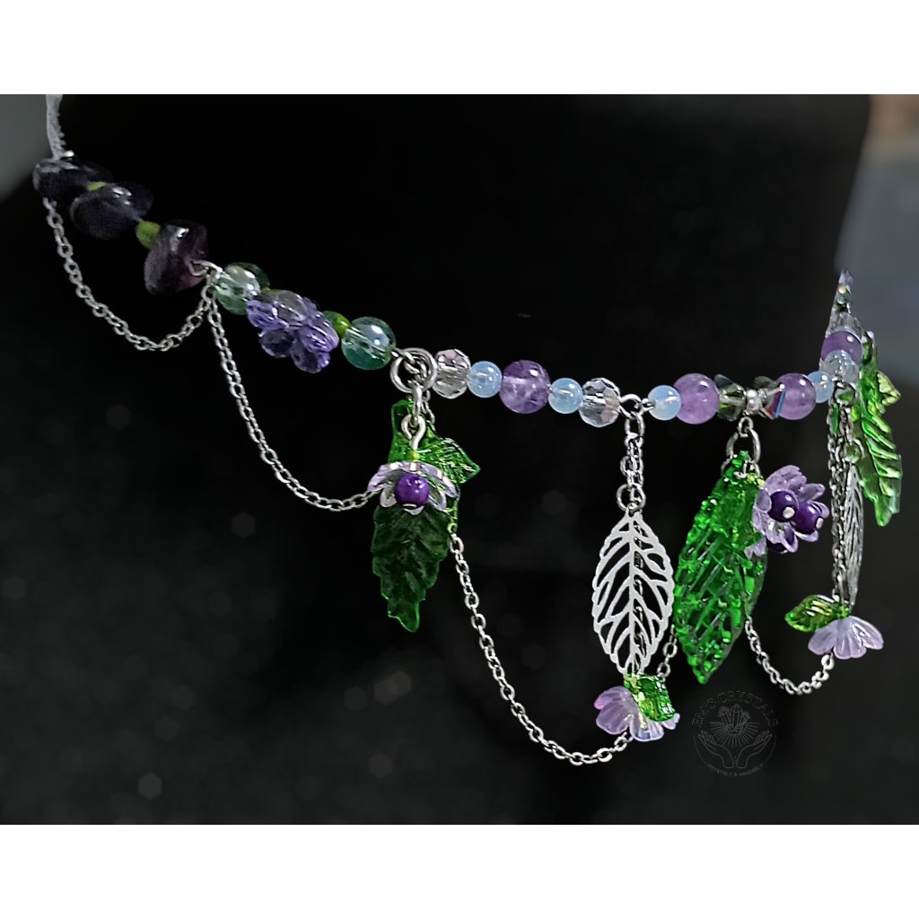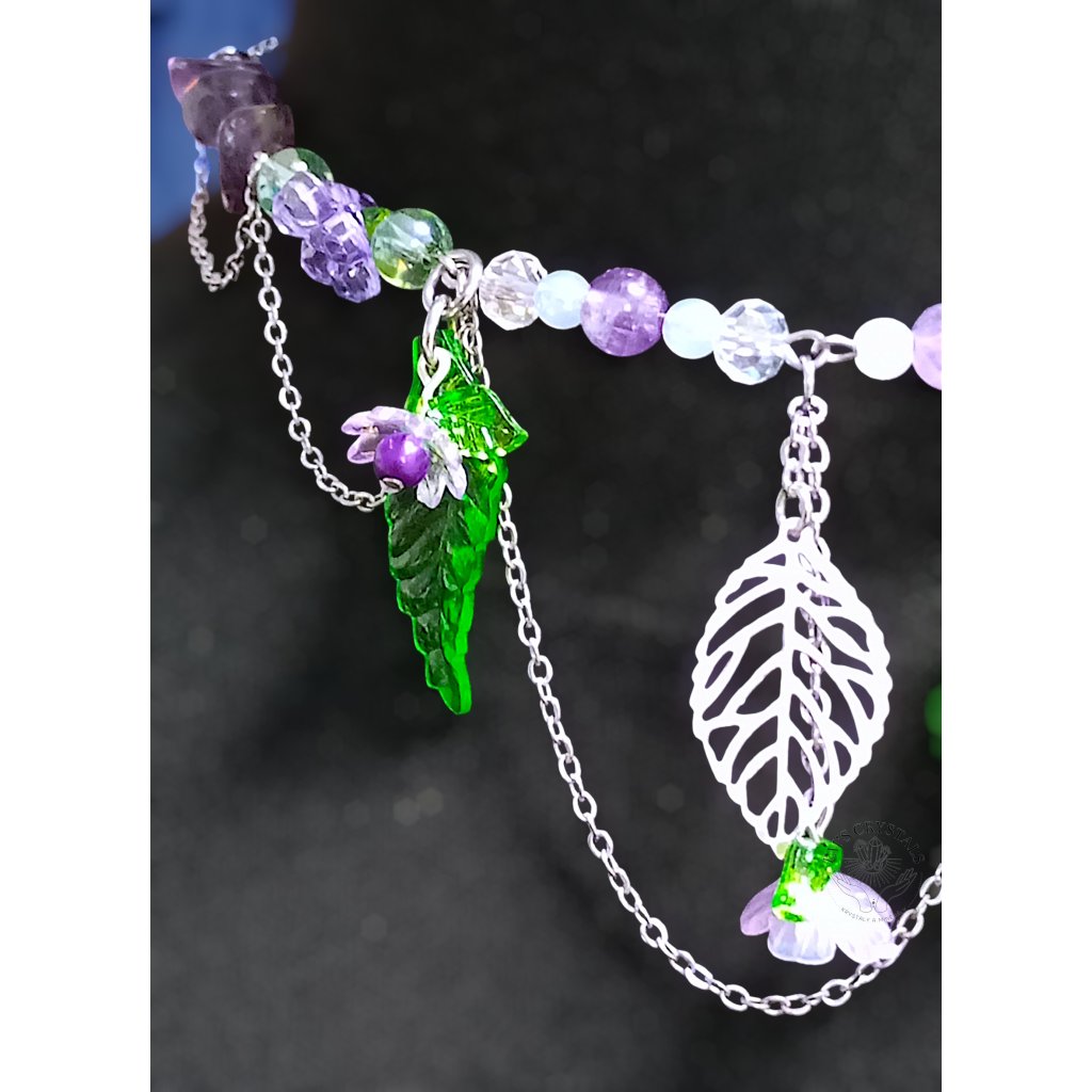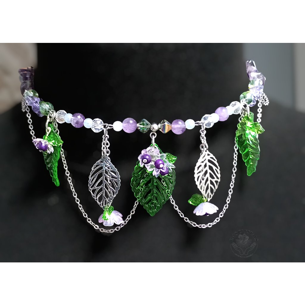 Zelené listy a drobná fialová kvítka vytvářejí dojem lesního podrostu, v němž se ukrývá ticho, rovnováha a vnitřní síla. Jemné řetízky dodávají náhrdelníku pohyb a éterický charakter, jako by se jednotlivé prvky lehce houpaly ve večerním vánku.