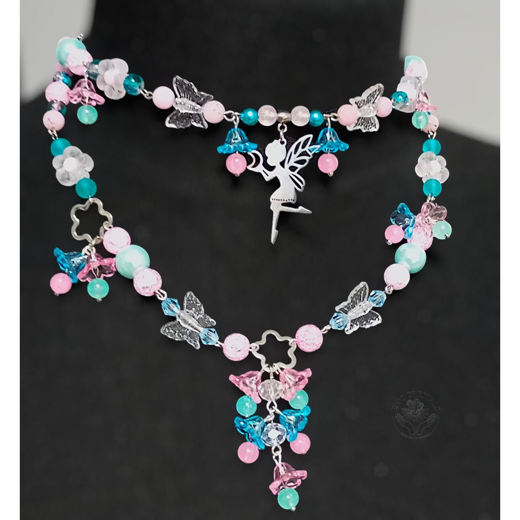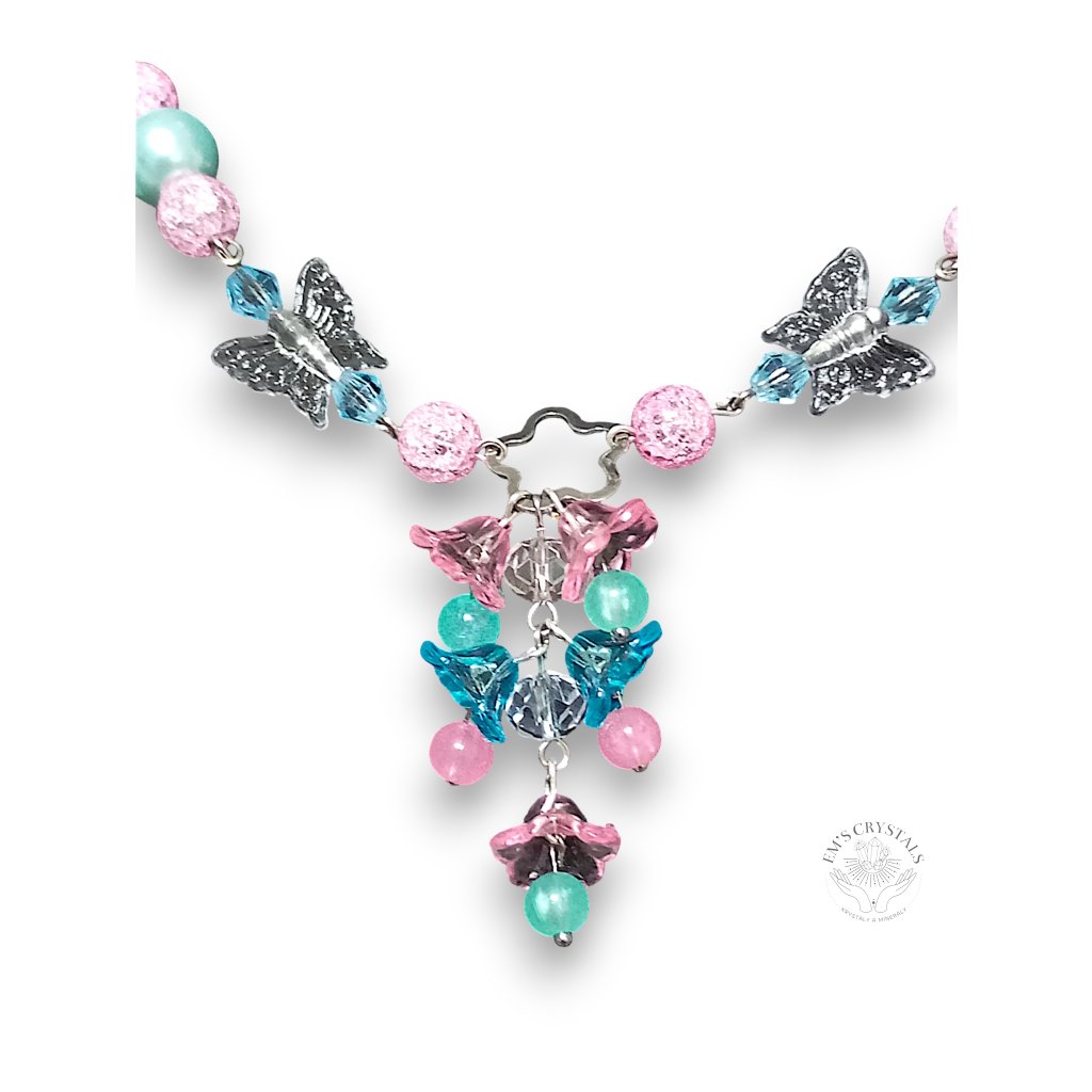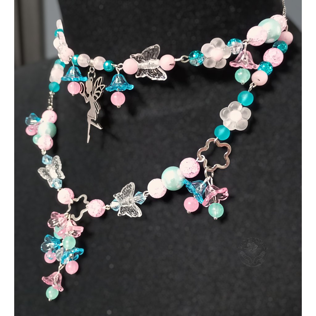 Náhrdelník v jemných růžovo-tyrkysových tónech působí lehce, svěže a vyváženě. Nese lehkost motýlích křídel, něhu květů a jemné kouzlo pastelových tónů, které vytváří pocit pohybu a přirozené harmonie, jako tichý okamžik mezi jarem a létem. Tento náhrdelník působí jako energetický závoj, který tiše splývá s pohybem těla.