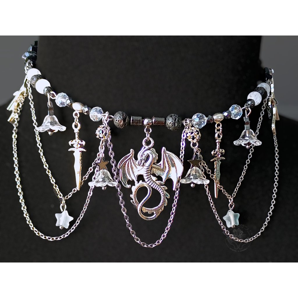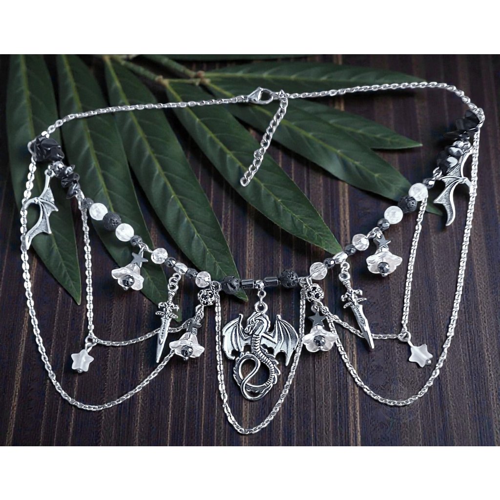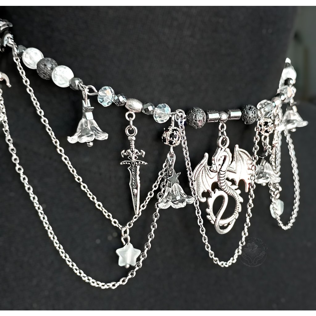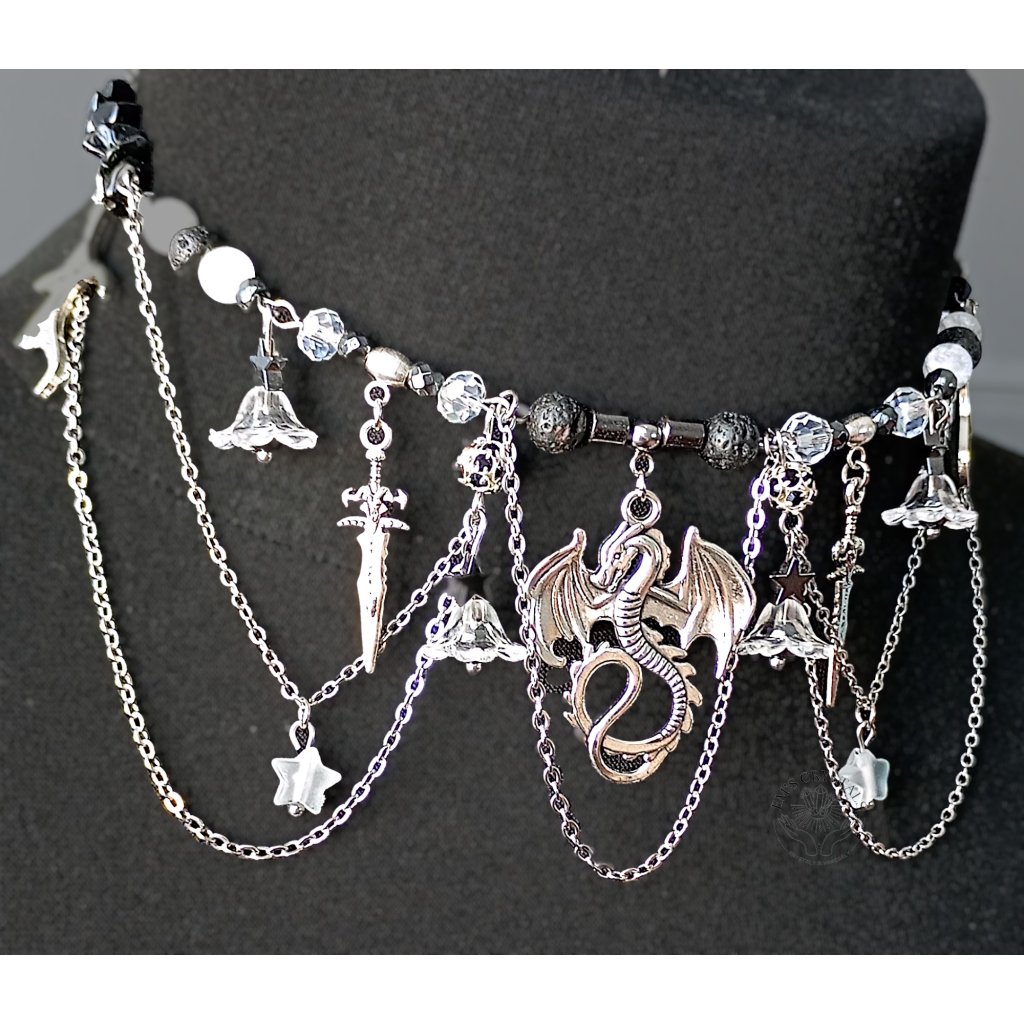 Náhrdelník Draconis Noctis je talisman zrozený z ohně, stínu a světla. Dominantní drak uprostřed symbolizuje ochranu, vnitřní sílu a probuzenou energii, zatímco řetízky, meče a hvězdné detaily vytvářejí dojem magického artefaktu z jiného světa.