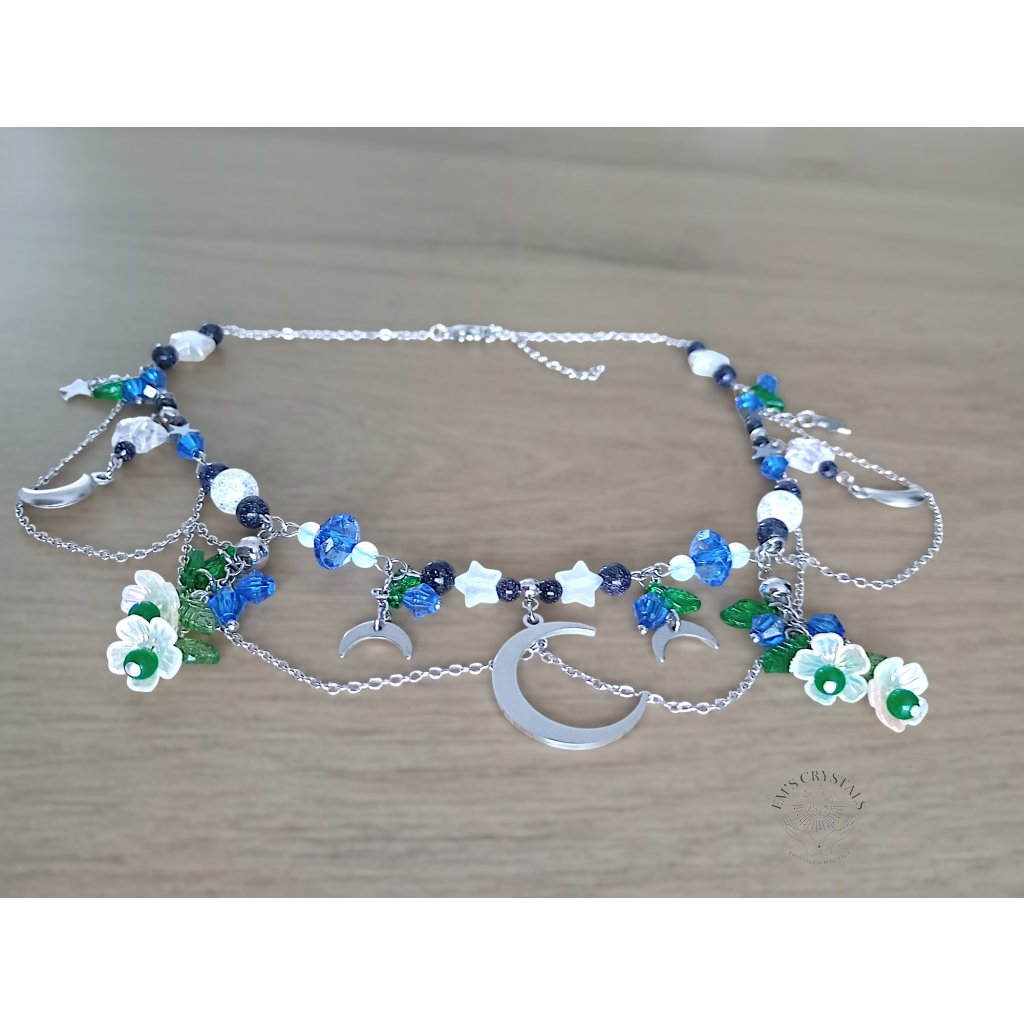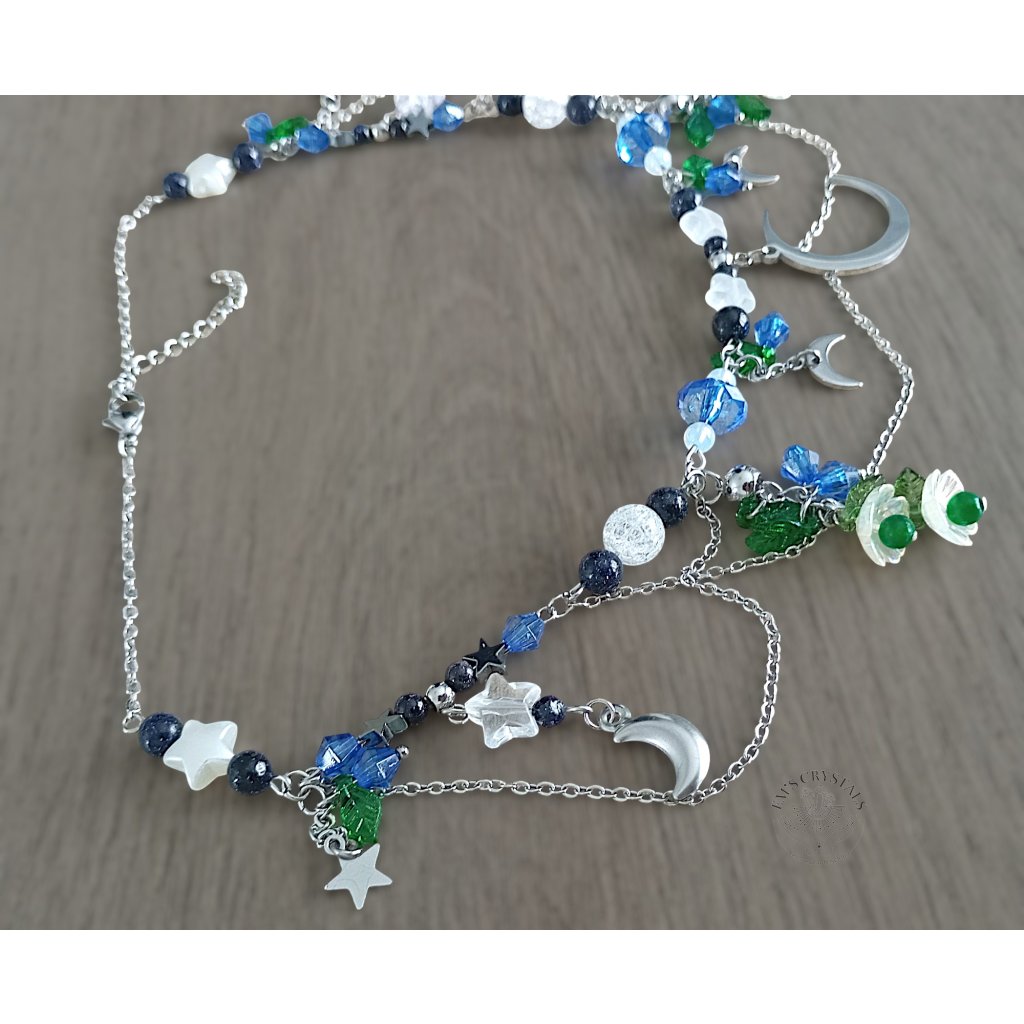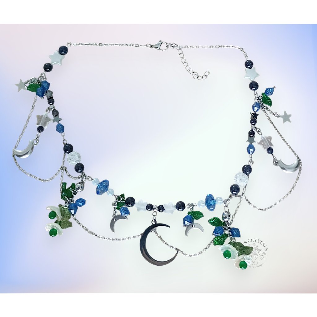 Pod tichým závojem hvězd se rodí kouzlo noci — klidné, tajemné a nekonečně hluboké. Náhrdelník Whispers of the Night Sky zachycuje její dech v jemném šepotu minerálů. Modrý avanturín přináší vnitřní klid a moudrost, zatímco praskaný křišťál rozptyluje stíny a otevírá cestu světlu. Hvězdičky z hematitu připomínají sílu zůstat pevně spjatá se zemí, i když duše míří k nebesům. Mezi zelenými lístky a něžnými kvítky z avanturínu se odráží rovnováha mezi snem a skutečností — šperk pro ty, kdo hledají mír v srdci a magii v každé noci.