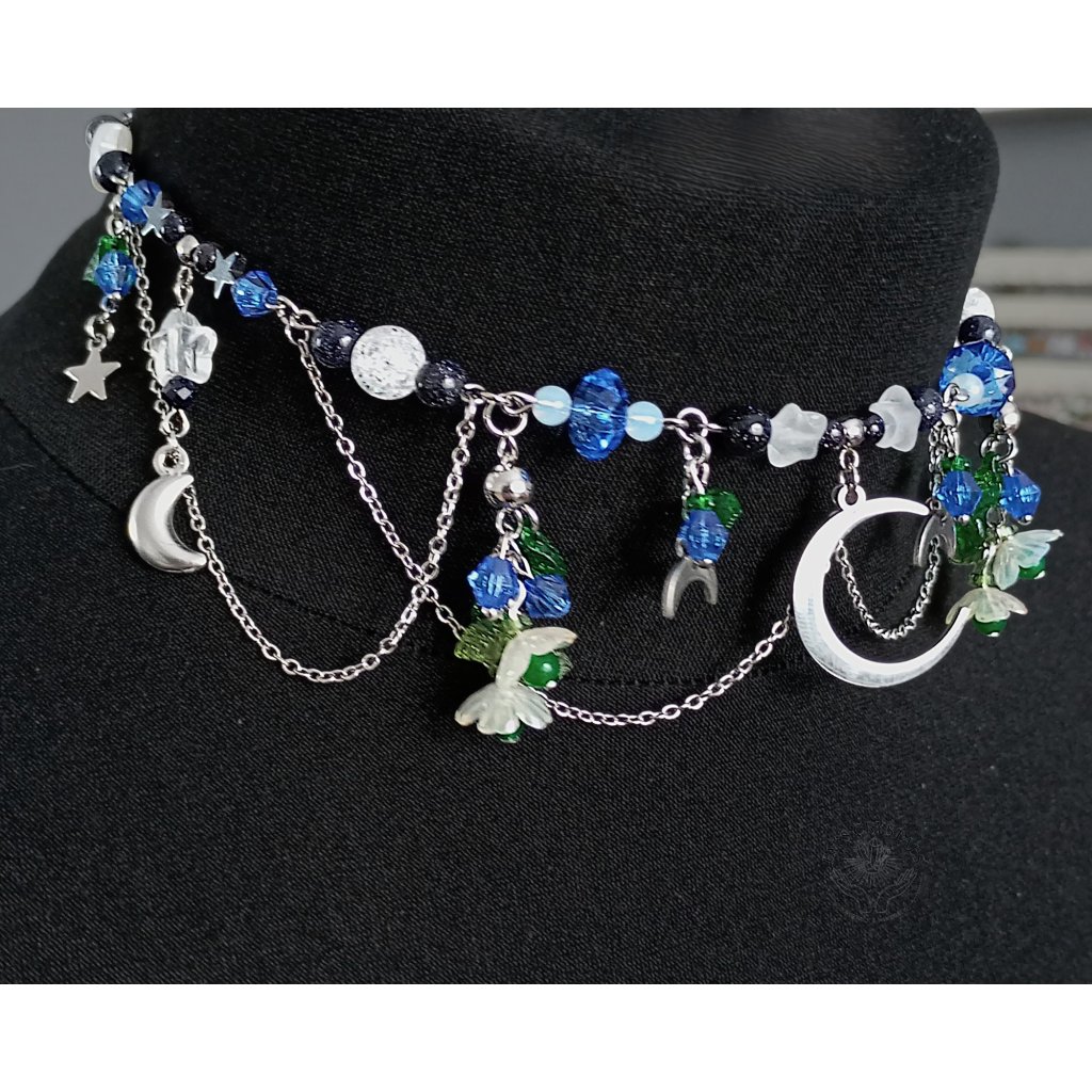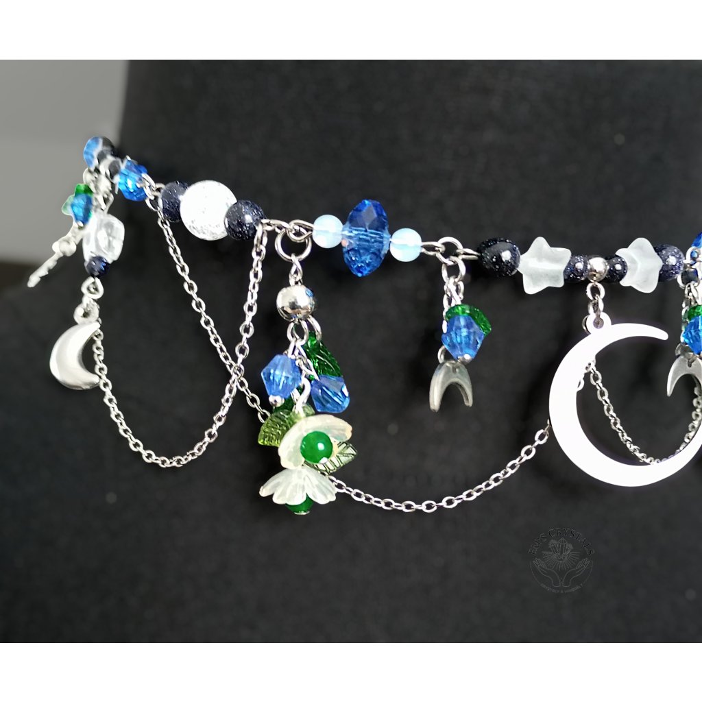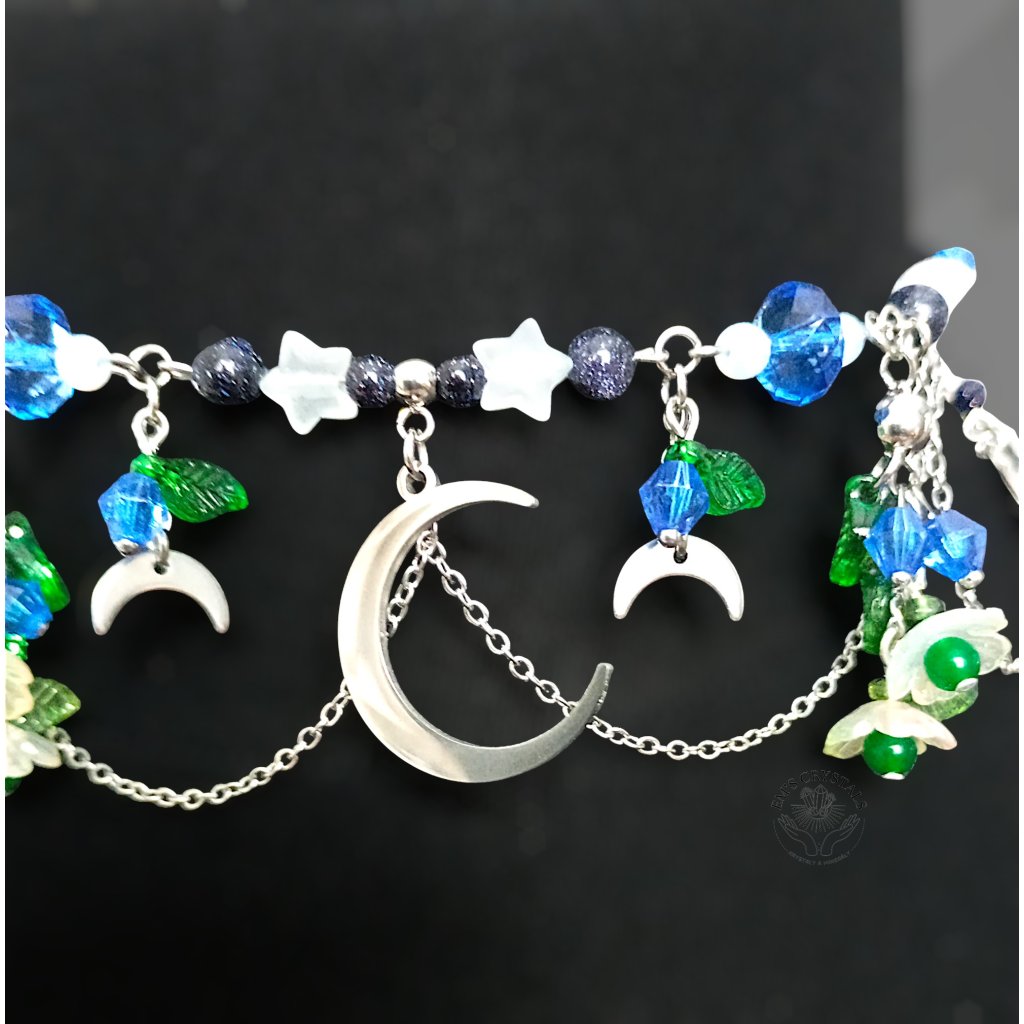Pod tichým závojem hvězd se rodí kouzlo noci — klidné, tajemné a nekonečně hluboké. Náhrdelník Whispers of the Night Sky zachycuje její dech v jemném šepotu minerálů. Modrý avanturín přináší vnitřní klid a moudrost, zatímco praskaný křišťál rozptyluje stíny a otevírá cestu světlu. Hvězdičky z hematitu připomínají sílu zůstat pevně spjatá se zemí, i když duše míří k nebesům. Mezi zelenými lístky a něžnými kvítky z avanturínu se odráží rovnováha mezi snem a skutečností — šperk pro ty, kdo hledají mír v srdci a magii v každé noci.