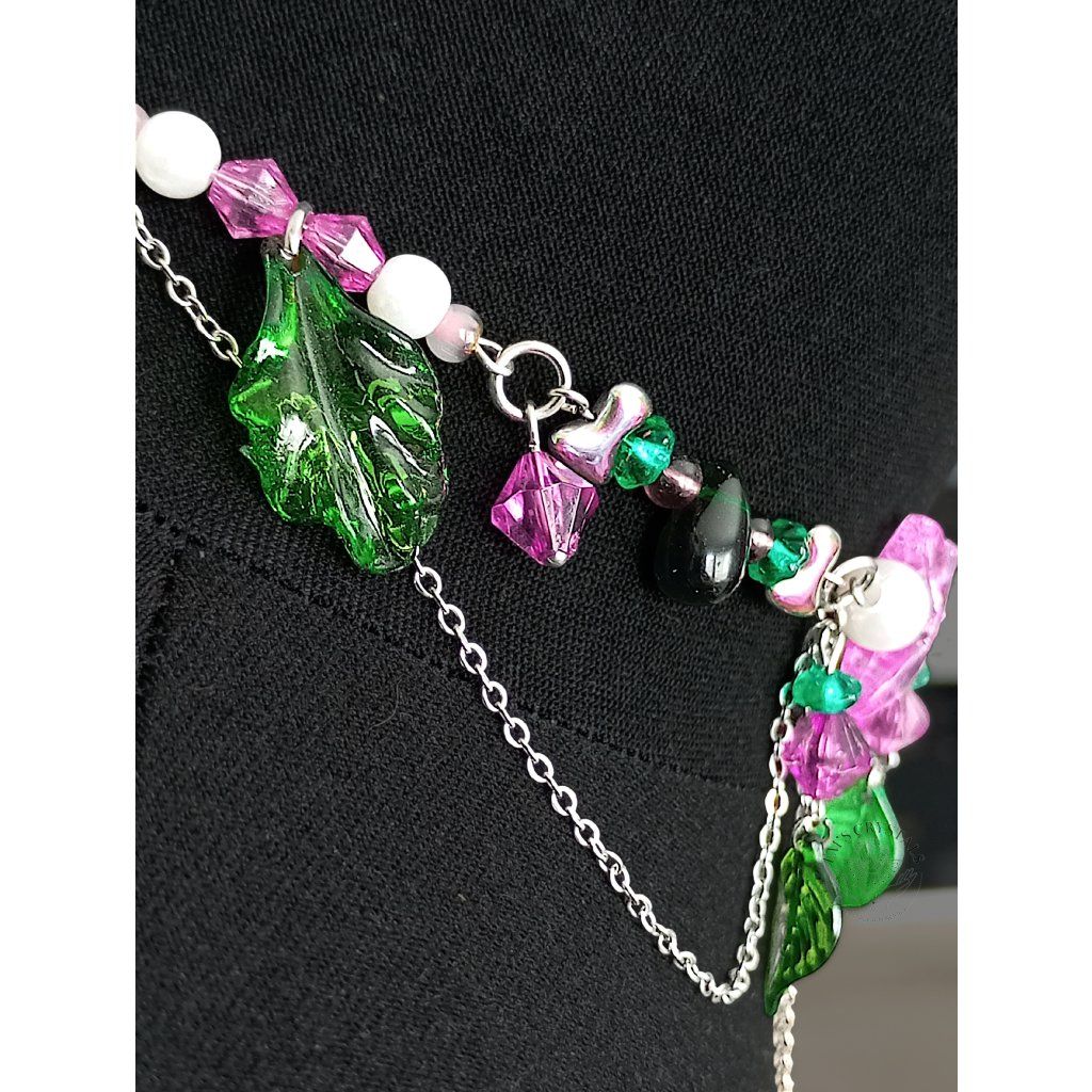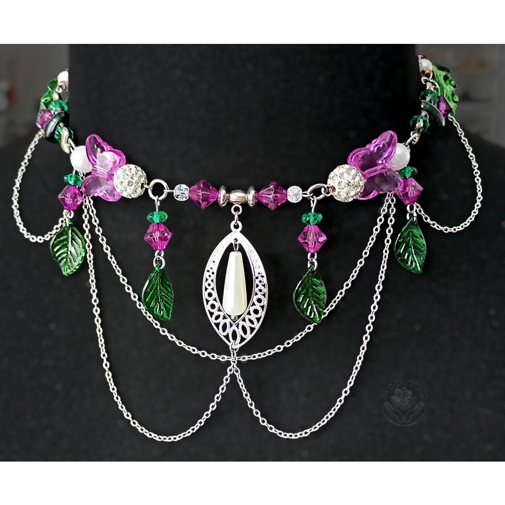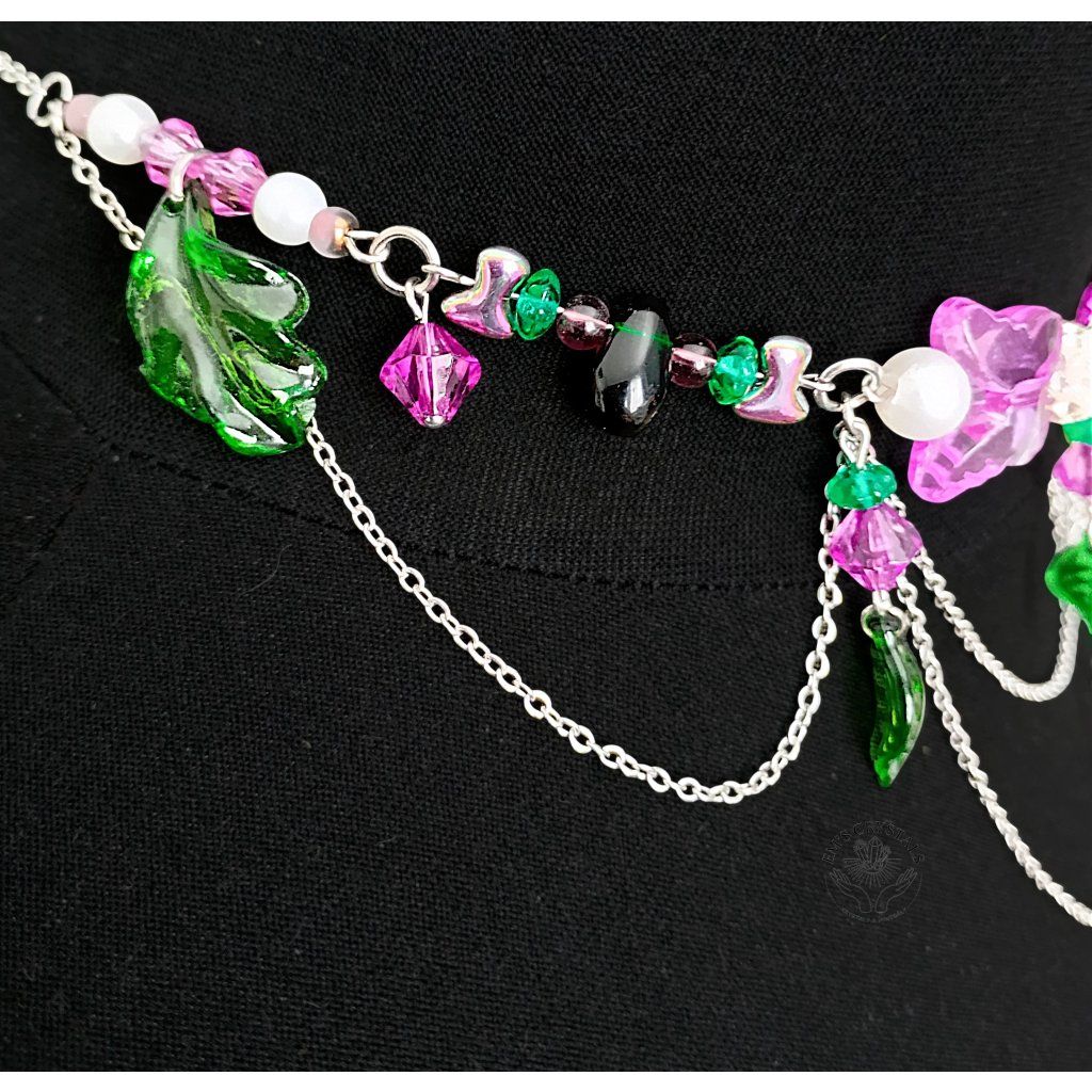 Temně růžové a zelené tóny symbolizují rozkvět a život – květy, listy i šepot lesních víl. Stříbrné řetízky dodávají šperku lehkost a pohyb, jako by se jemně vznášel s každým krokem.