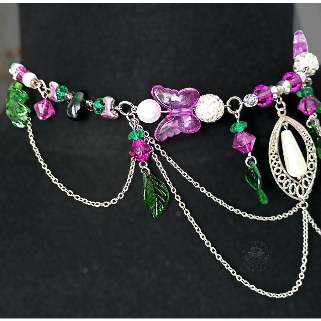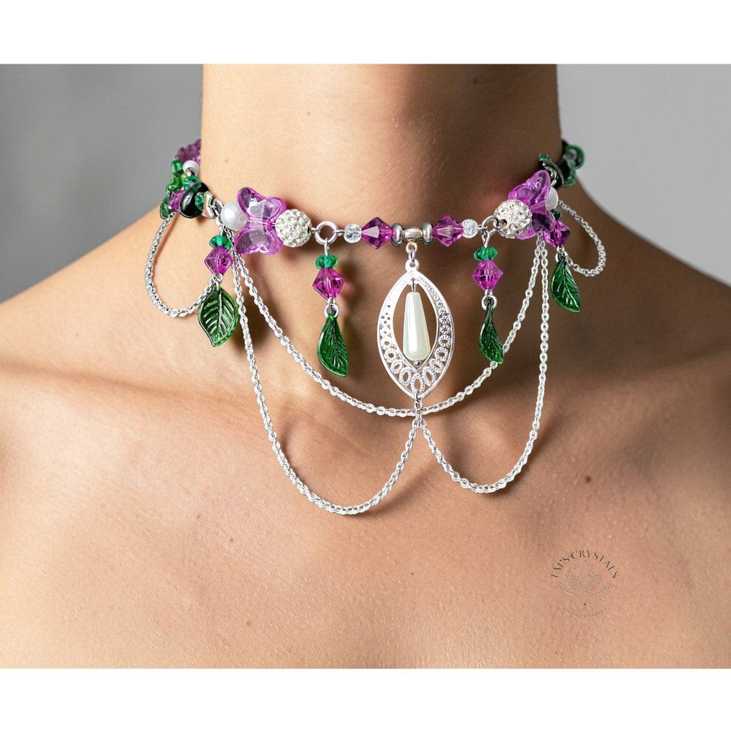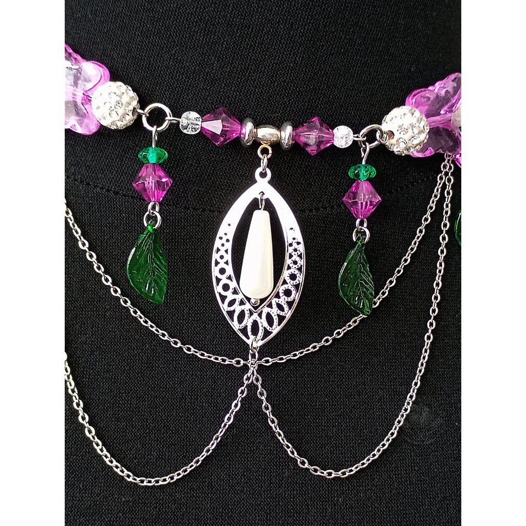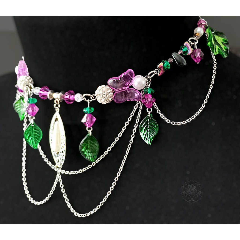 Temně růžové a zelené tóny symbolizují rozkvět a život – květy, listy i šepot lesních víl. Stříbrné řetízky dodávají šperku lehkost a pohyb, jako by se jemně vznášel s každým krokem.