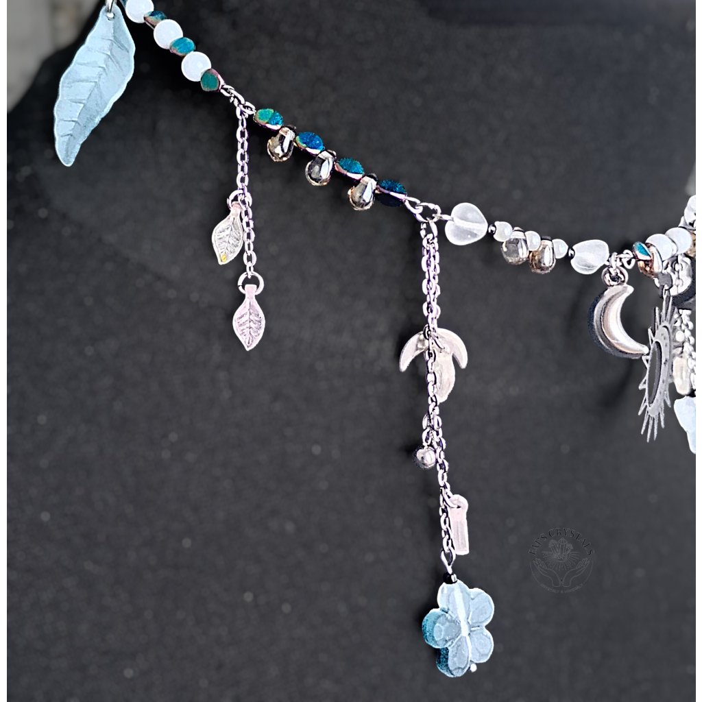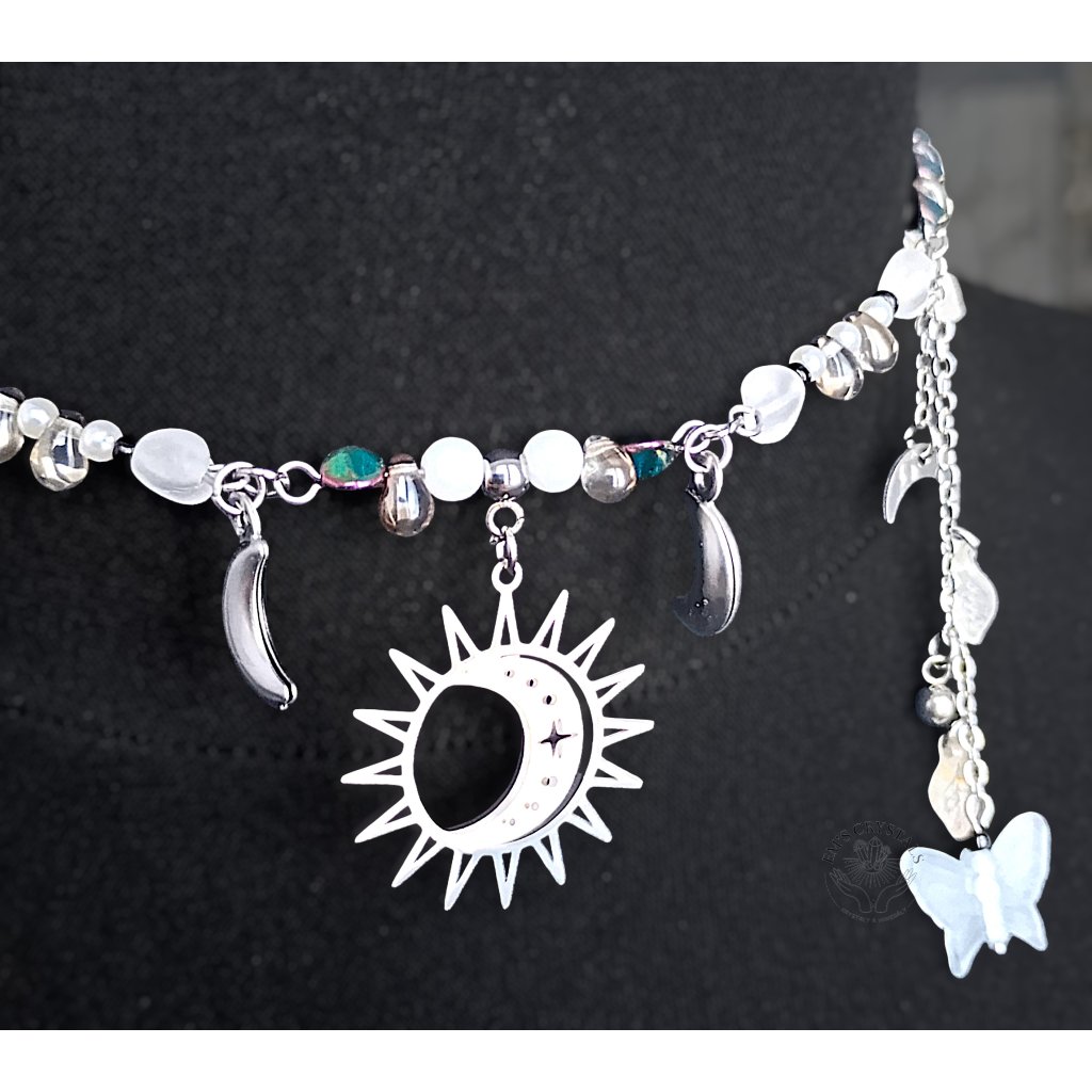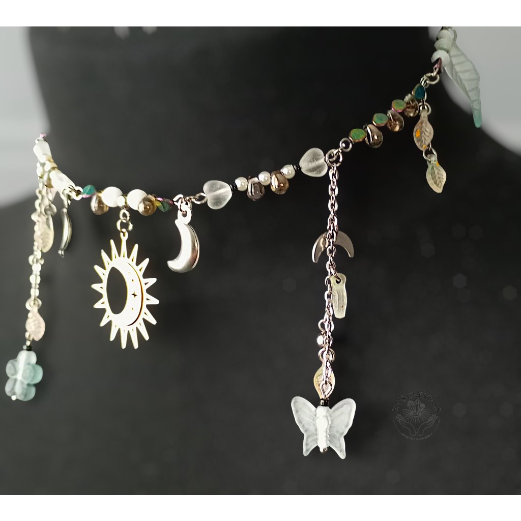 Náhrdelník inspirovaný rovnováhou mezi světlem a temnotou, dnem a nocí. Ústředním prvkem je symbol slunce a měsíce z chirurgické oceli – spojení protikladů, které spolu tvoří harmonii. Jemné korálky v chladných tónech, doplněné drobnými přívěsky měsíců, motýlků a květů, evokují tichou noční oblohu zalitou měsíčním světlem.