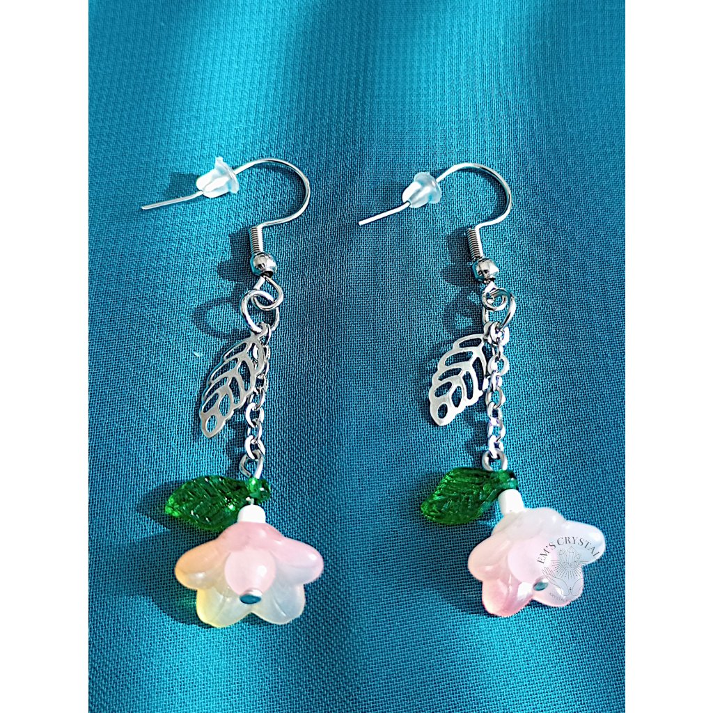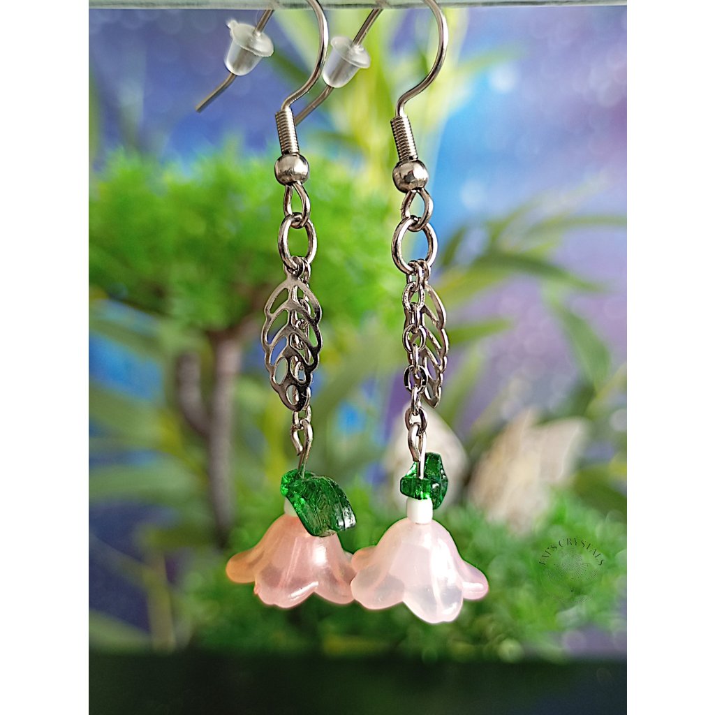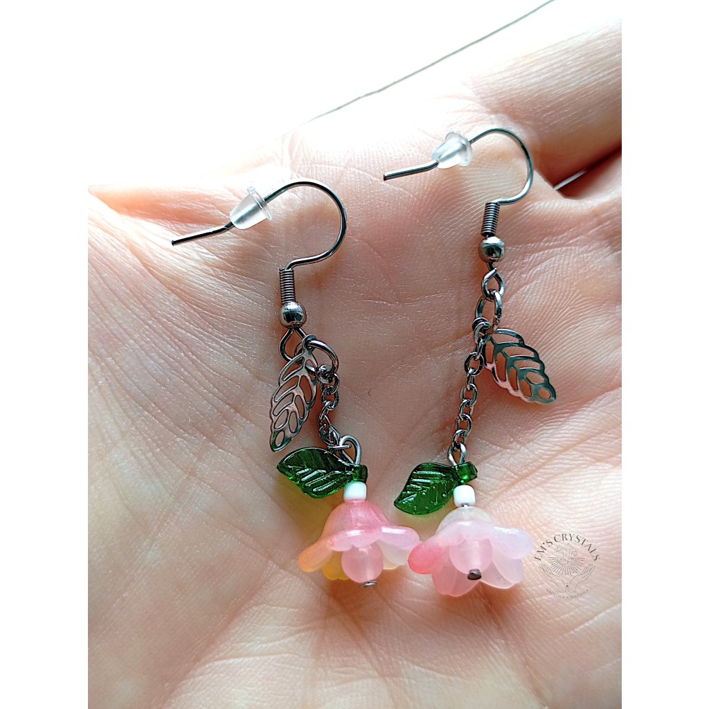 Náušnice z chirurgické oceli, zdobené růžovými zvonkovými kvítky s korálkem z achátu uprostřed, zelenými lístky a malými zavěšenými ocelovými lístky. Achát přináší rovnováhu a ochranu, zatímco kombinace něžných kvítků a jemných lístků vytváří dojem lehkosti a pohybu, jako šepot jarního větru v zahradě.