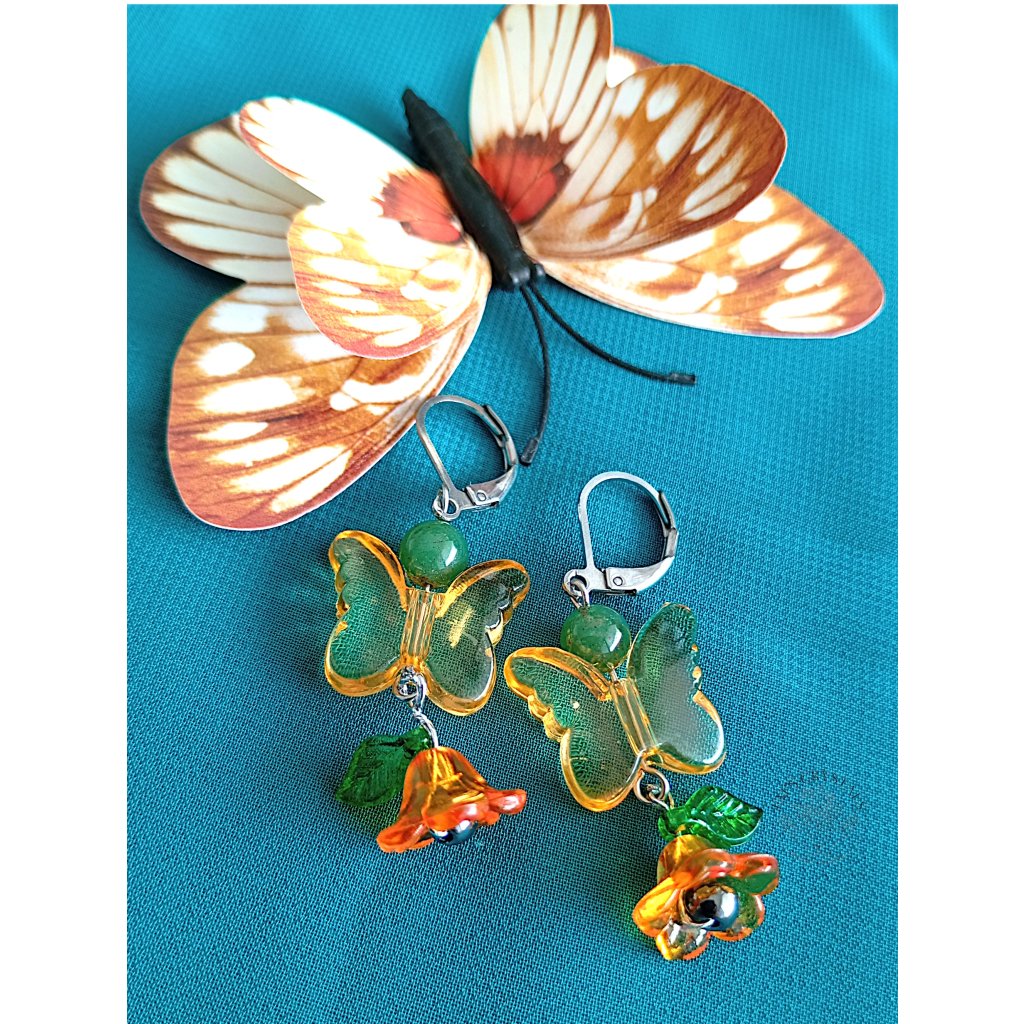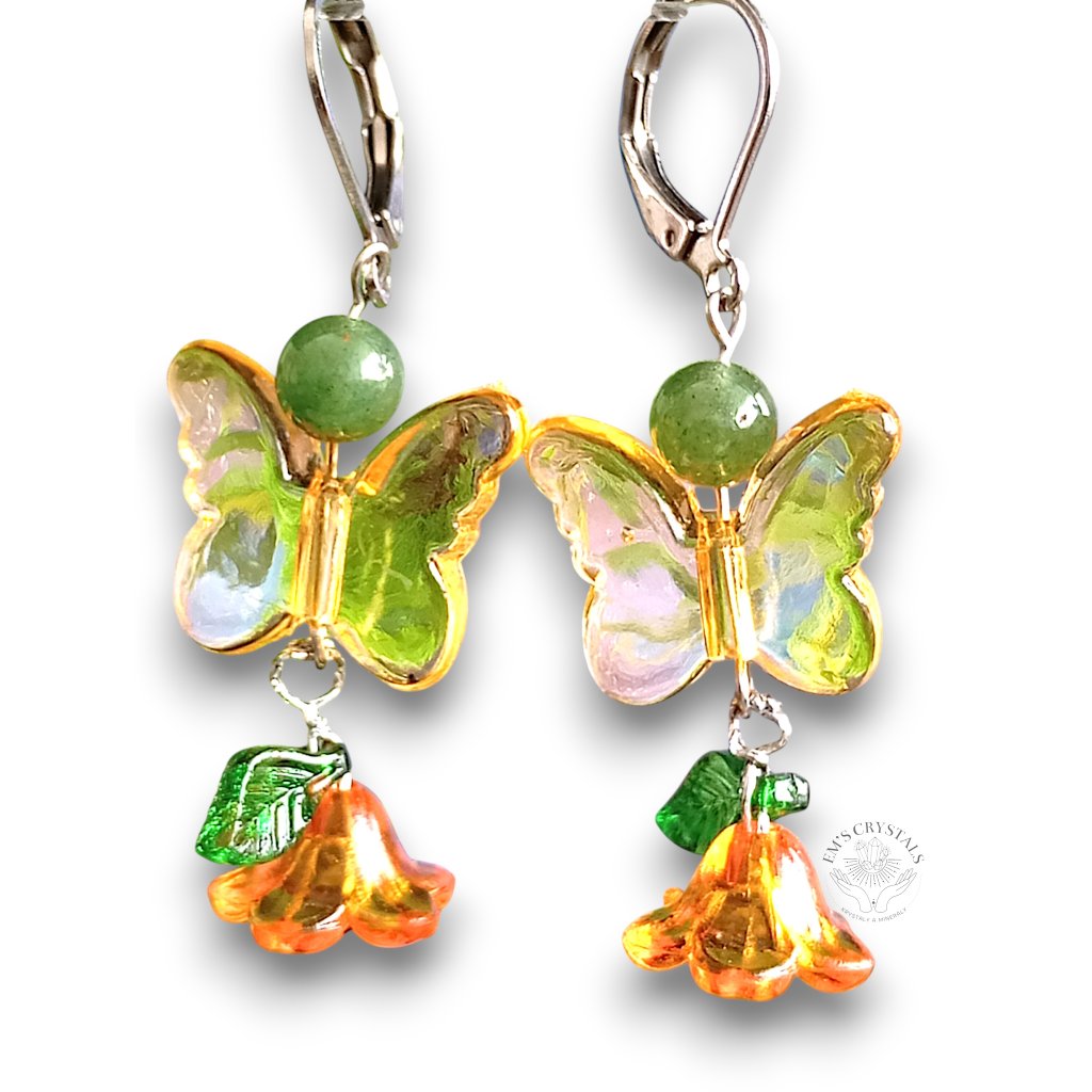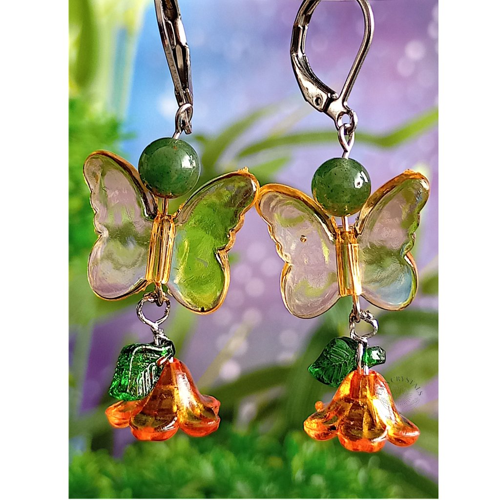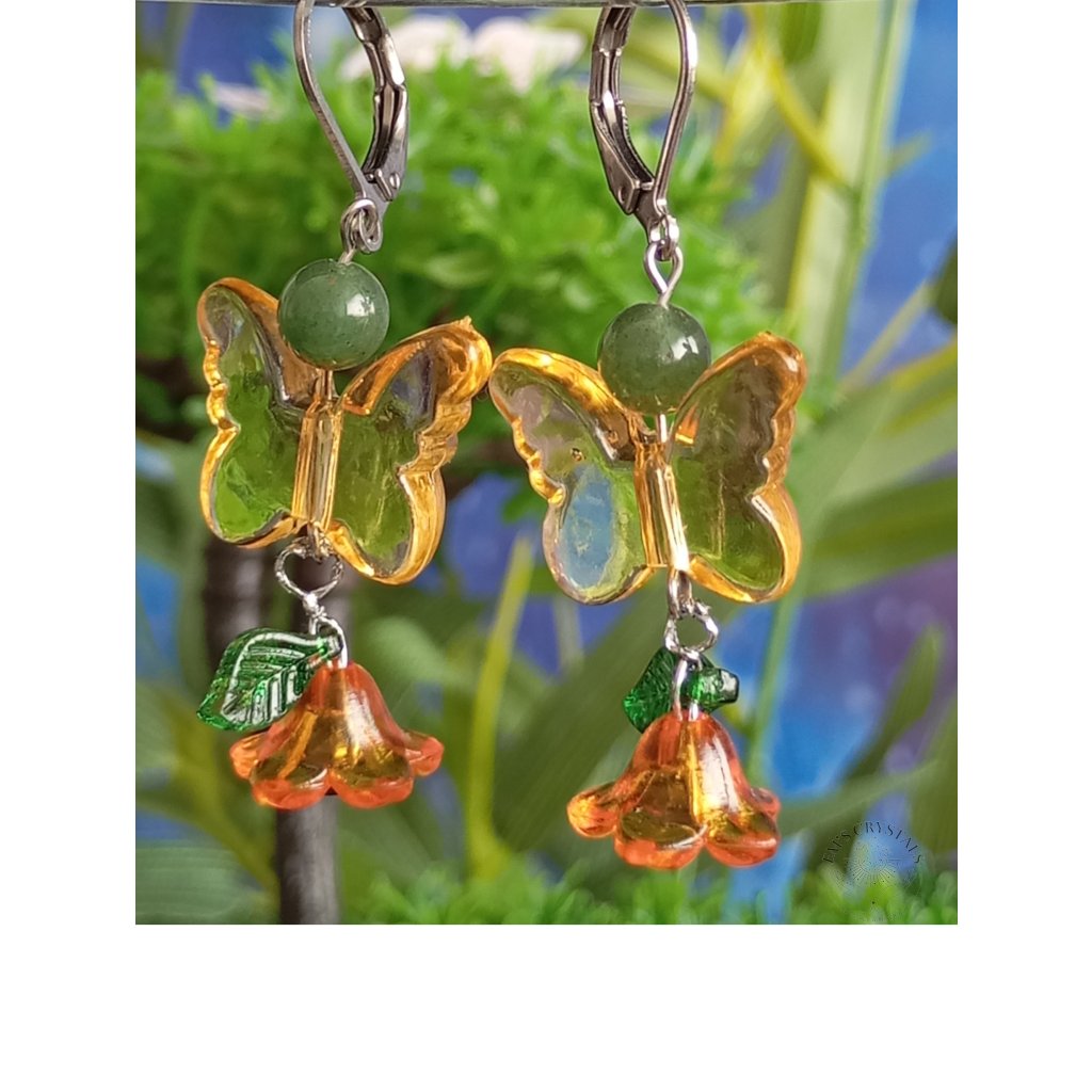 Náušnice Aventurine Sunset přinášejí kouzlo teplého letního večera, kdy se nebe zbarví do zlatavých a oranžových tónů. Skleněný motýl v odstínech žluta a oranže symbolizuje radost a lehkost, zatímco korálek ze zeleného avanturínu přináší harmonii a štěstí. Oranžový květ s hematitovým středem dodává šperkům jiskru a chrání svého nositele. Ideální pro všechny, kdo chtějí ve svém stylu nosit energii slunce i jemnou dotek přírody.