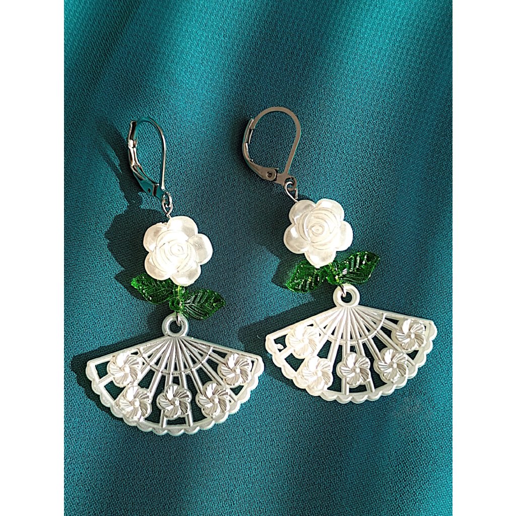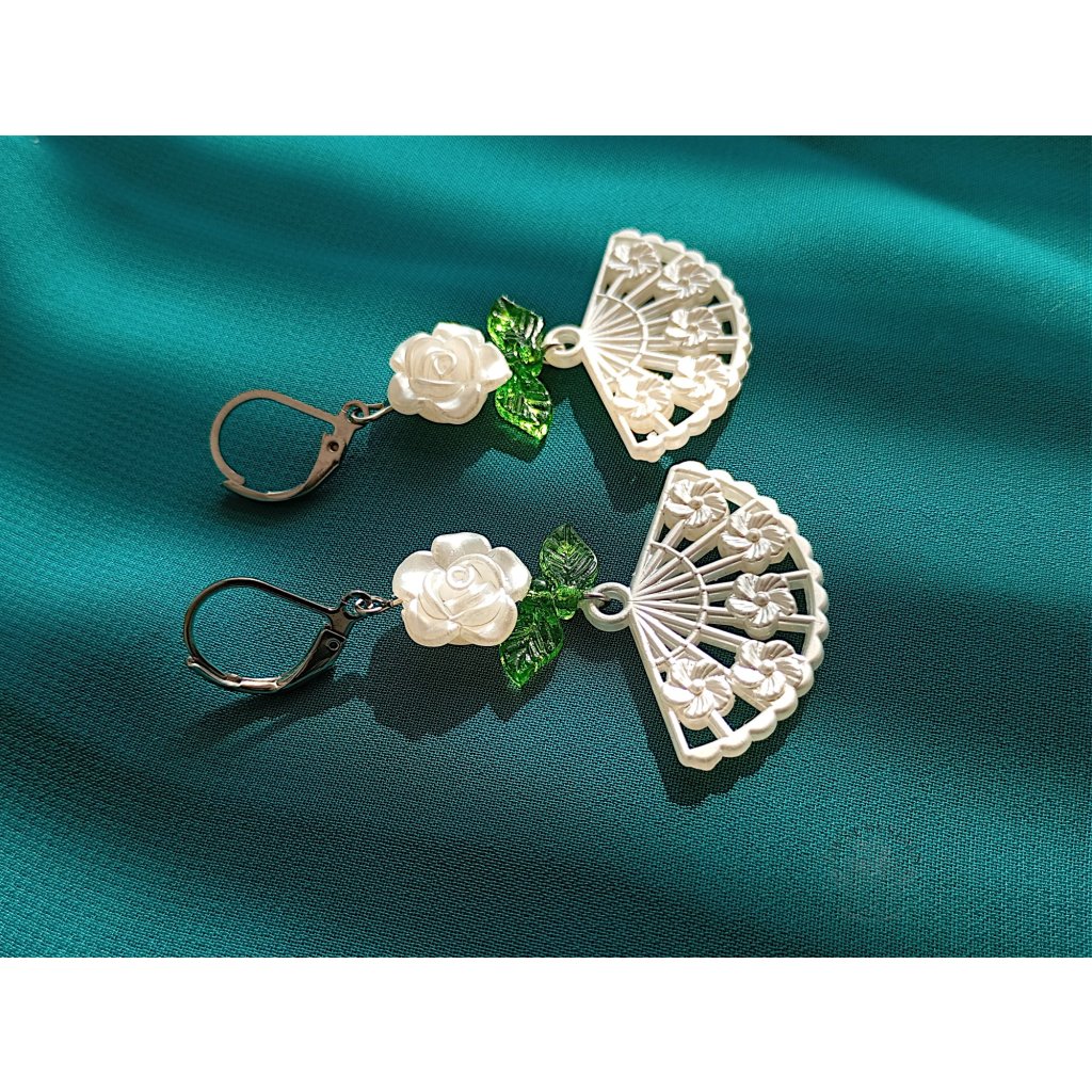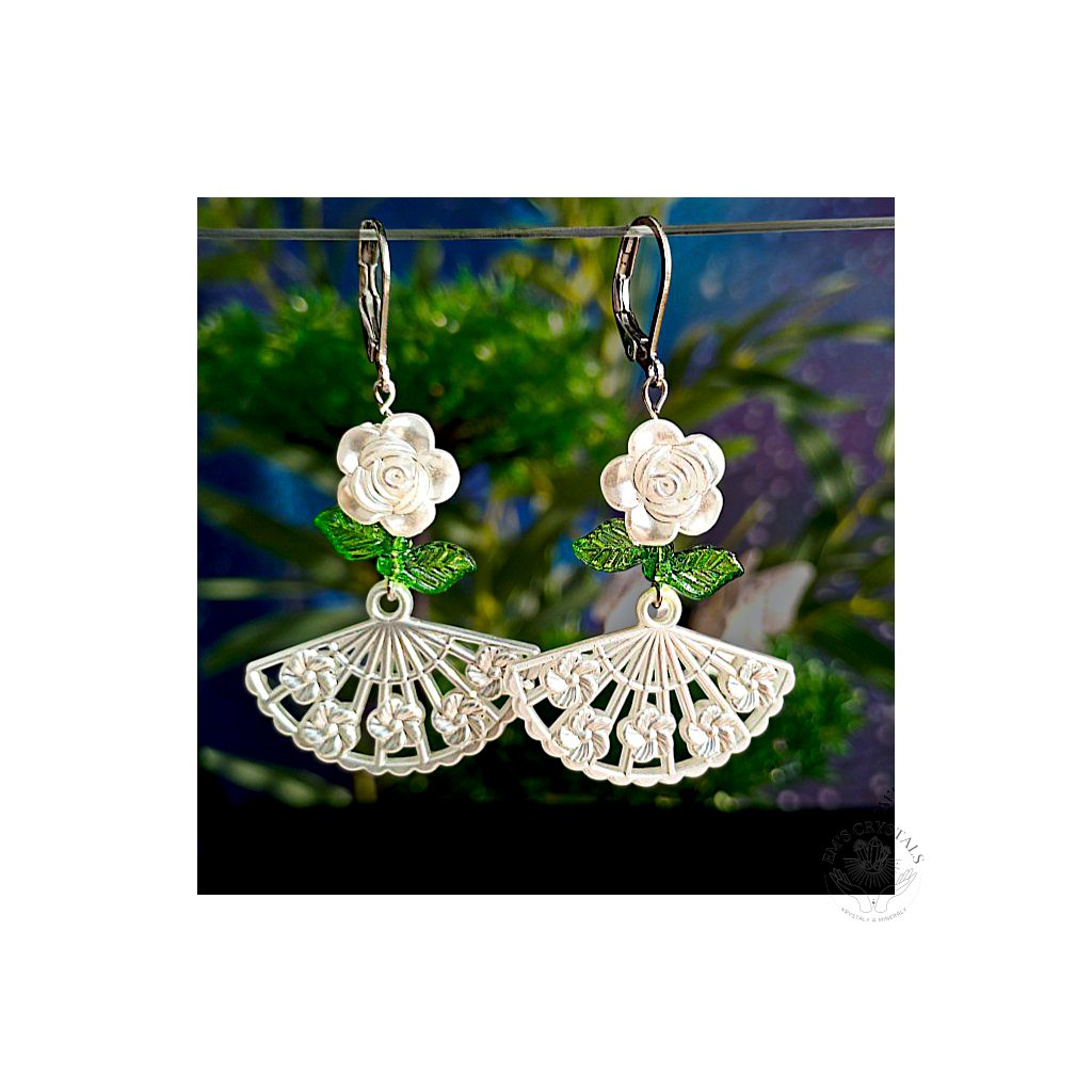 Náušnice z chirurgické oceli, zdobené bílou kytičkou, zelenými lístky a jemným bílým vějířem. Jako by vypadly z plesového sálu dávných časů, kdy se hudba valčíku nesla nocí a vějíře skrývaly tajné pohledy i úsměvy. Šperk, který v sobě nese kouzlo romantiky minulých století.