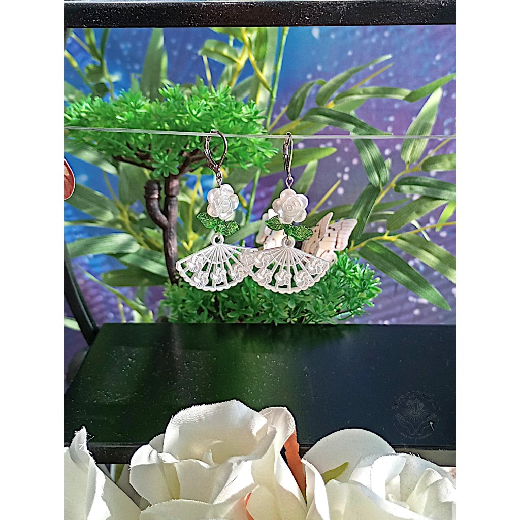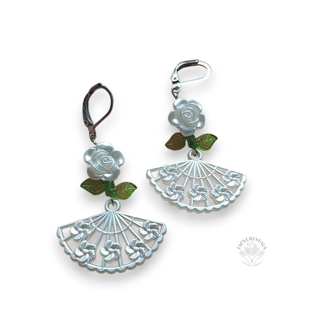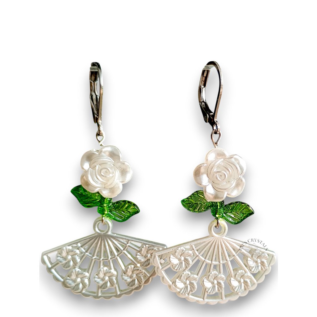 Náušnice z chirurgické oceli, zdobené bílou kytičkou, zelenými lístky a jemným bílým vějířem. Jako by vypadly z plesového sálu dávných časů, kdy se hudba valčíku nesla nocí a vějíře skrývaly tajné pohledy i úsměvy. Šperk, který v sobě nese kouzlo romantiky minulých století.
