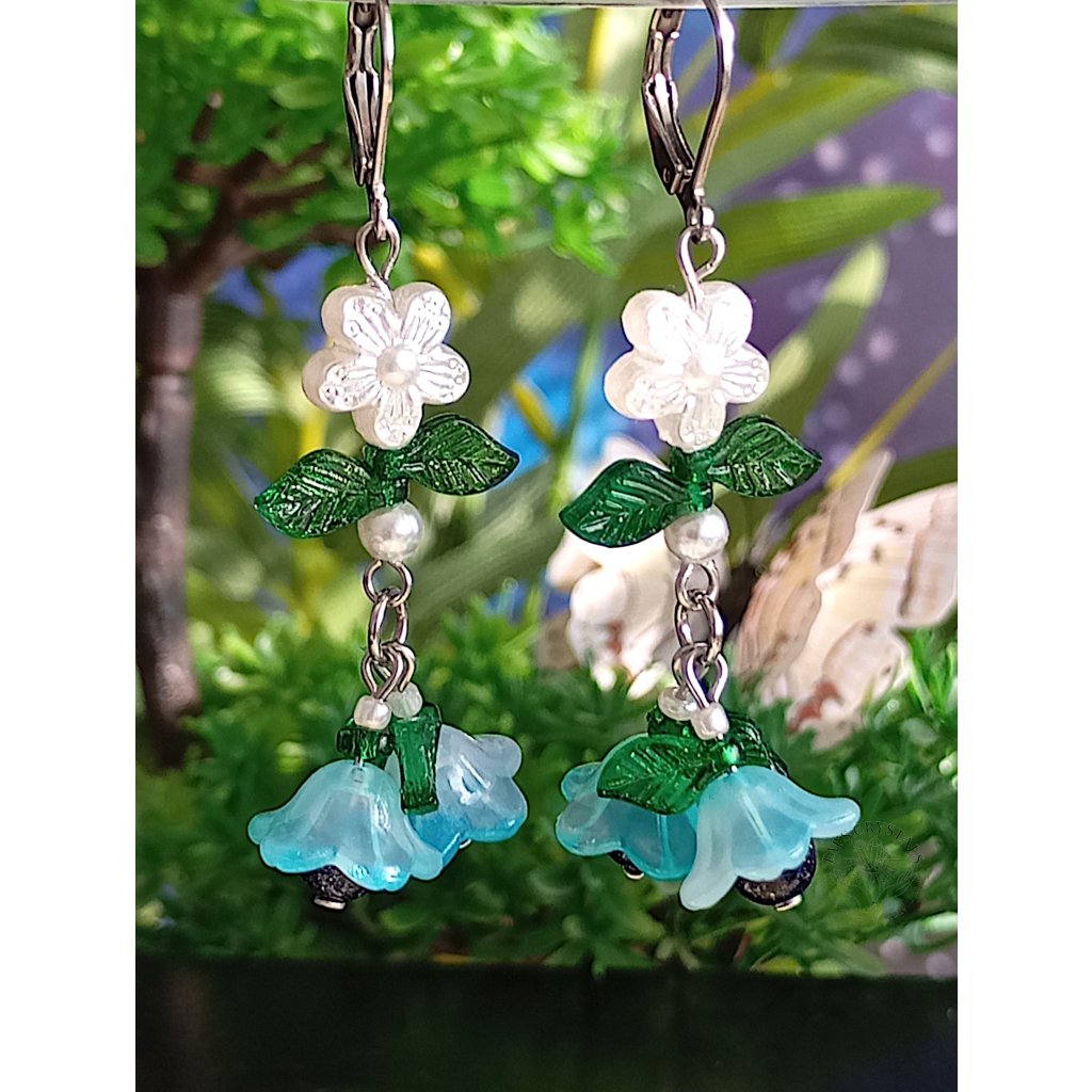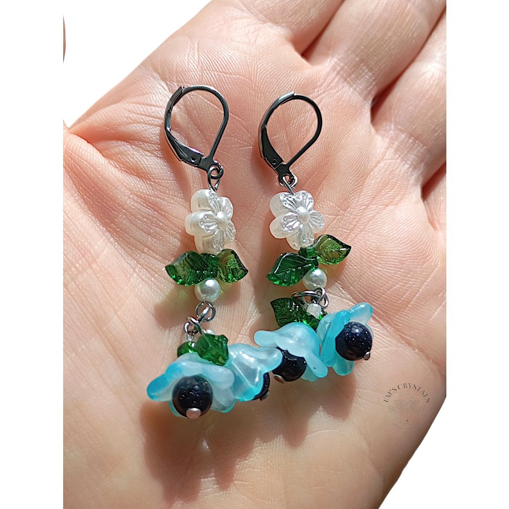 Náušnice z chirurgické oceli, na kterých se něžná bílá kytička a zelené lístky setkávají s modrým zvonkovým kvítkem, jehož srdce tvoří korálek z modrého avanturínu. Tento kámen je symbolem optimismu, štěstí a vnitřní rovnováhy. Jemný šperk, který vnese do tvého dne harmonii přírody i dotek kouzelné zahrady.