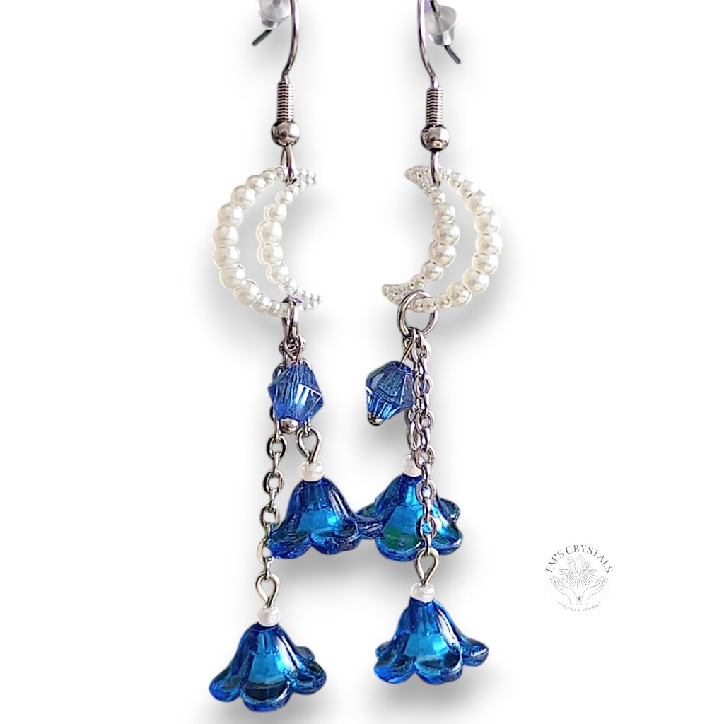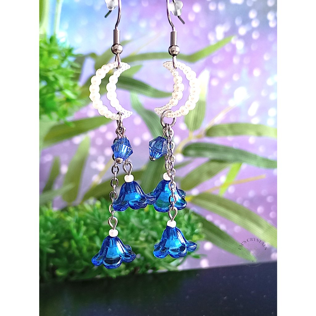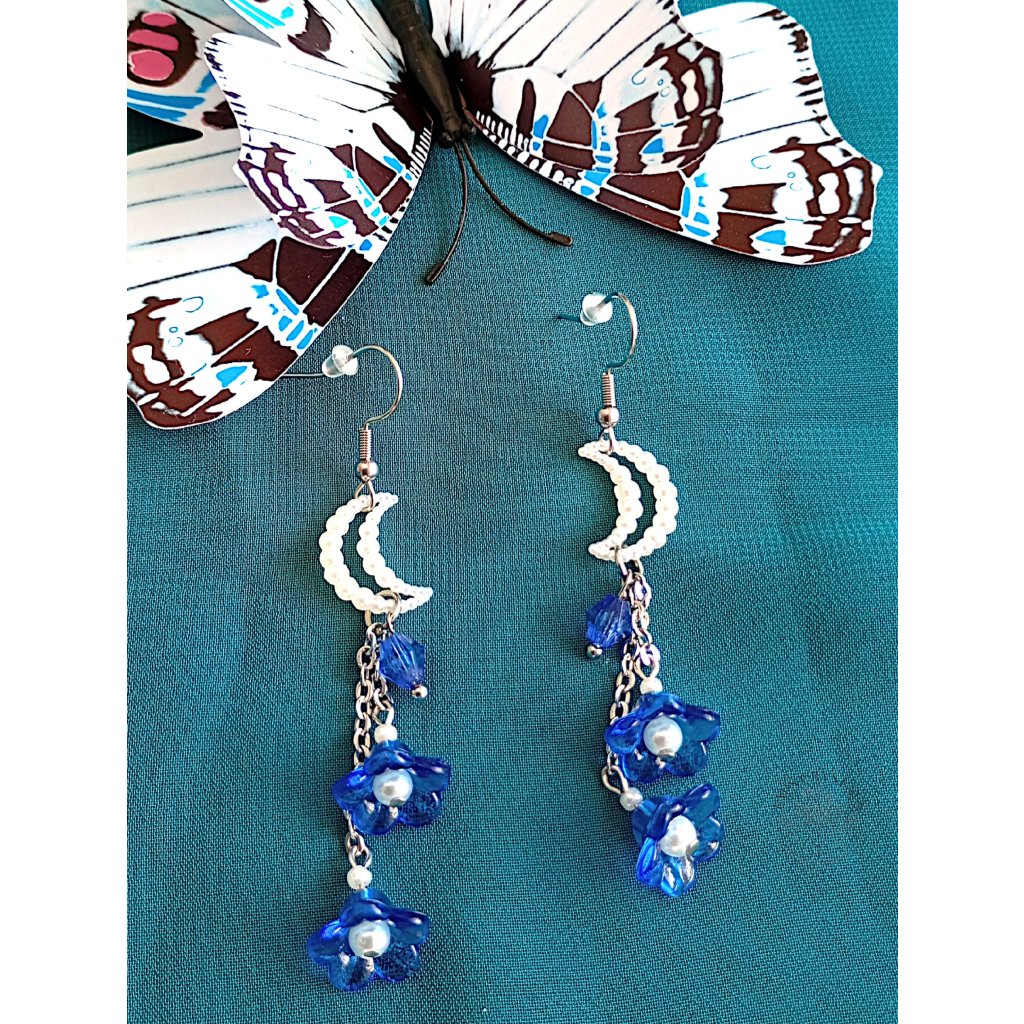 Jako kdyby kousek noční oblohy sestoupil až k vám. Jemné modré květy visí jako kapky měsíční rosy a drahokamový korálek se třpytí jako vzdálená hvězda. Náušnice, které nesou ticho a tajemství nočních hodin, a připomínají krásu neprobádaného vesmíru, kde každý pohled vyvolá sen.