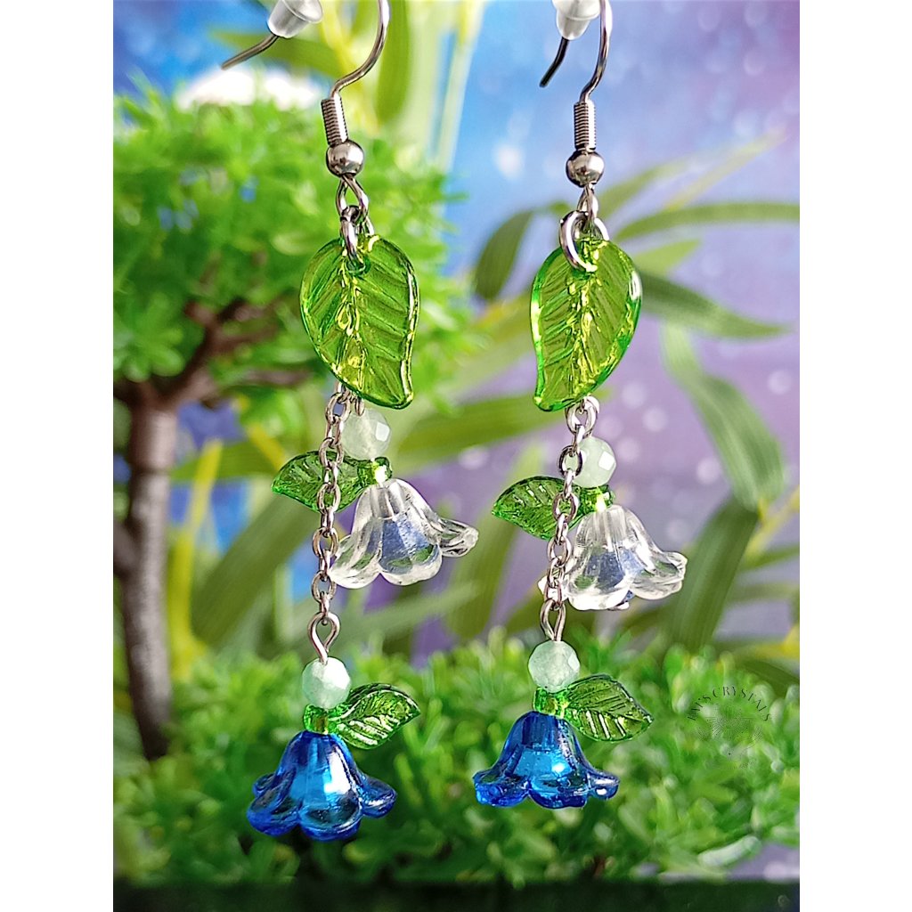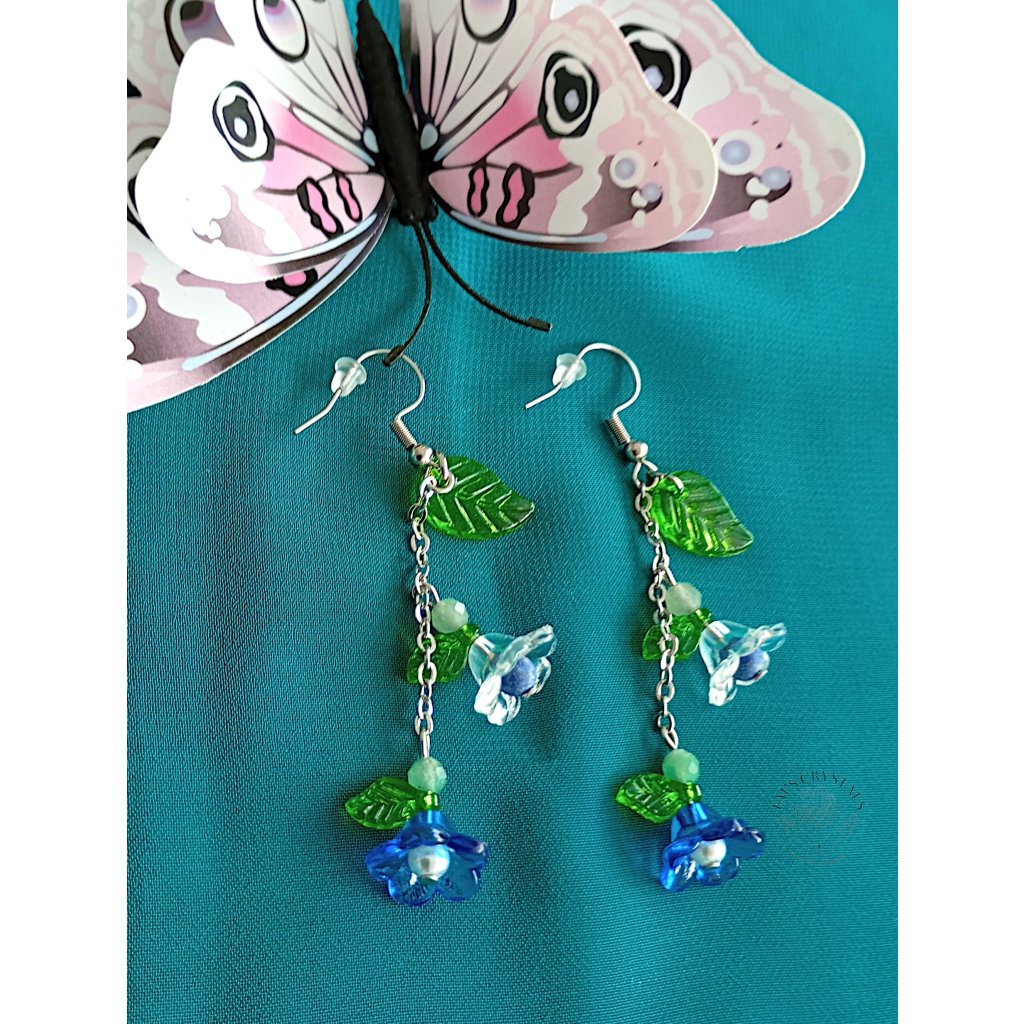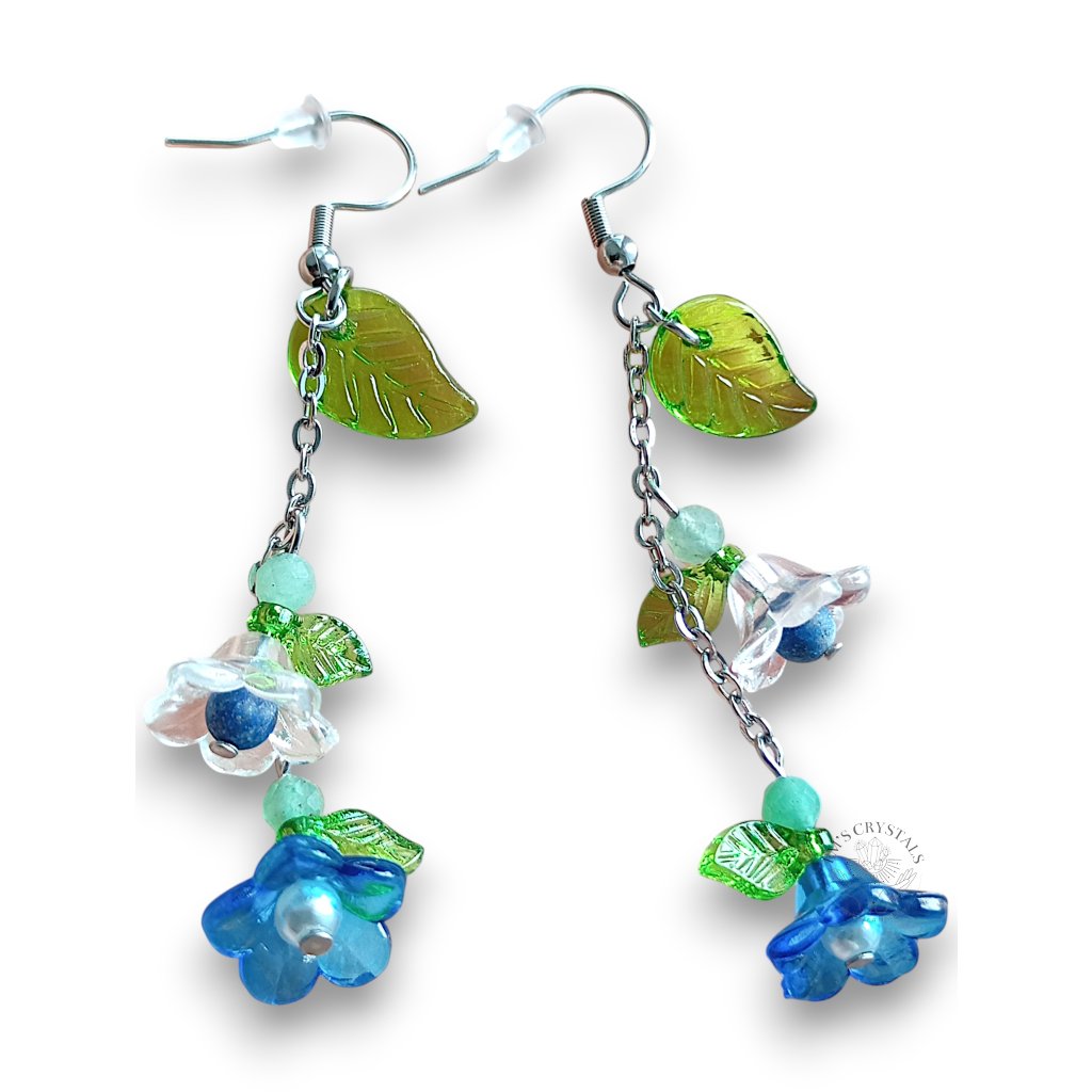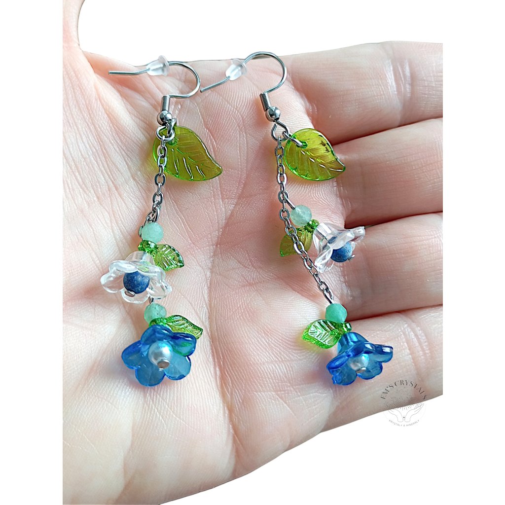 Náušnice z chirurgické oceli na jemném řetízku, kde visí dva květy s průhledným a modrým lístkem, doplněné zelenými lístky a korálky z lapis lazuli a zeleného avanturínu. Lapis lazuli podporuje moudrost a klid, zatímco zelený avanturín přináší štěstí a harmonii. Elegantní a vzdušný šperk, který evokuje kouzlo modrých květů v letním vánku.