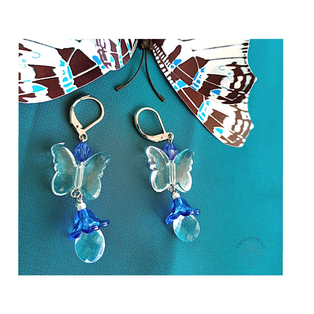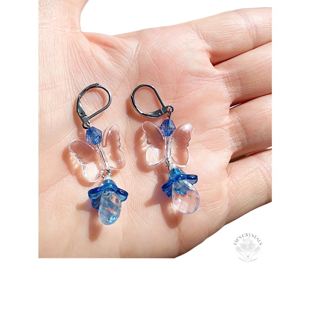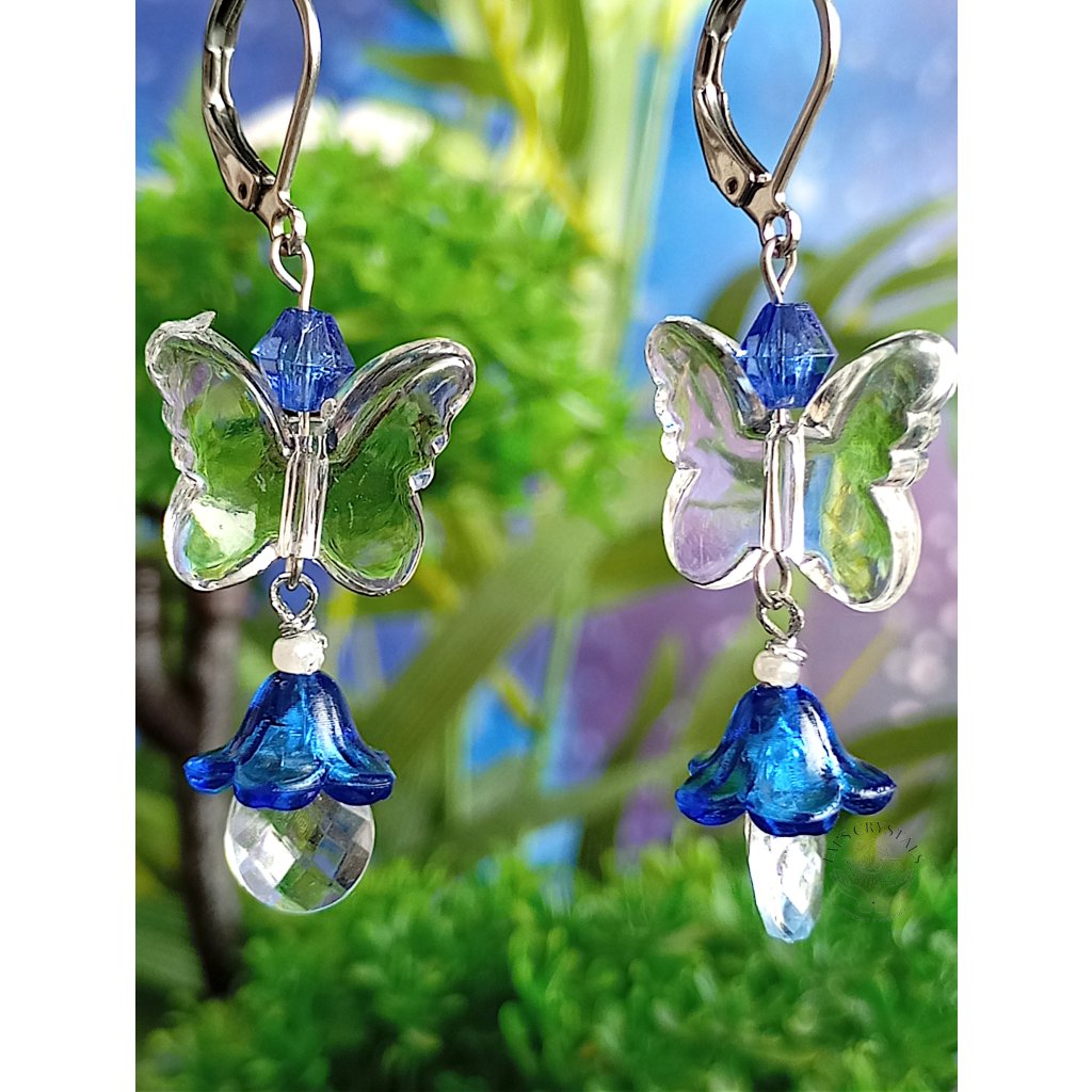 Náušnice z chirurgické oceli se skleněným motýlkem, na kterém visí modrý zvonkový květ s broušenou skleněnou kapkou v srdci. Jemné jako dotek vílího křídla, tento šperk přináší kouzlo jarního lesa a třpyt tajemných kapek rosy.