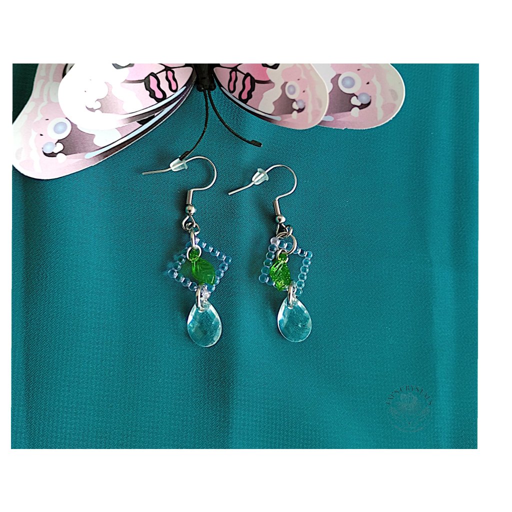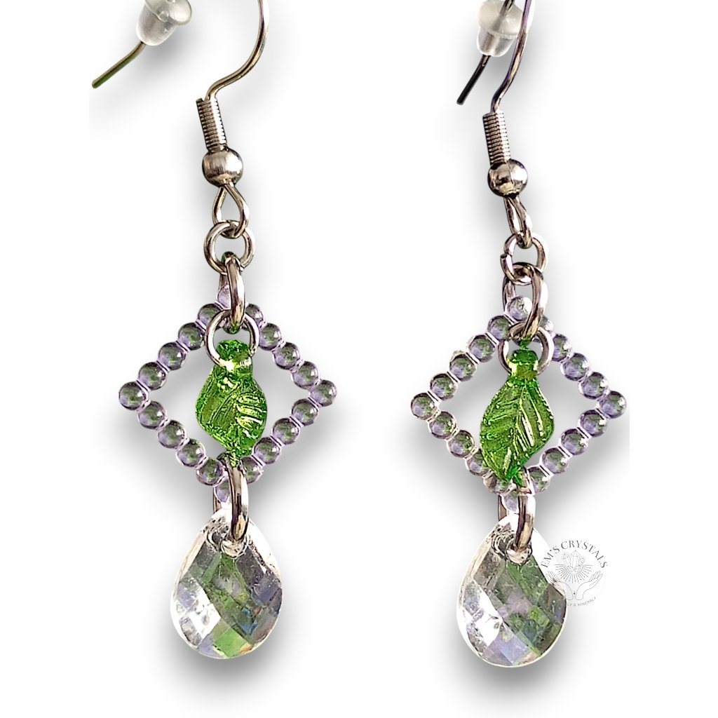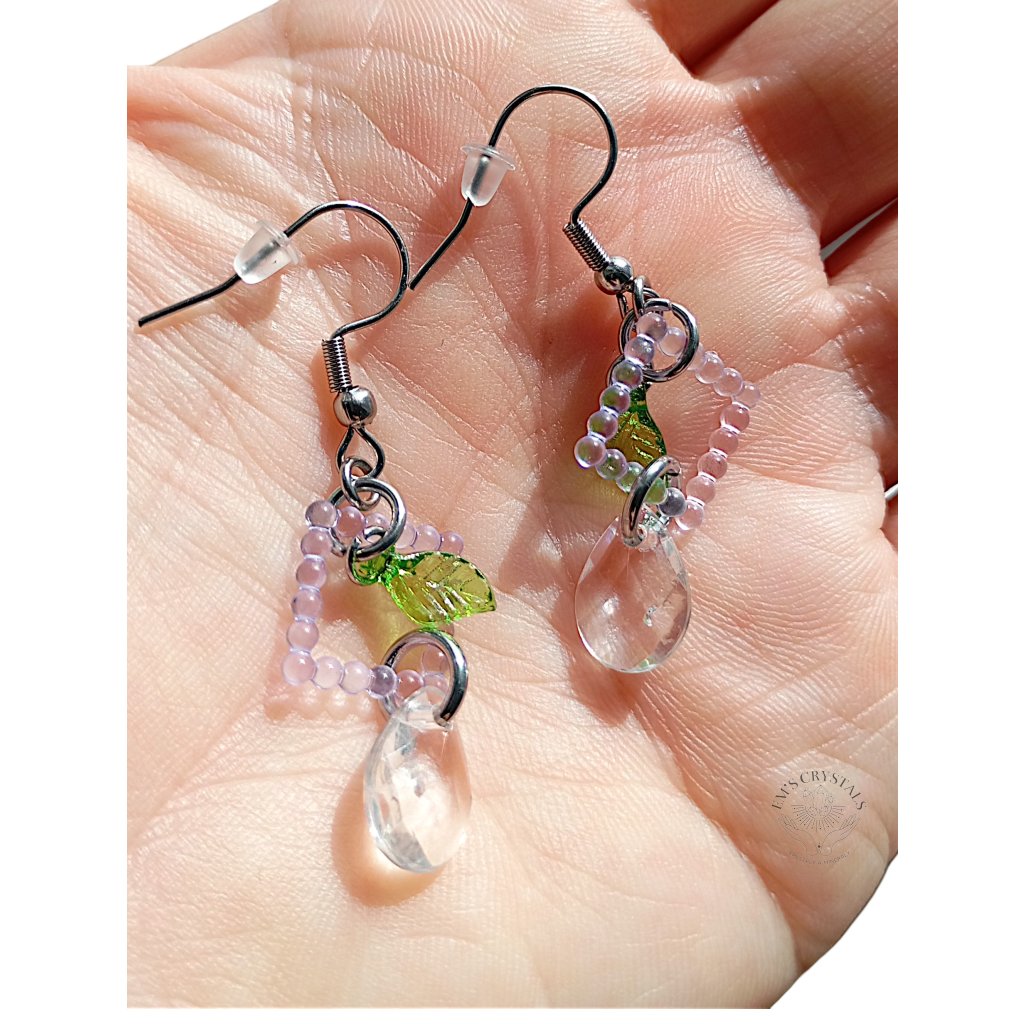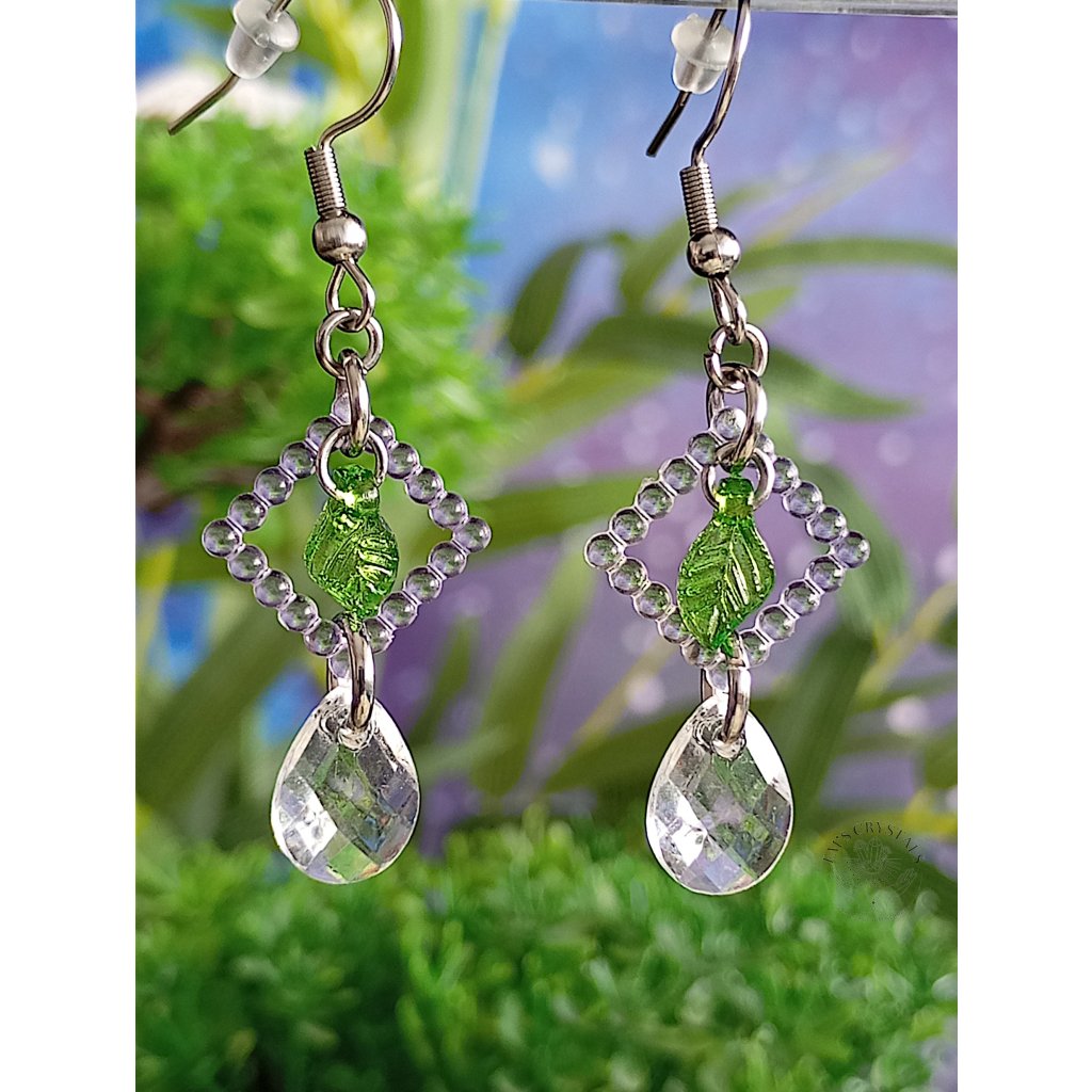 Náušnice z chirurgické oceli s jemnou broušenou skleněnou kapkou, která odráží světlo jako ranní rosa, doplněné svěžím zeleným lístkem. Elegantní a lehké, s nádechem přírodní čistoty a lesní svěžesti.