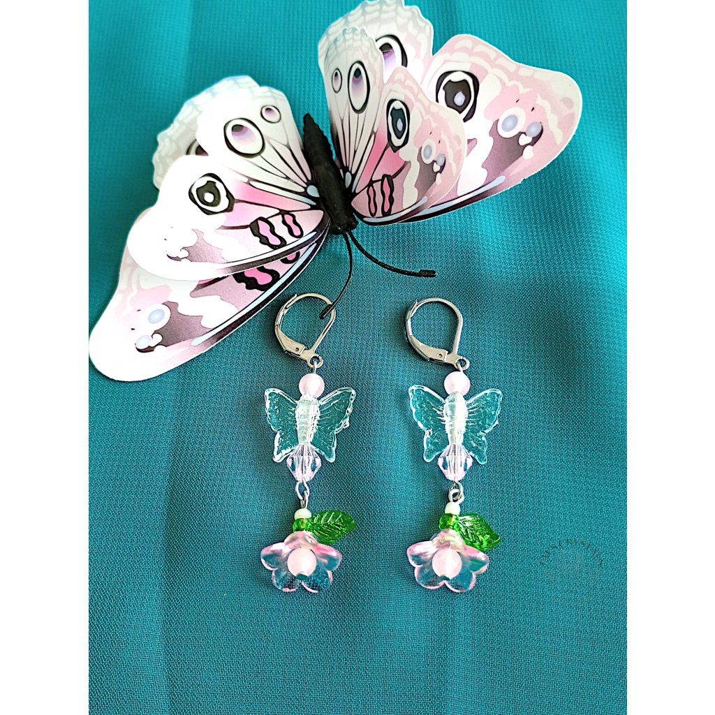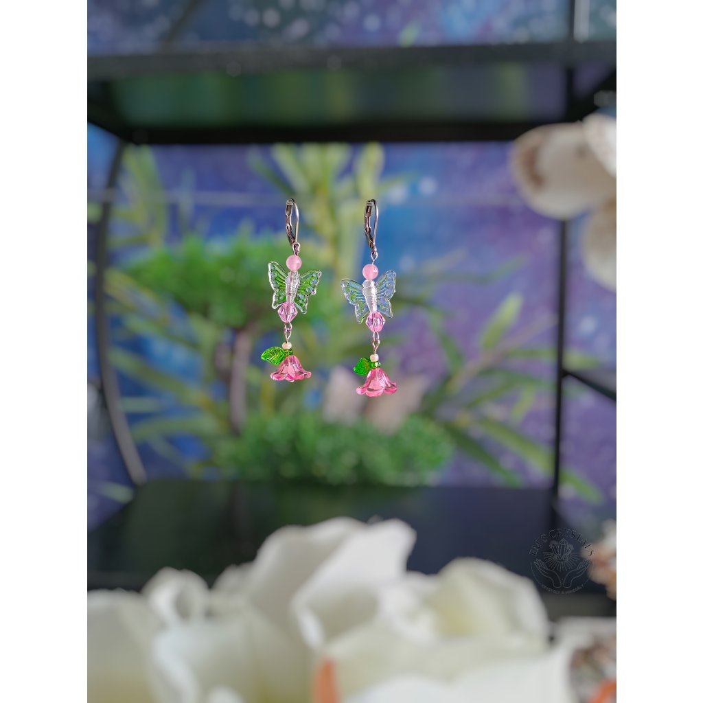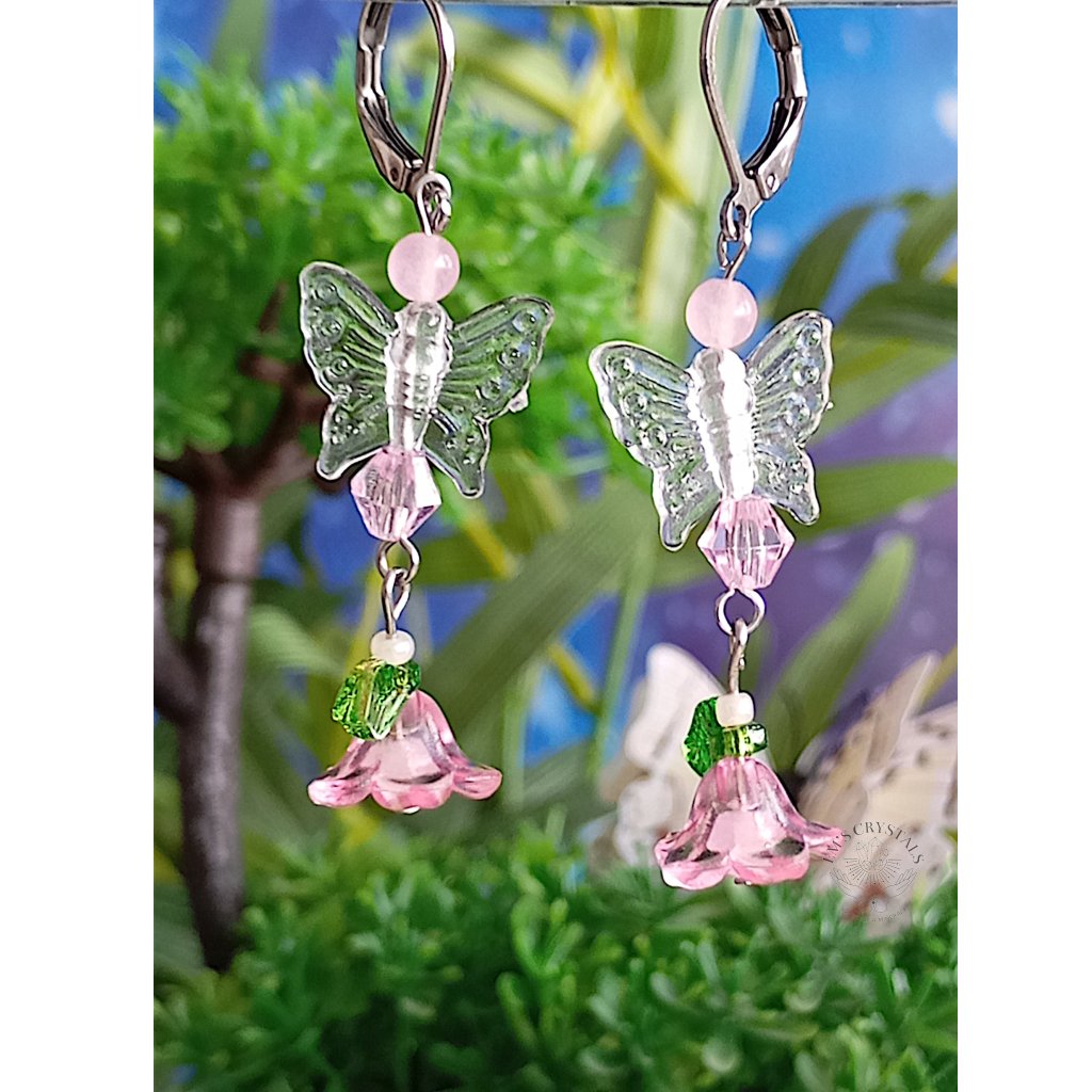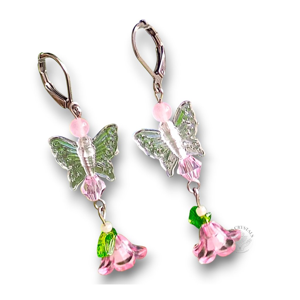 Náušnice z chirurgické oceli s průhledným motýlkem, na kterém visí jemný růžový květ se srdcem z růžového achátu a drobnými zelenými lístečky. Velmi něžné a sladké, jako pohlazení jarního vánku plného lásky a něhy