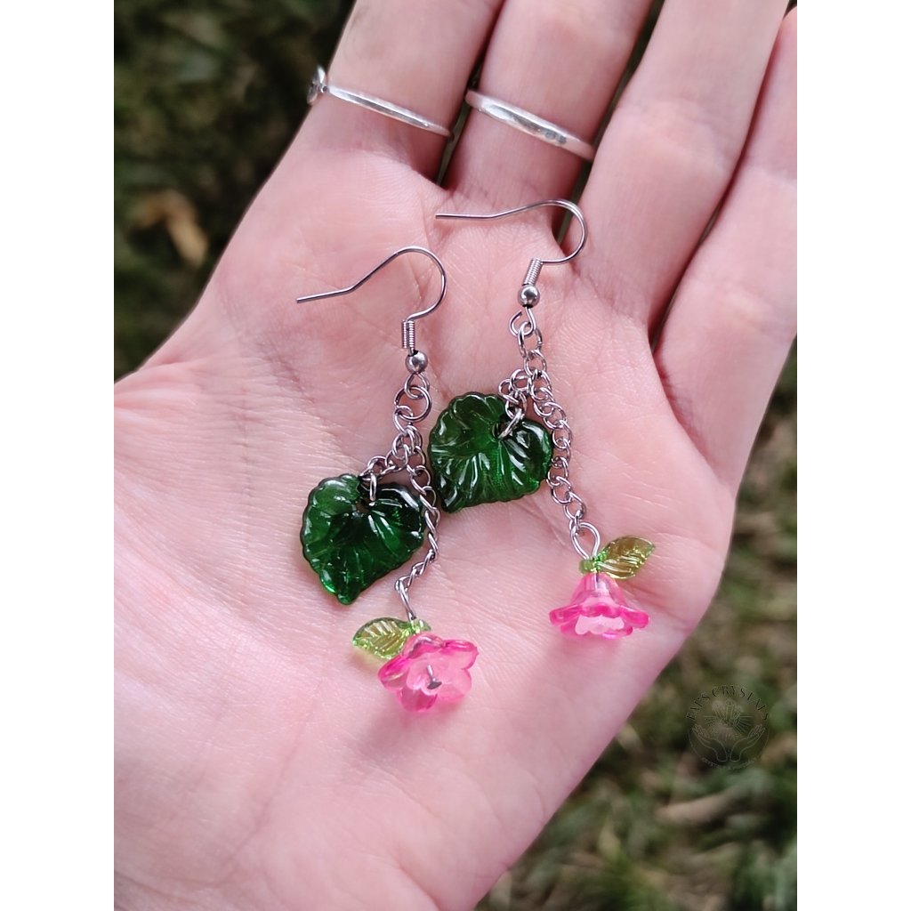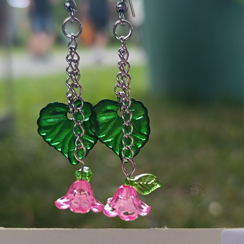 Náušnice z chirurgické oceli s dvěma drobnými kvítky ve tvaru zvonečků, doplněné zelenými lístečky. Šperk jako z lesní pohádky.