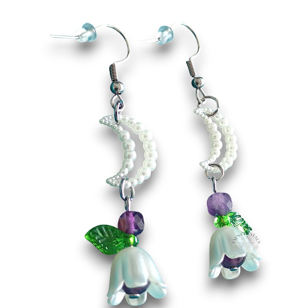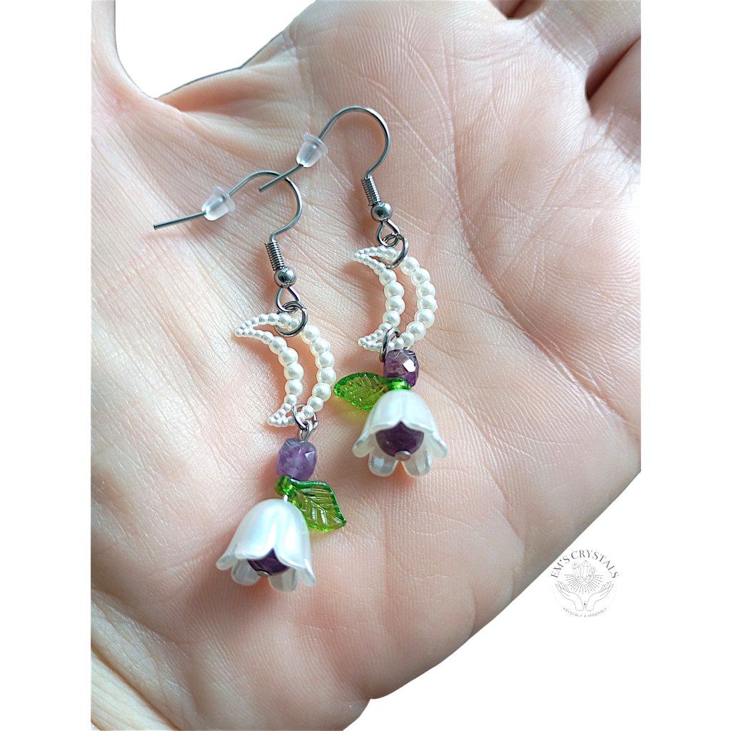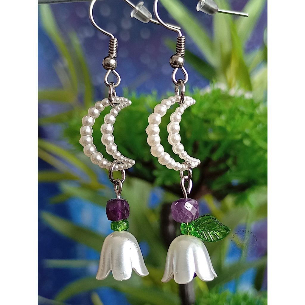Náušnice, ve kterých se na něžném bílém měsíčku rozvíjí drobný zvonek s ametystovým srdcem, obklopený svěžími zelenými lístky. Tento šperk nese jemnou poezii měsíčního světla a něžné lásky přírody, jako by šeptal příběhy z tajemných nocí plných snů a kouzel