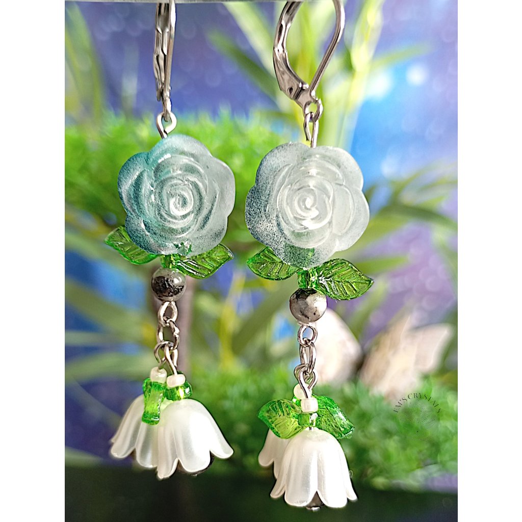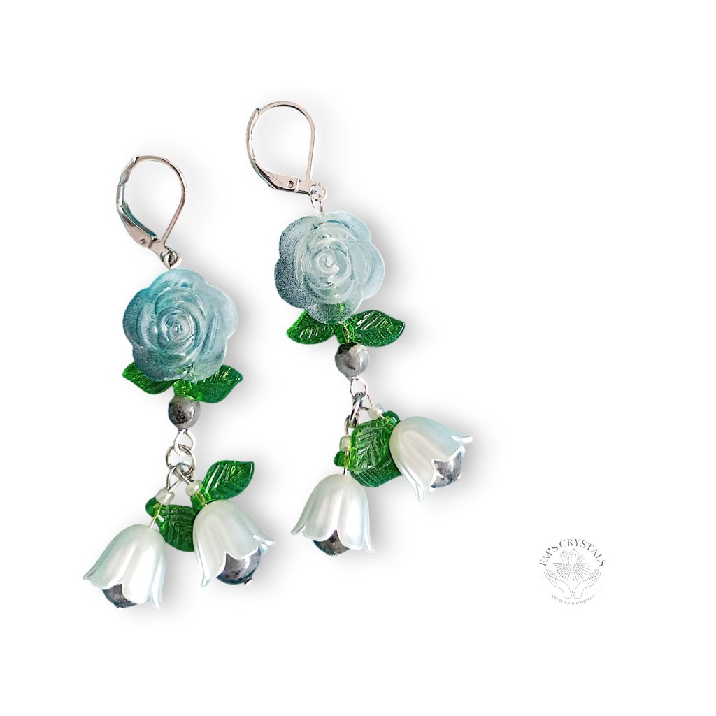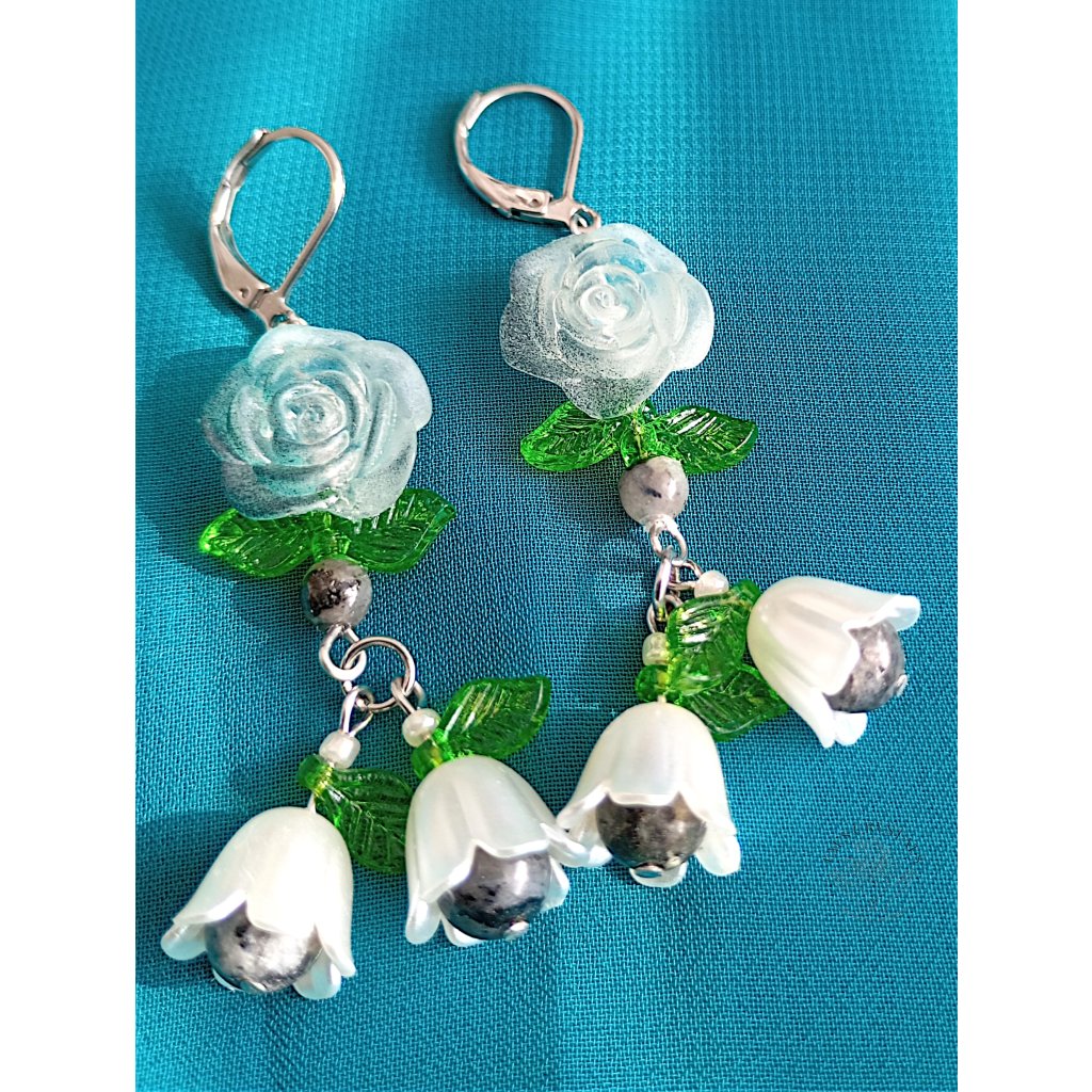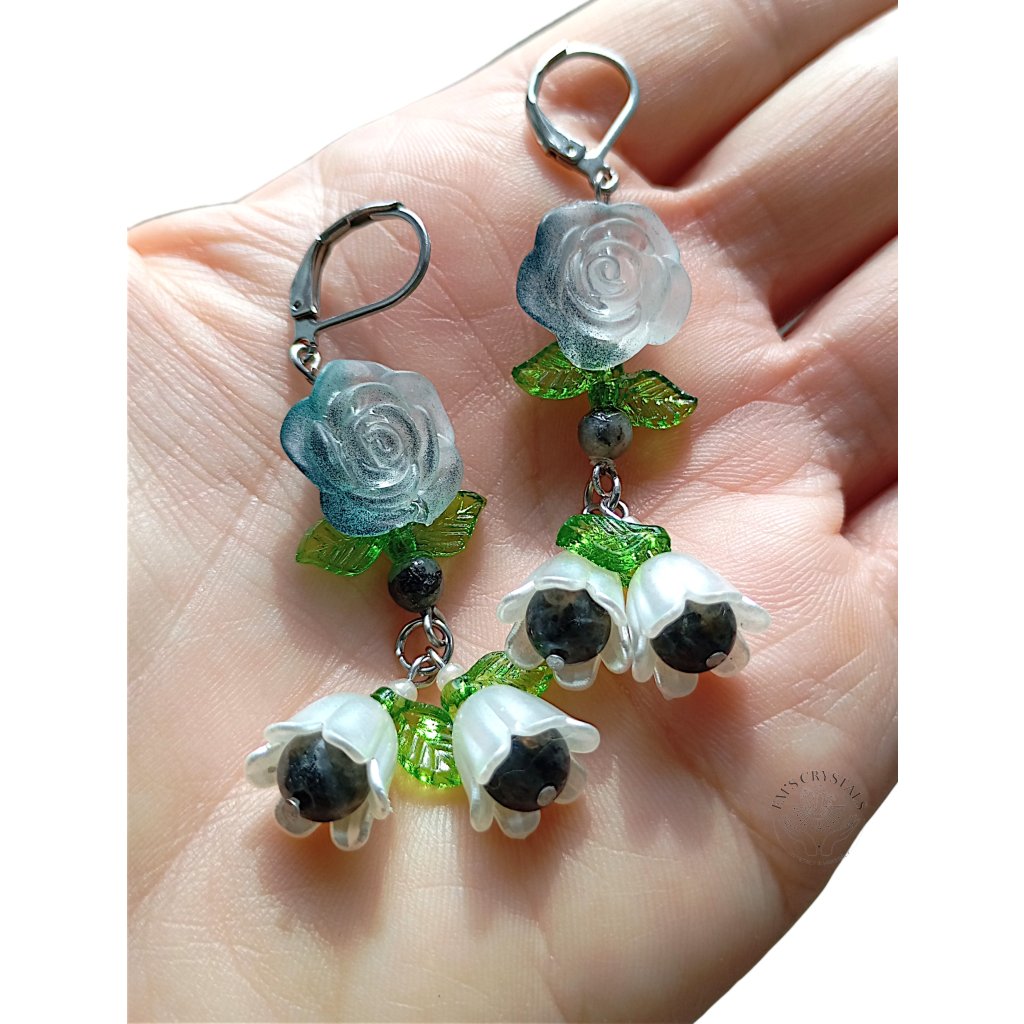 Náušnice z chirurgické oceli zdobené šedým květem, zelenými lístky a bílými zvonkovými kvítky, jejichž srdce tvoří korálek z minerálu larvikit. Larvikit, často přezdívaný „kamenem modrého ohně“, přináší ochranu, vnitřní sílu a harmonii. Jemný a elegantní šperk připomínající mlhavé rány ranního lesa, kde se probouzí světlo i tajemství.