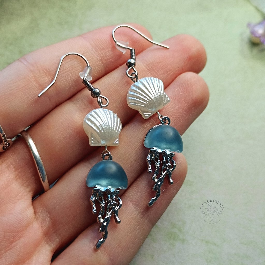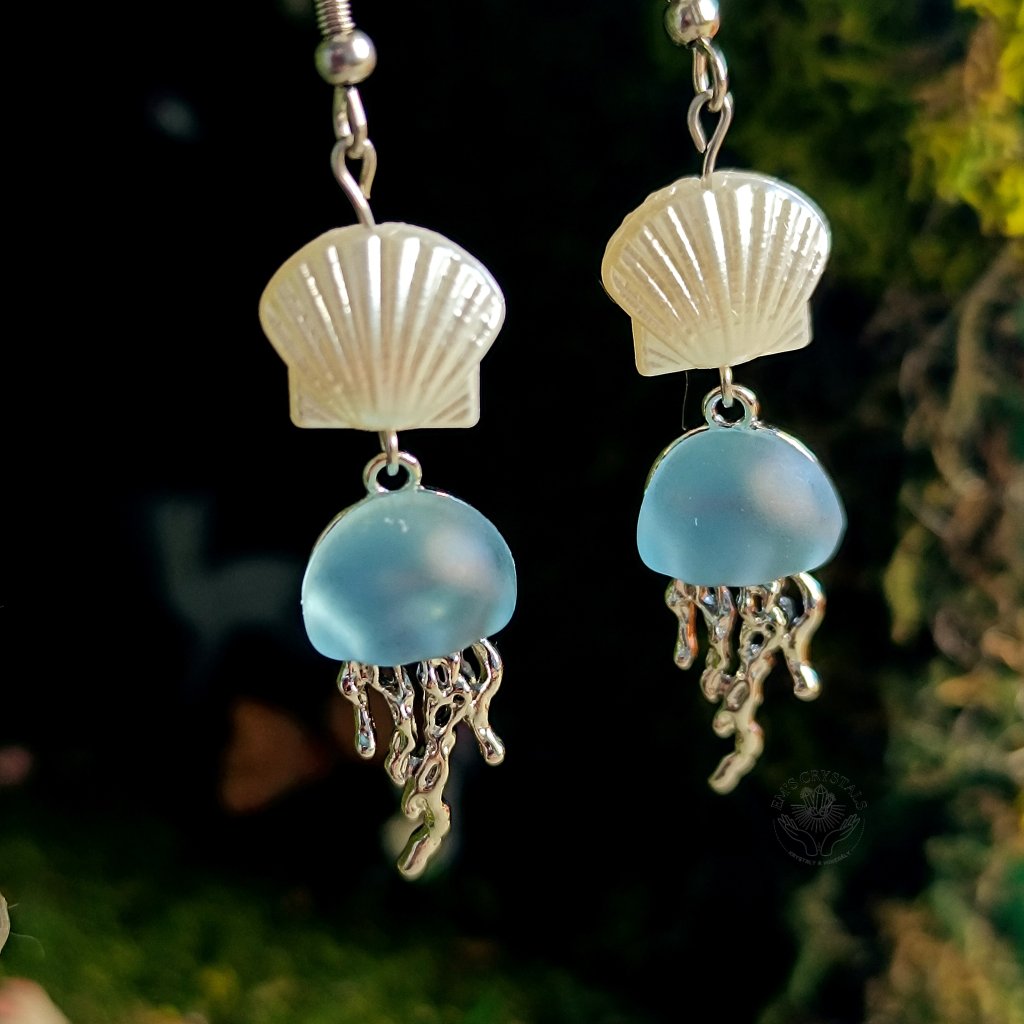Náušnice z chirurgické oceli s drobnými modrými medúzkami a jemnými mušlemi. Jako poklad z mořského dna unášený zpěvem sirén a šuměním vln. Ideální pro milovnice tajemna, oceánu a šperků s příběhem.