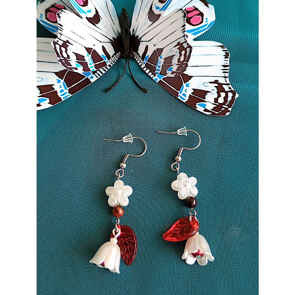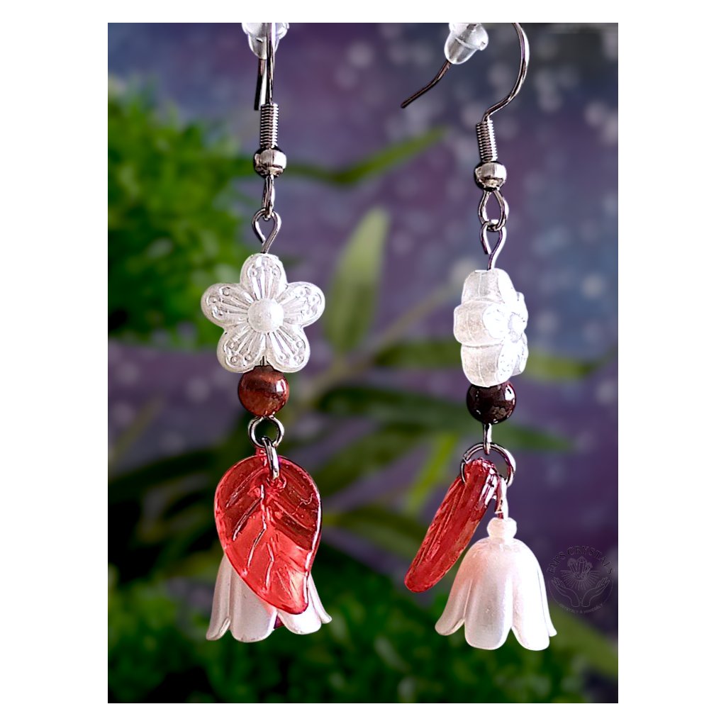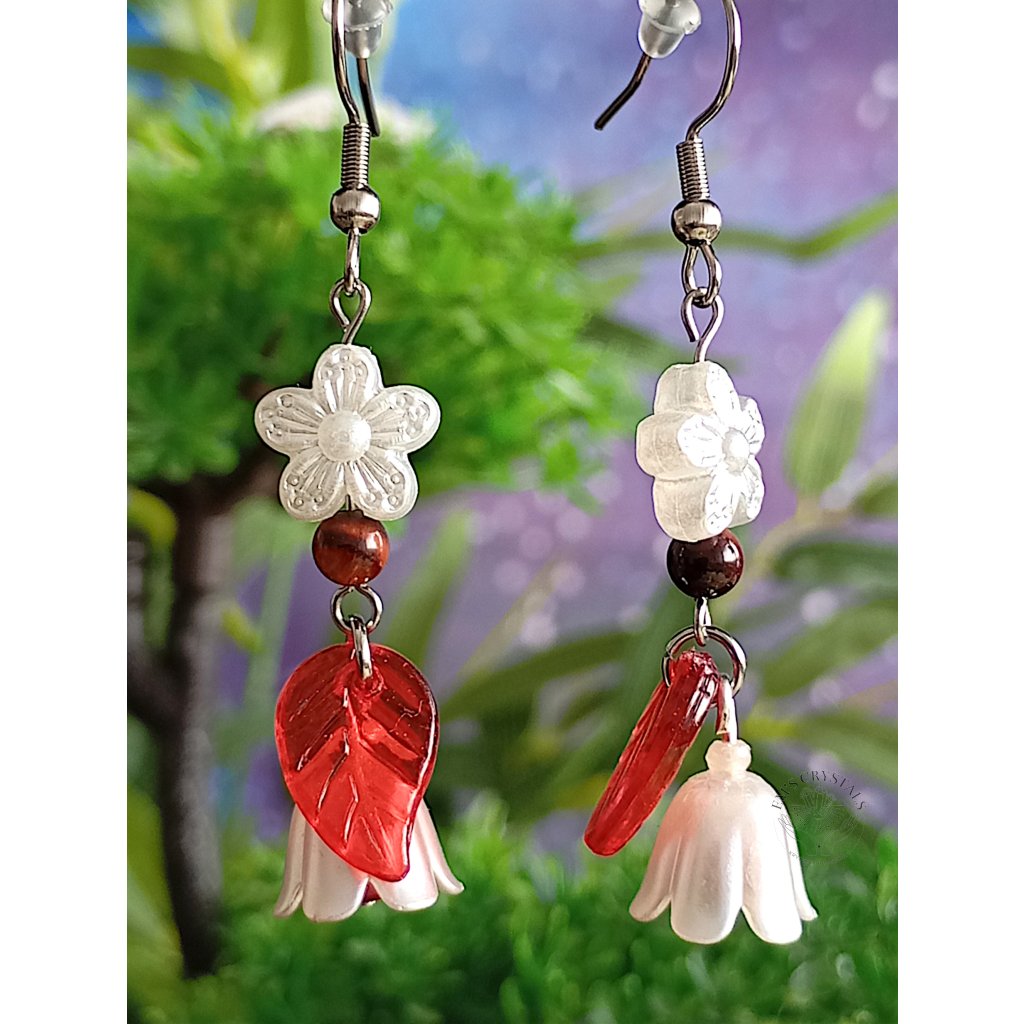 Náušnice s bílým kvítkem a červeným lístkem doplněné korálkem z býčího oka, který přináší ochranu, odvahu a sílu do každého dne. Tento šperk spojuje kontrast čistoty a vášně, jako oheň a sníh, a dodává svému nositeli jistotu a vnitřní rovnováhu.