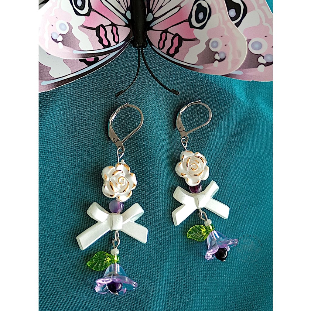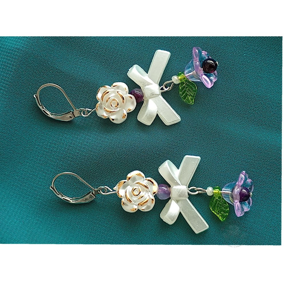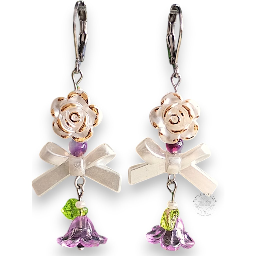 Náušnice z chirurgické oceli, kde bílý květ se zlatými okraji zdobí elegantní mašlička a fialový květ s ametystovým korálkem uprostřed. Ametyst přináší klid a ochranu, zatímco kombinace zlatých detailů a jemných květů vytváří sofistikovaný šperk plný harmonie a krásy.