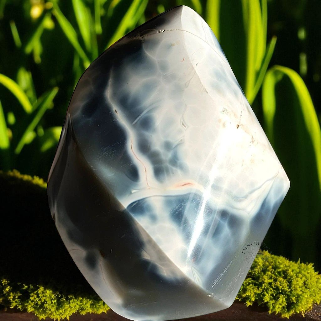 Orca achát je odrůda Chalcedonu, která se vyskytuje na Madagaskaru a krystalizuje v masové formaci. Tento kámen má jedinečné barvy šedé a modré s bílými skvrnami, napodobující vzory a barvy kosatky (odtud jeho pojmenování).