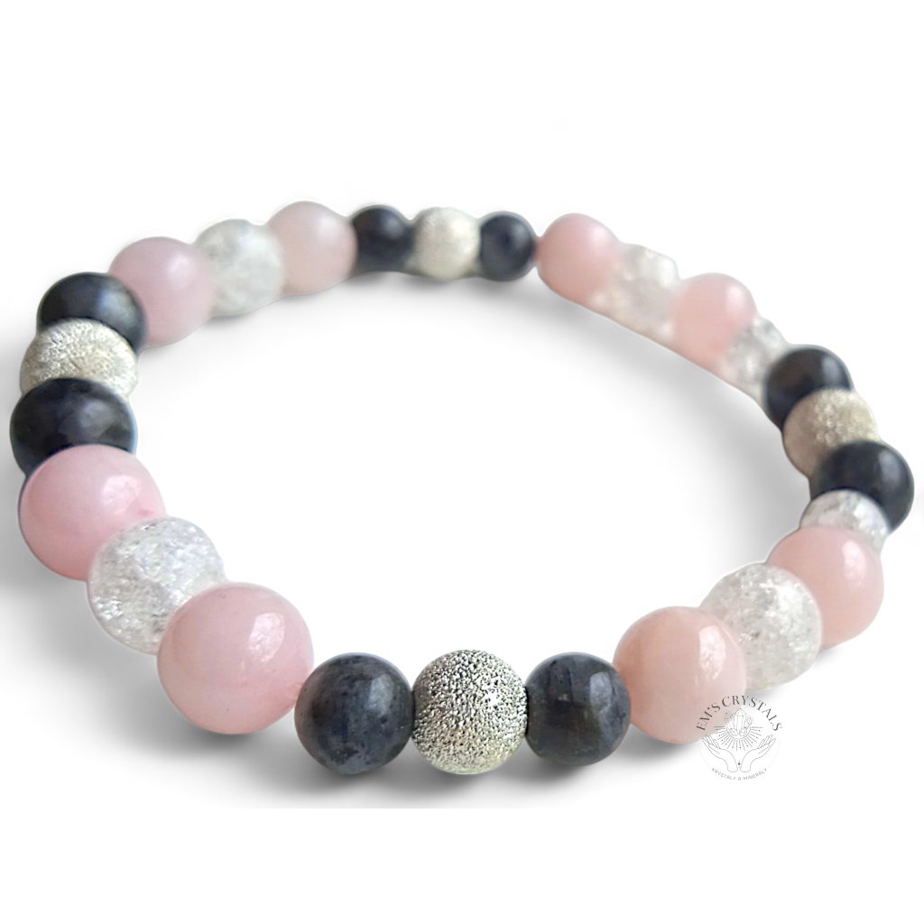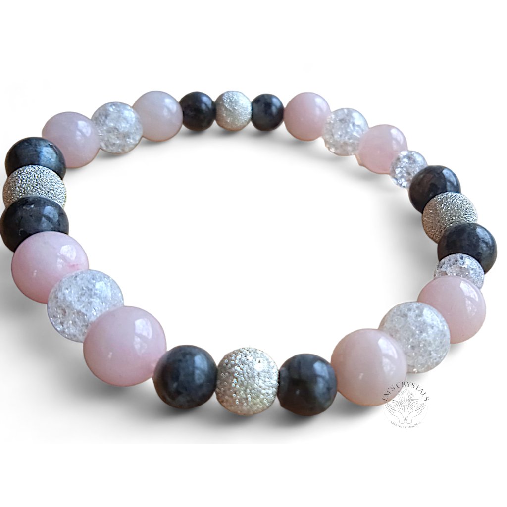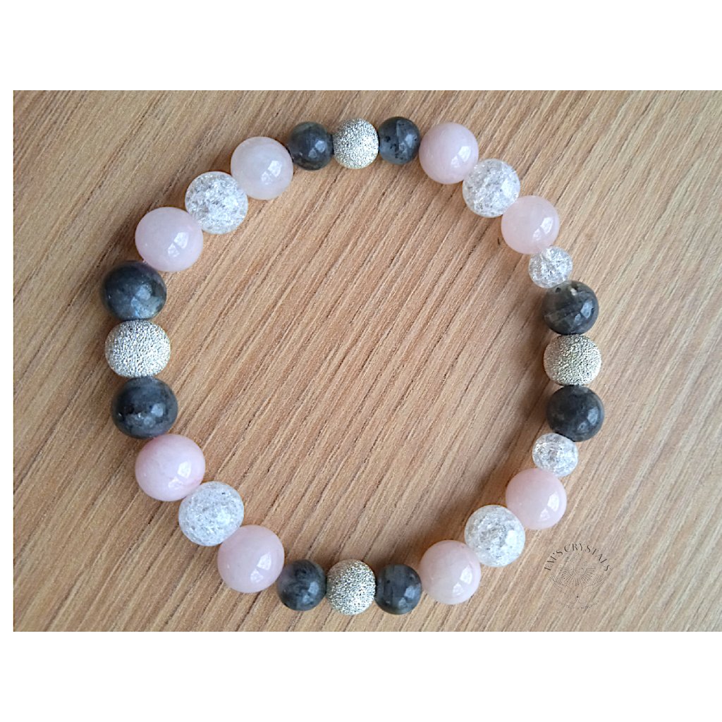 Objevte kouzlo tohoto jedinečného náramku, který spojuje jemnost růženínu, mystiku larvikitu a čistotu křišťálu. Elegantní stříbrné komponenty dodávají náramku luxusní vzhled.