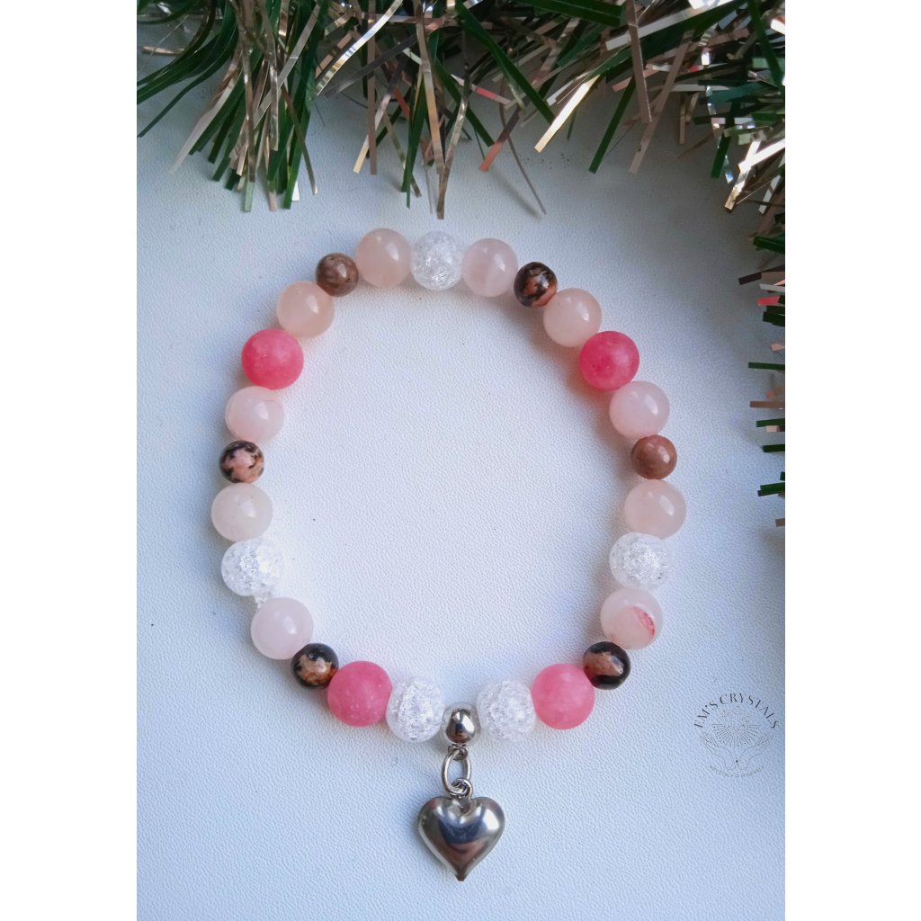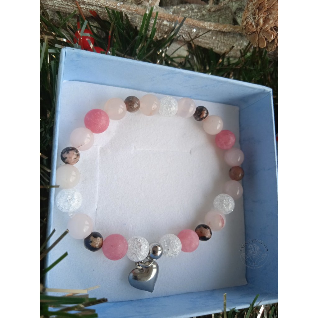Náramek obsahuje minerály: růženín, rodonit, achát barvený růžový, křišťál praskaný