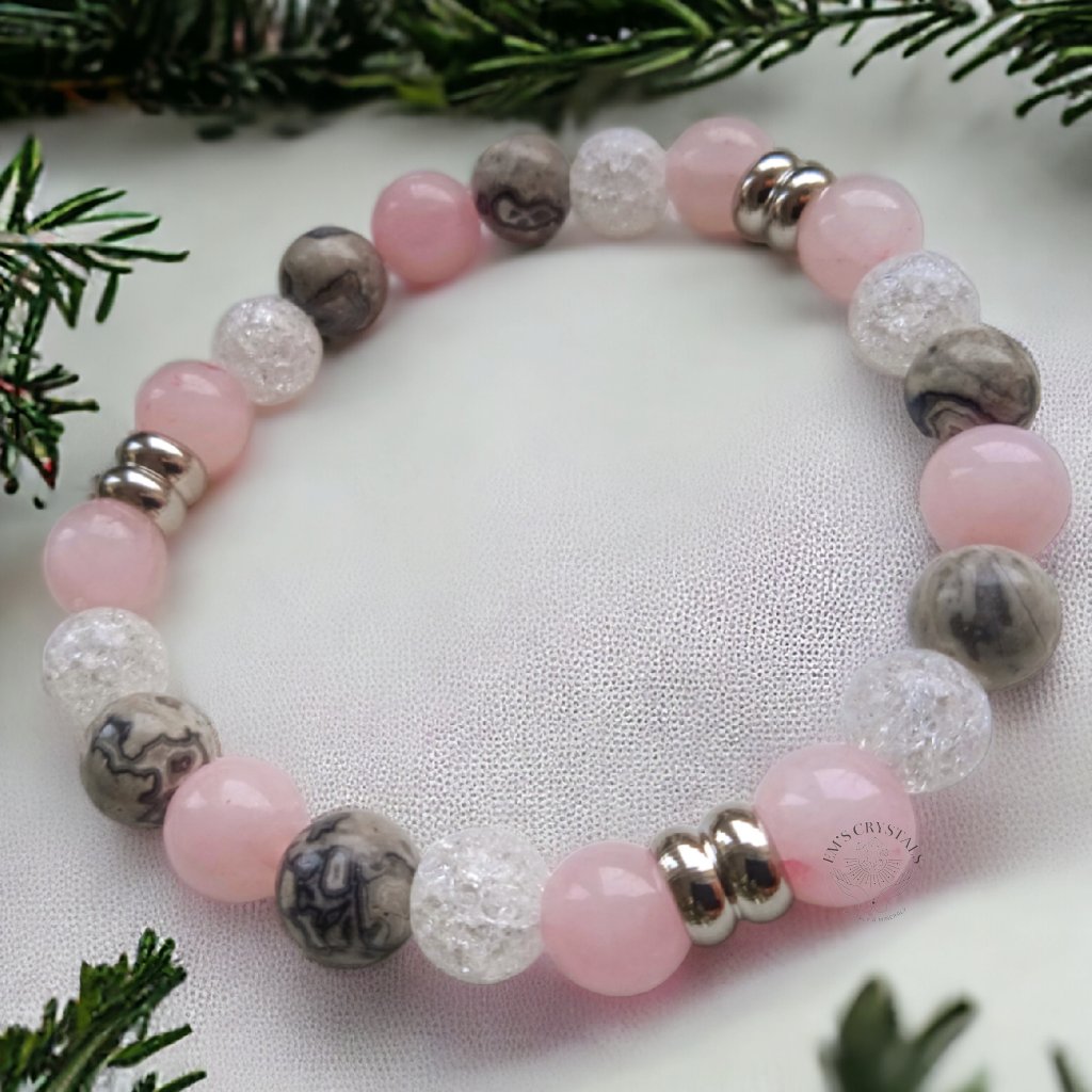 Náramek obsahuje minerály: růženín, jaspis picaso, křišťál praskaný