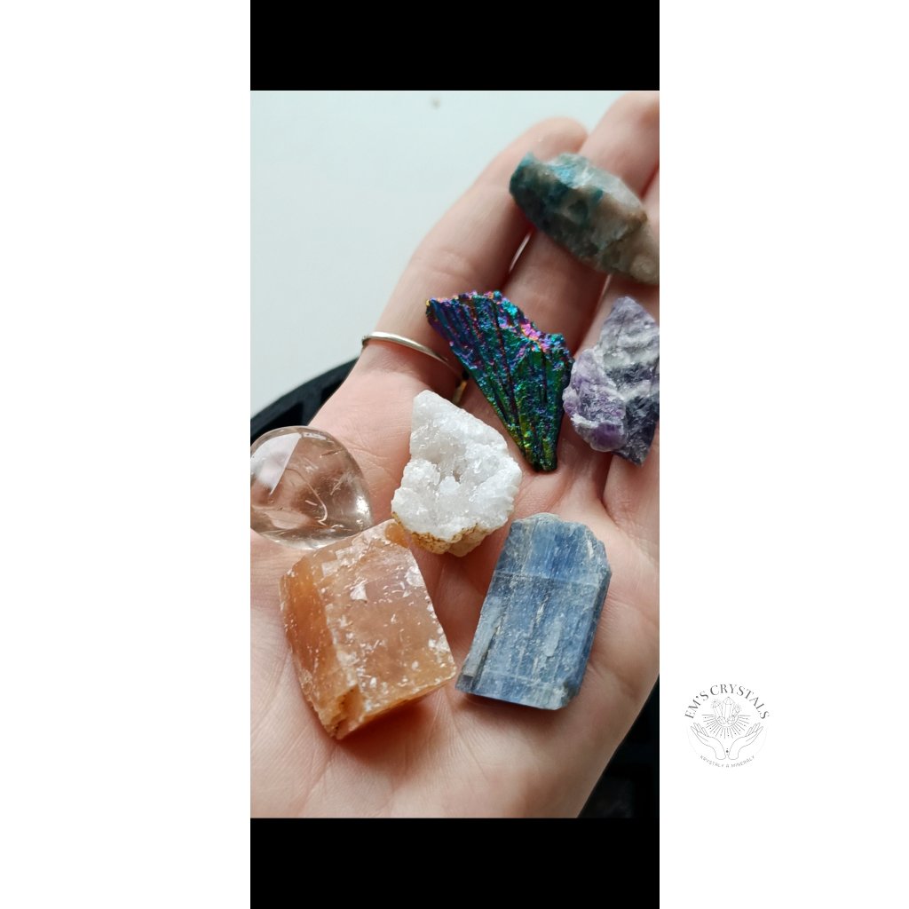 Tato jedinečná sada obsahuje 13 pečlivě vybraných minerálů v surové i tromlované podobě. Mezi nimi se nacházejí nejen oblíbené klasické kameny, ale i vzácnější exempláře, které nejsou běžně součástí podobných sad – například rodochrozit, optický kalcit či topaz.