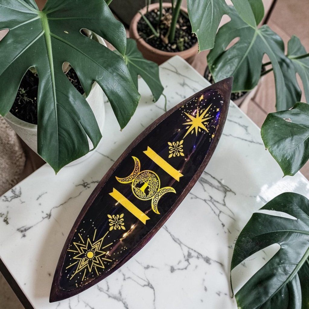 Vneste do svého rituálního koutku sílu měsíčních fází. Tato ručně opracovaná miska z indického mangového dřeva je uvnitř zdobena odolným smaltem s motivem Trojitého měsíce. Tento prastarý symbol představuje tři aspekty ženské energie – Pannu, Matku a Stařenu – a cyklus života, smrti a znovuzrození. Je ideální jako bezpečný a stylový podklad pro vykuřování, pálení vonných kuželů nebo jako oltářní miska pro vaše krystaly a talismany. Doplňte svou sbírku o tento jedinečný kousek. Spojení hřejivého mangového dřeva a chladivého smaltu s motivem Trojitého měsíce vytváří dokonalý kontrast. Tato miska je navržena tak, aby se stala srdcem vašeho oltáře nebo meditačního prostoru. Je odolná, lehká a každým pohledem vám připomene magii měsíčních cyklů. Perfektní dárek pro každou moderní čarodějku i milovníka orientálního stylu.