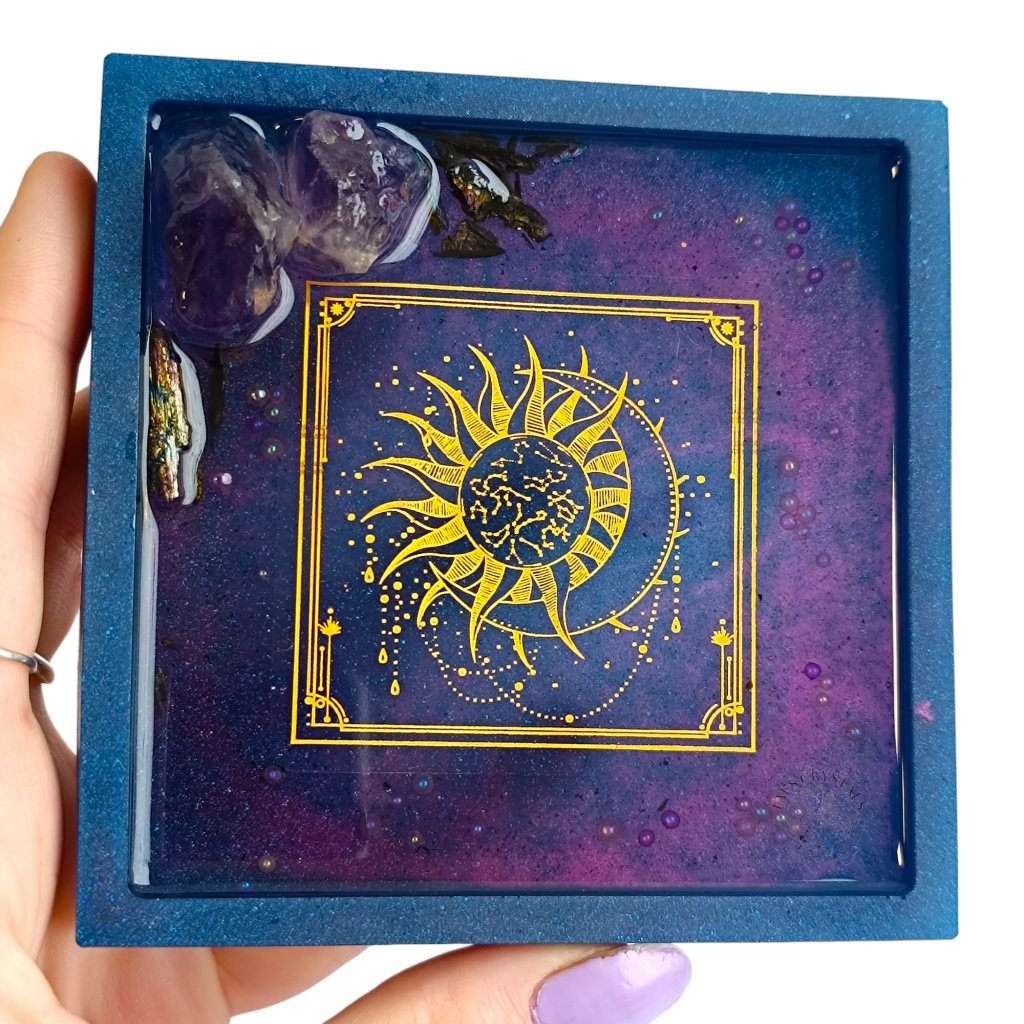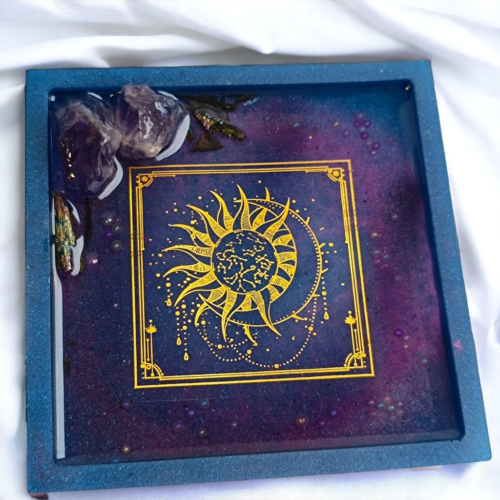 Tácek, ať už je vystaven jako samostatné umělecké dílo nebo jako posvátný prostor pro vaše oblíbené krystaly a poklady, naplní vaše okolí nebeskými energiemi slunce, měsíce a krystalů. Umístěte jej na svůj oltář nebo konferenční stolek, abyste ve svém domově vyvolali pocit úžasu a kosmického spojení.