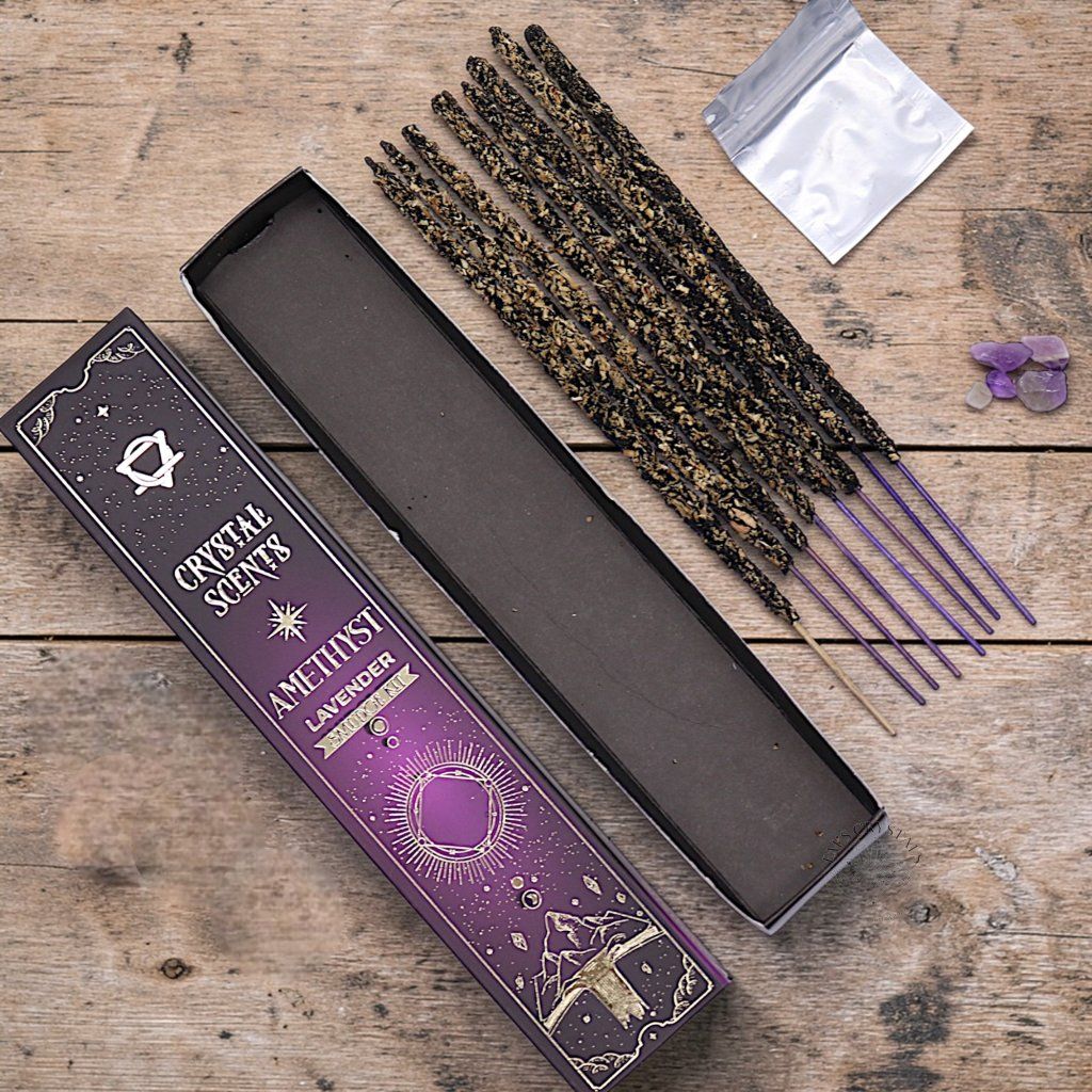 Obsah balení: 10 ručně vyrobených vonných tyčinek a mini surový krystal ametystu.