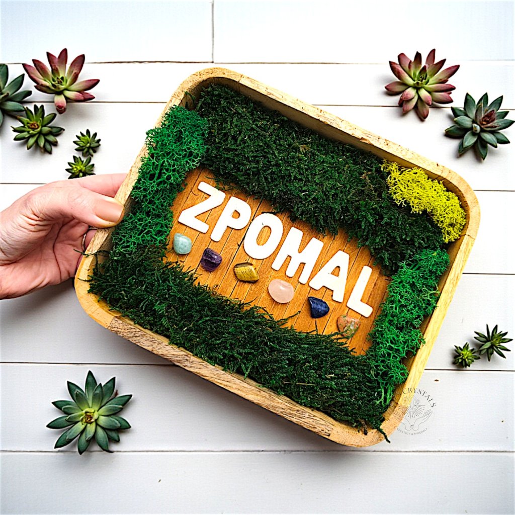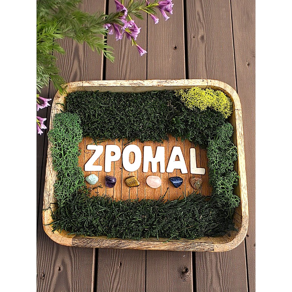 Zpomal je symbolická dekorace, která připomíná, že není kam spěchat. Vytváří malý prostor pro zastavení, nadechnutí a návrat k přítomnému okamžiku. Kombinace přírodního dřeva, mechu a minerálů podporuje atmosféru klidu, stability a vnitřní rovnováhy.